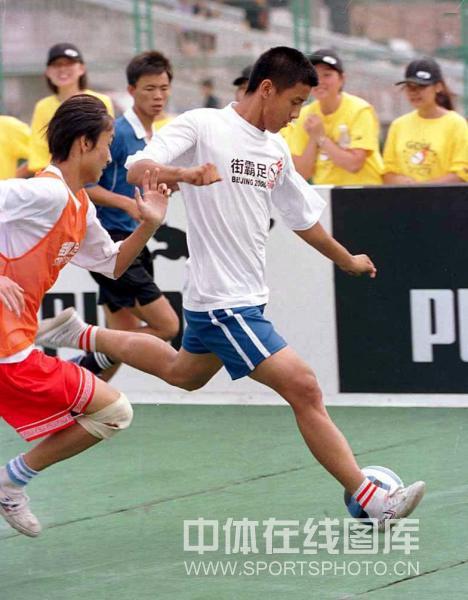 2000年“彪马”街霸足球赛总决赛,7月9日在北京东单体育场举行。来自上海、广州、大连、天津、北京等十个城市的代表队参加此次比赛 ,本次比赛的第一名将代表中国参加今年8月在马来西亚举行的世界“彪马”街霸足球赛。这是首场比赛中,天津体校队队员(白)突破了北京队的防线,直逼球门。 (中体在线图片 刘亚茹 摄)