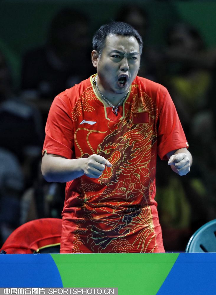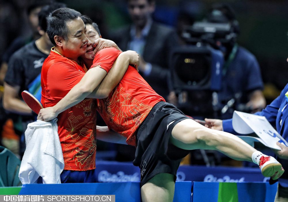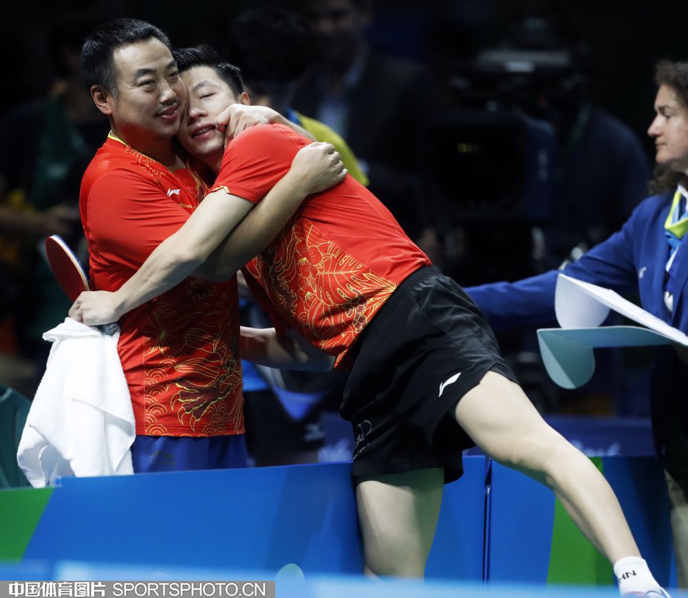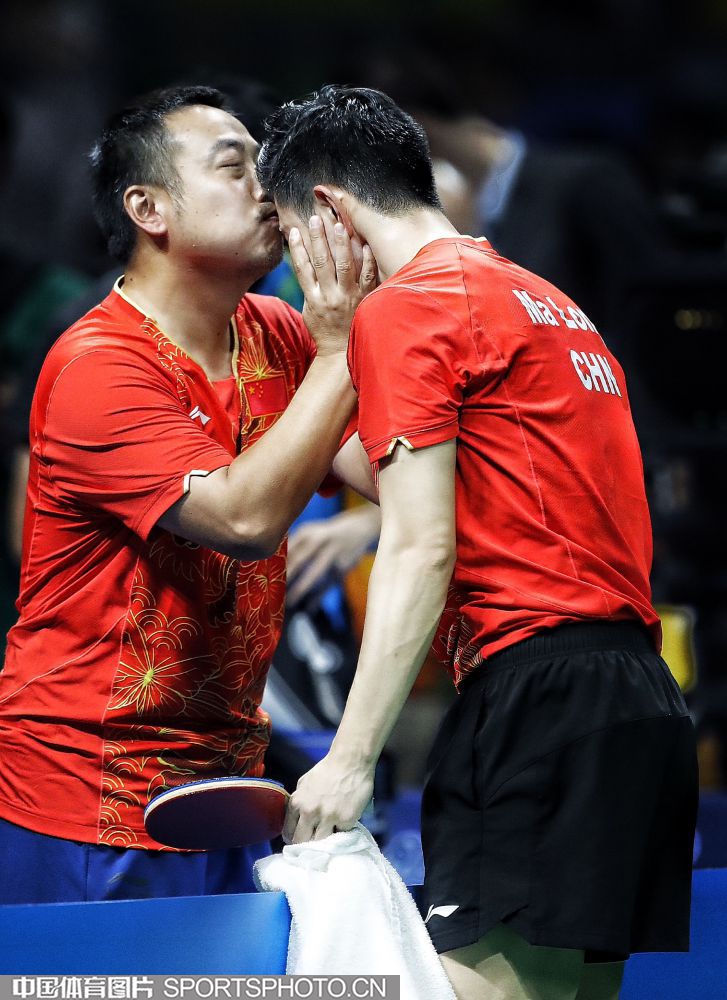 北京时间2016年8月18日,里约奥运乒乓球男团决赛展开争夺,中国队对阵日本队。图为刘国梁亲吻马龙。(中国体育图片 魏征 摄)
