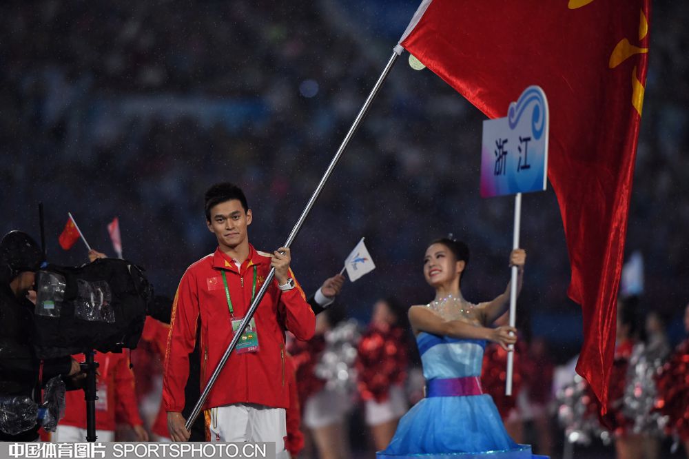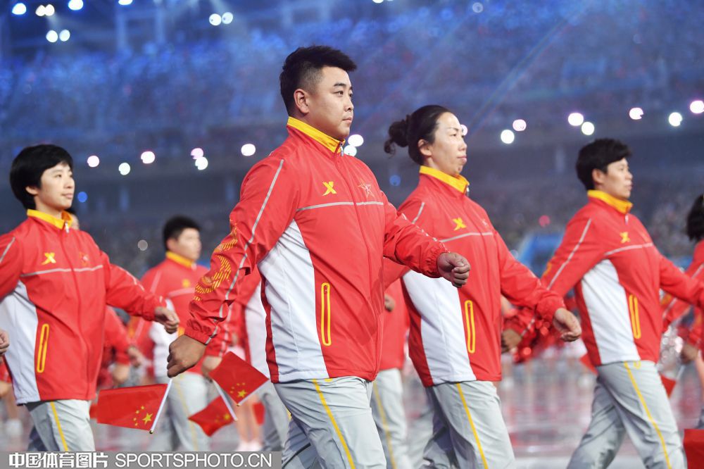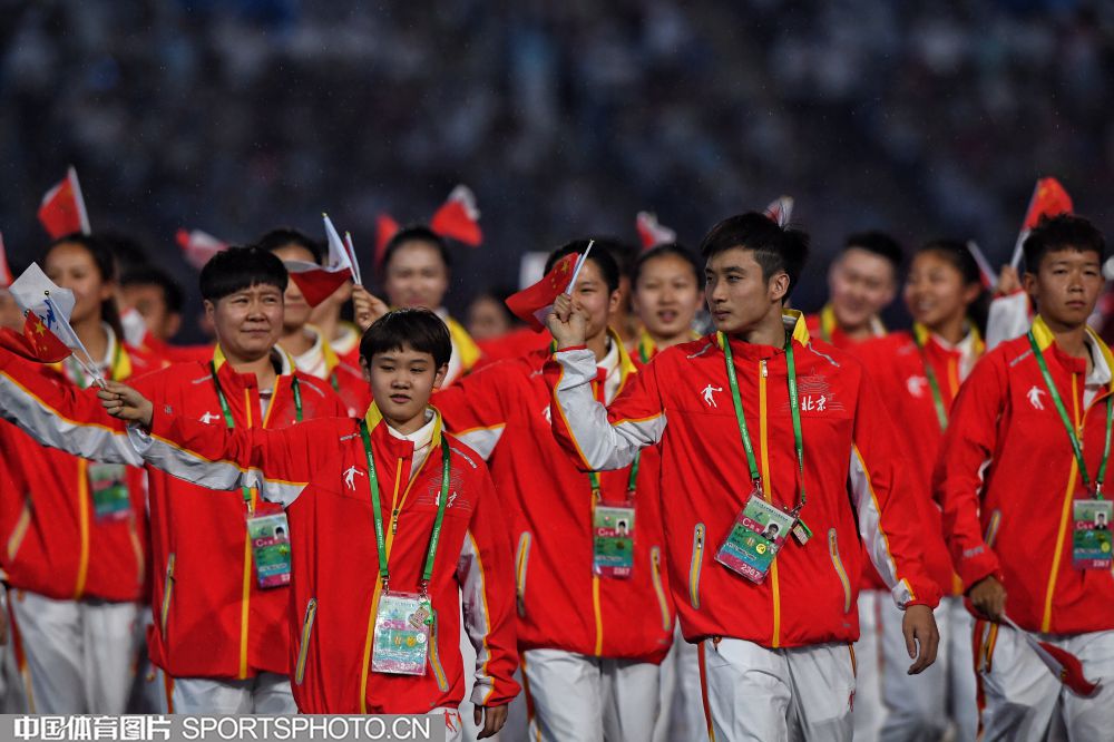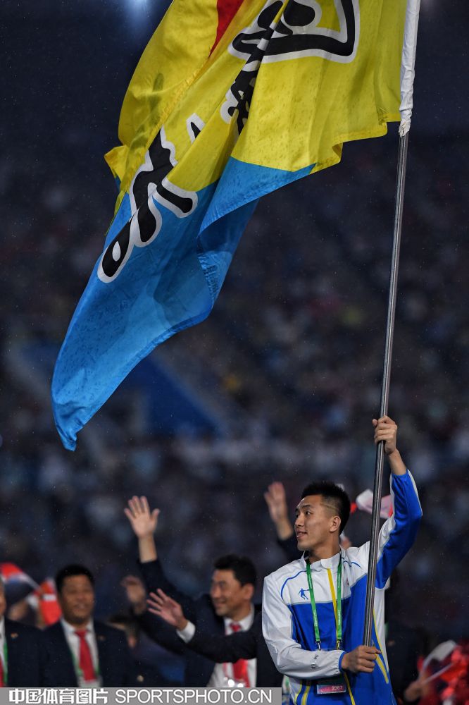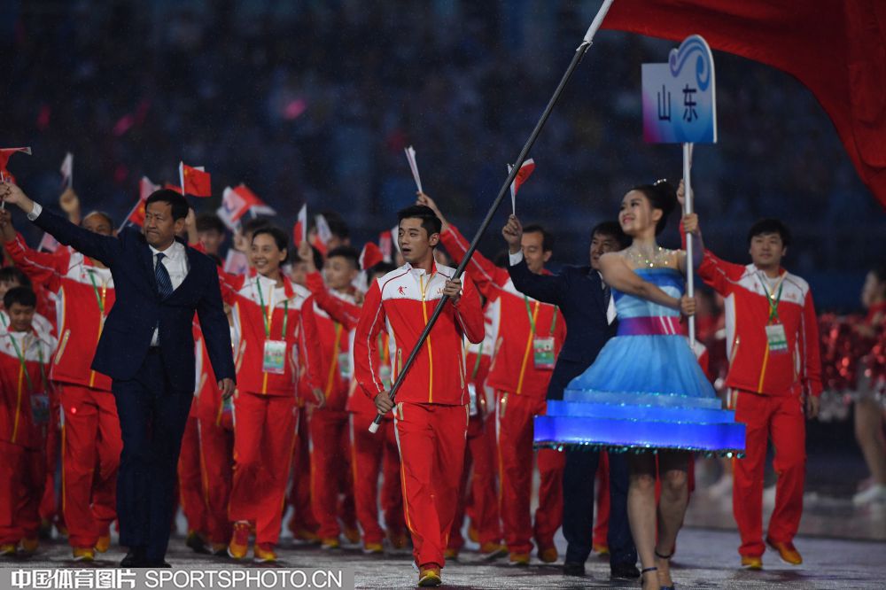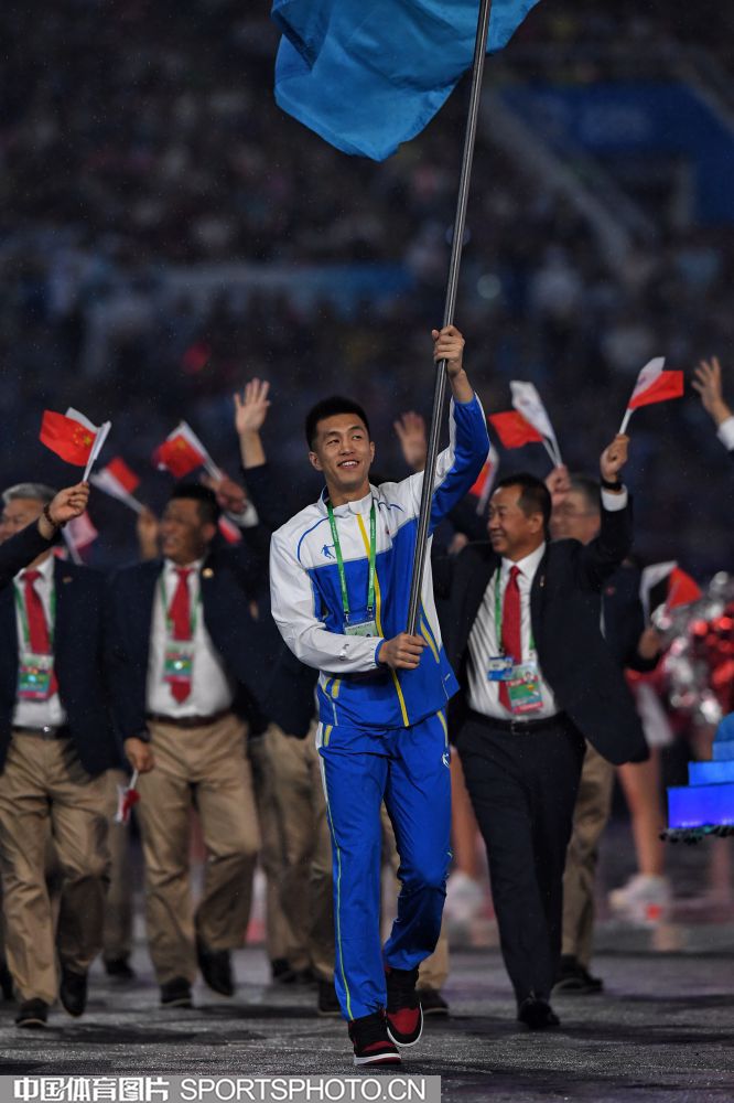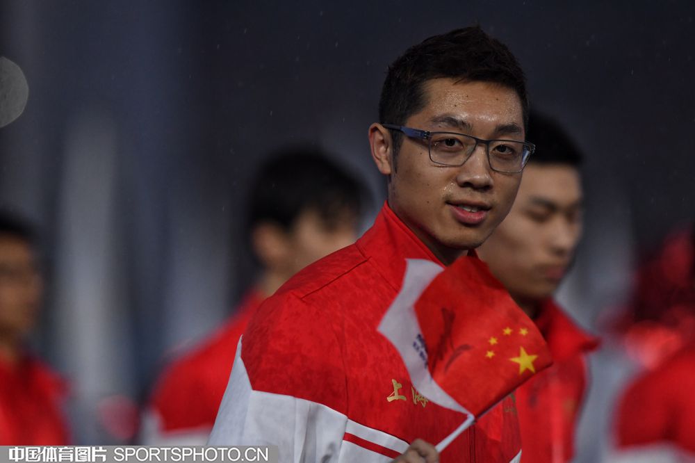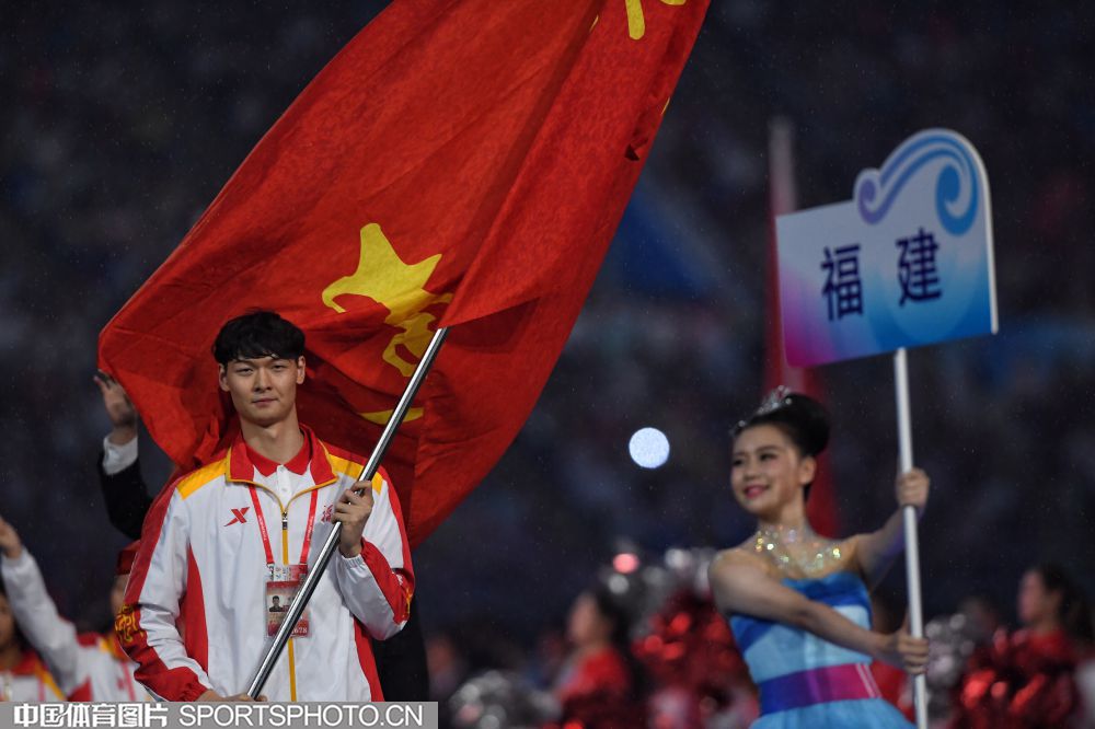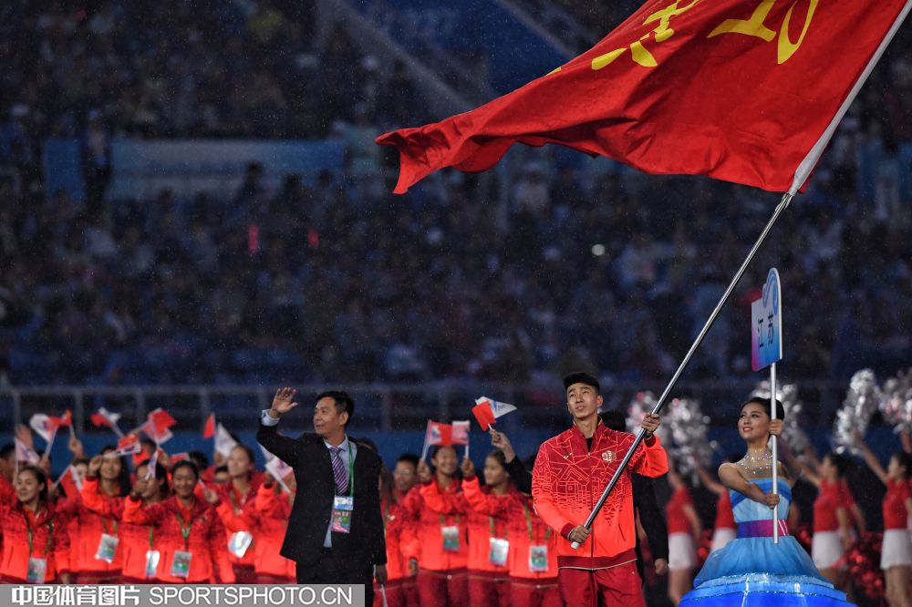 2017年8月27日晚,中华人民共和国第十三届运动会开幕式在天津奥林匹克中心体育场隆重举行。图为上海代表团成员许昕。 (中国体育图片 安灵均 摄)