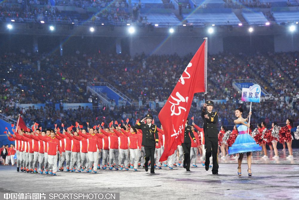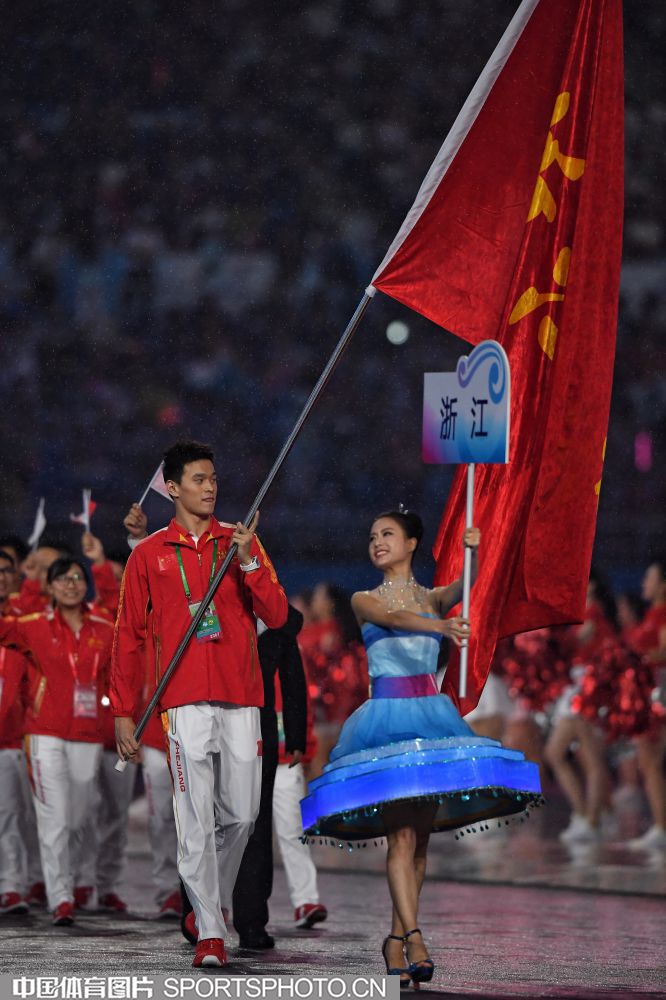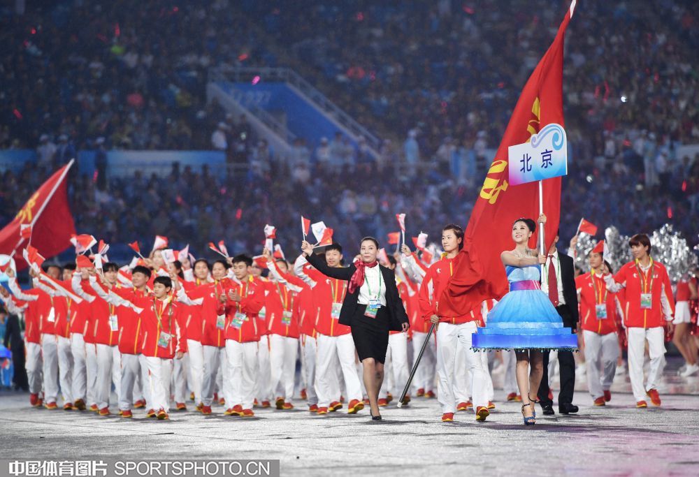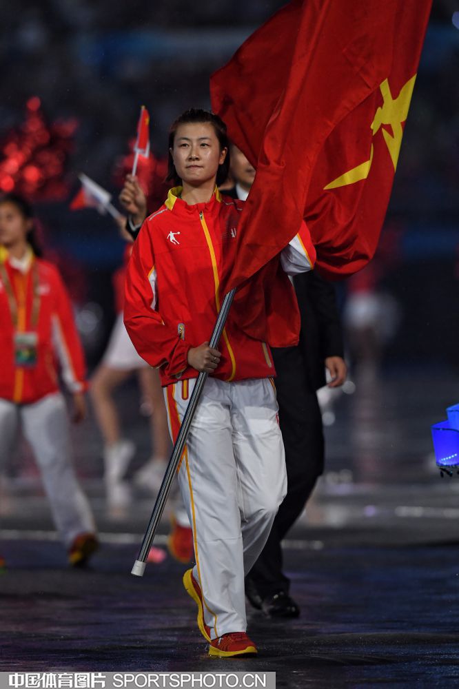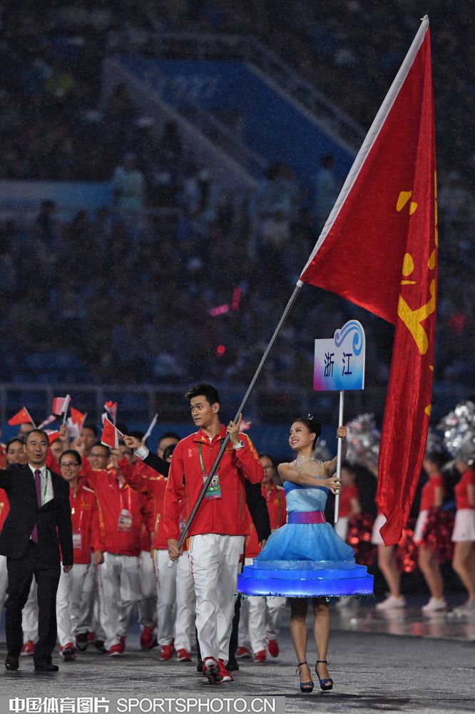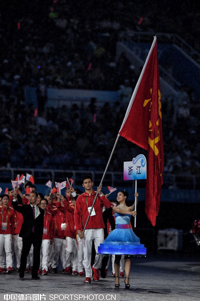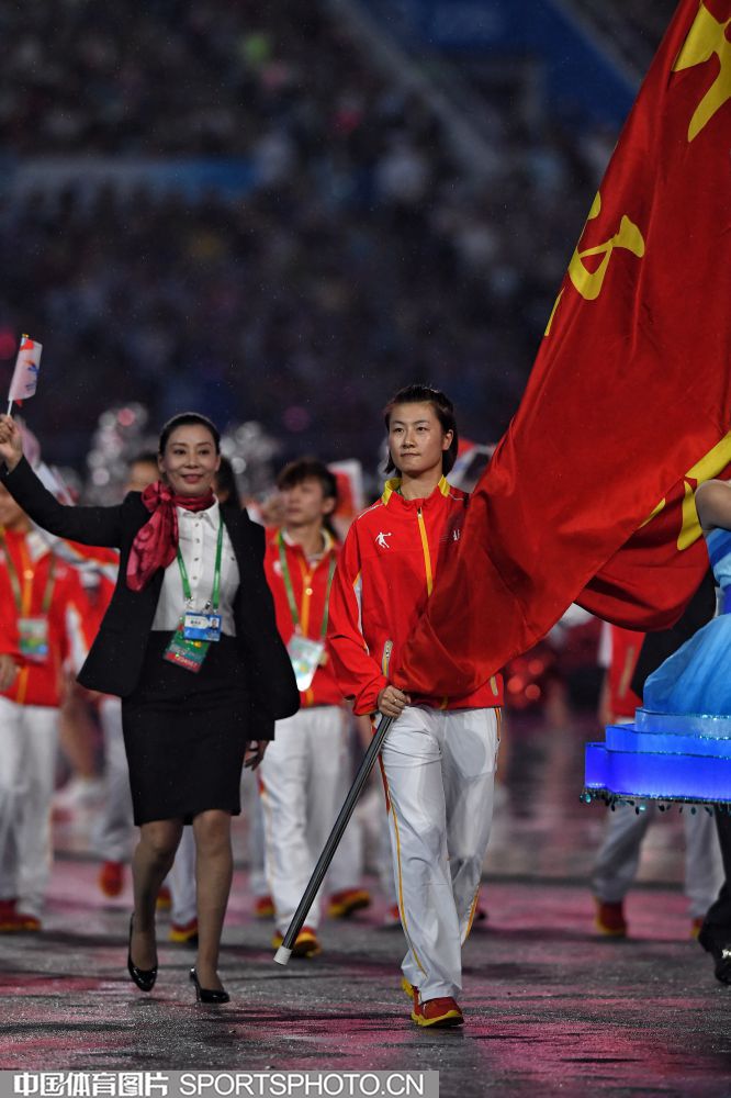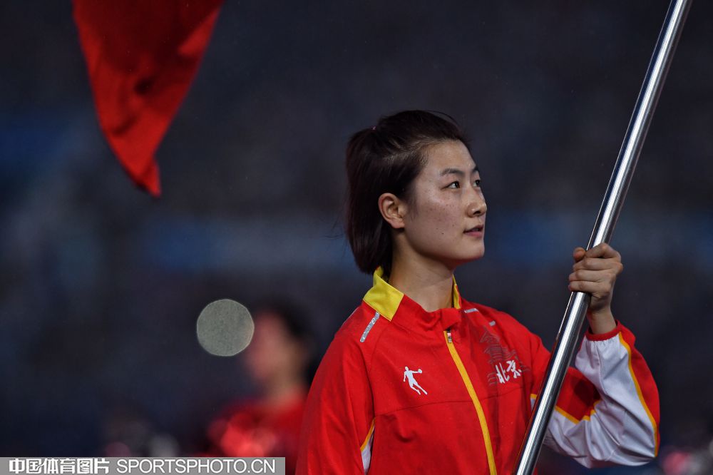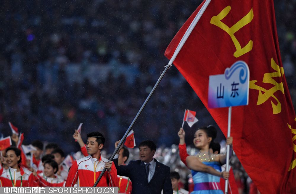 2017年8月27日晚,中华人民共和国第十三届运动会开幕式在天津奥林匹克中心体育场隆重举行。图为上海代表团成员许昕。 (中国体育图片 安灵均 摄)