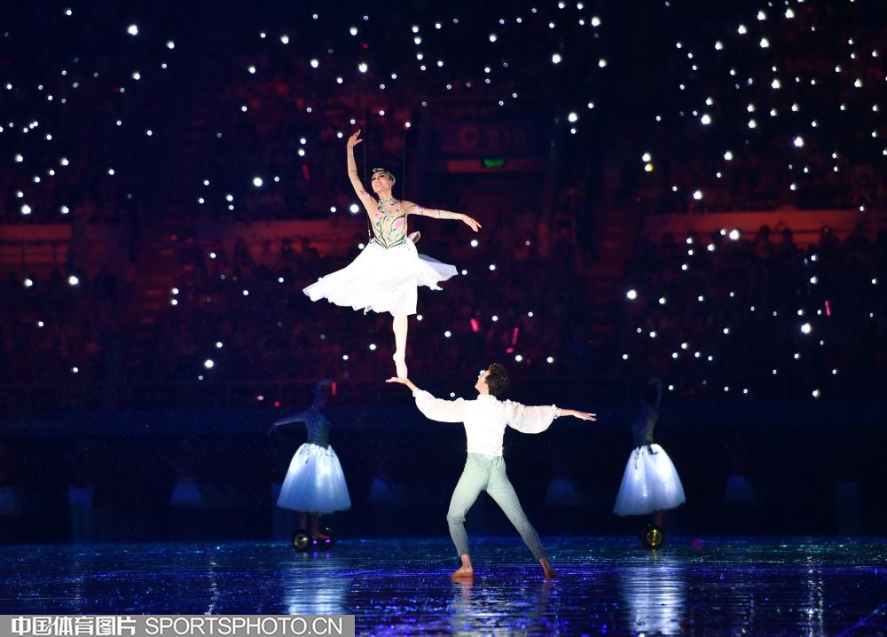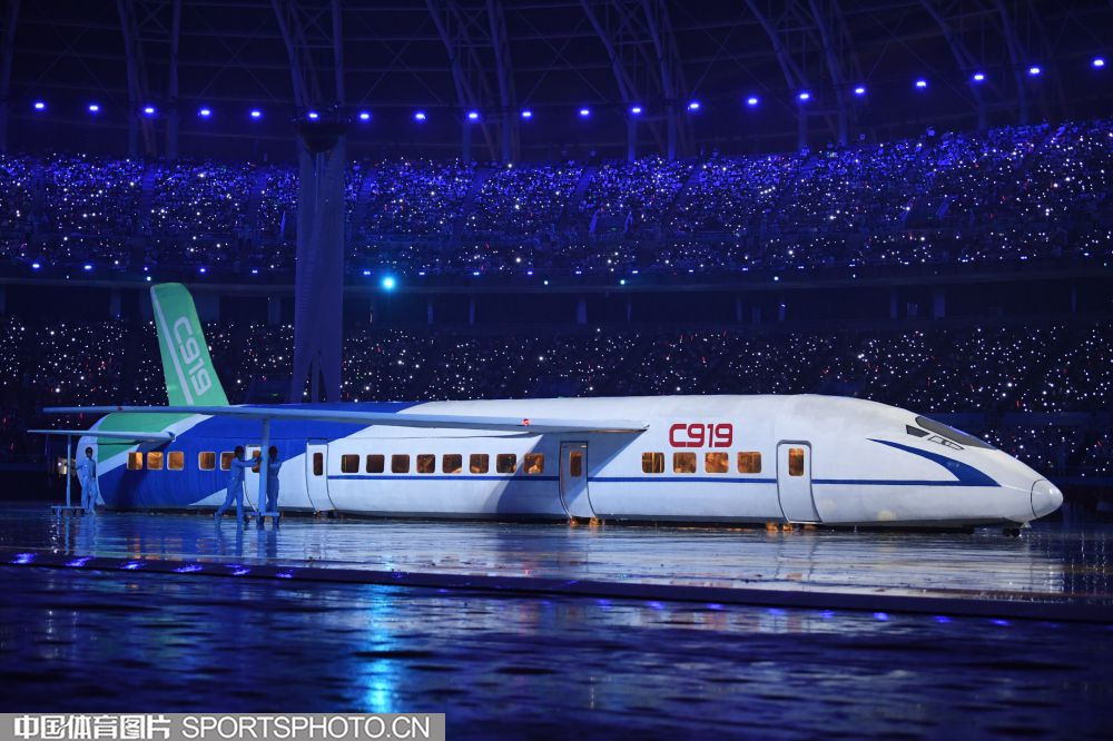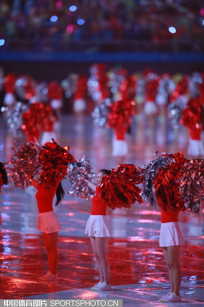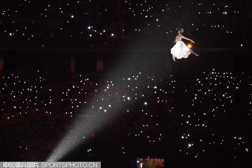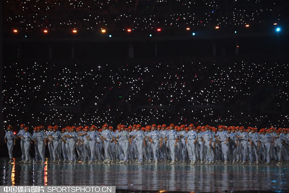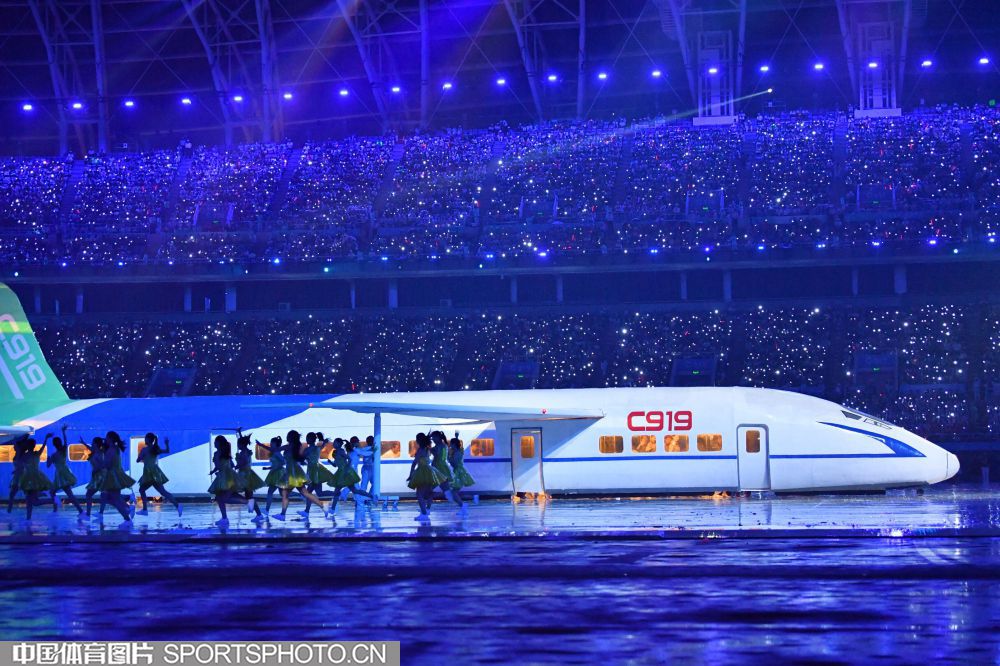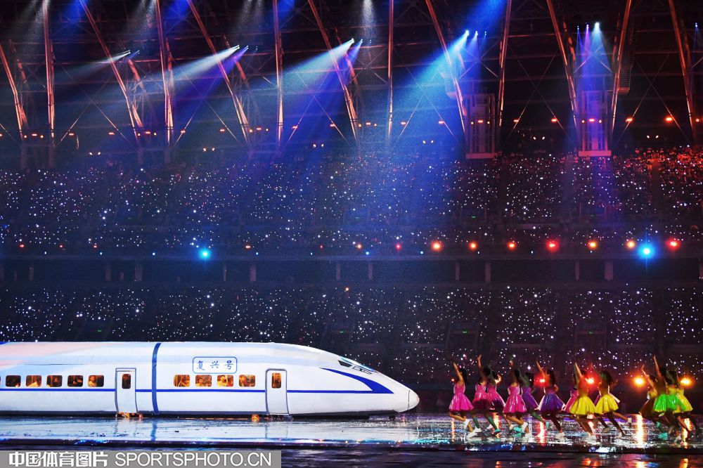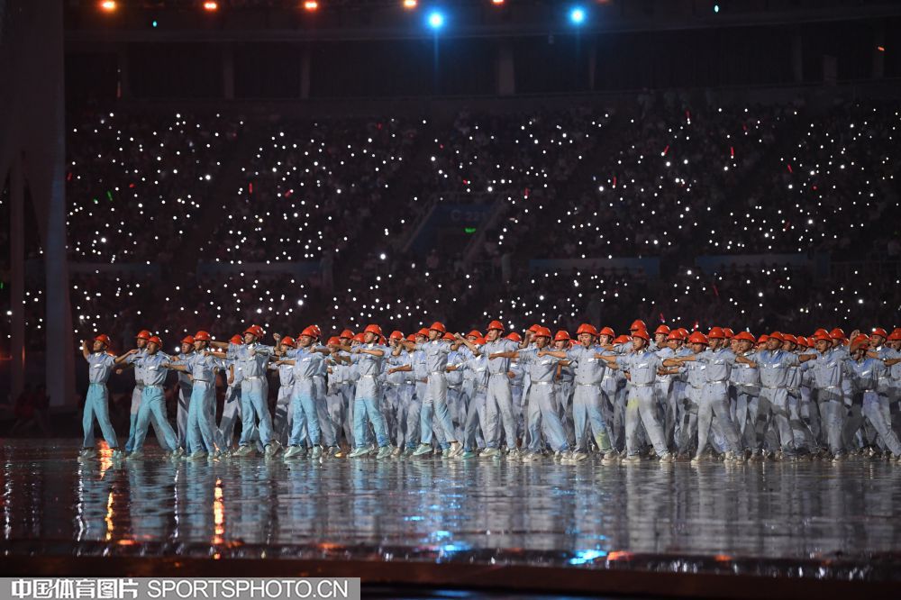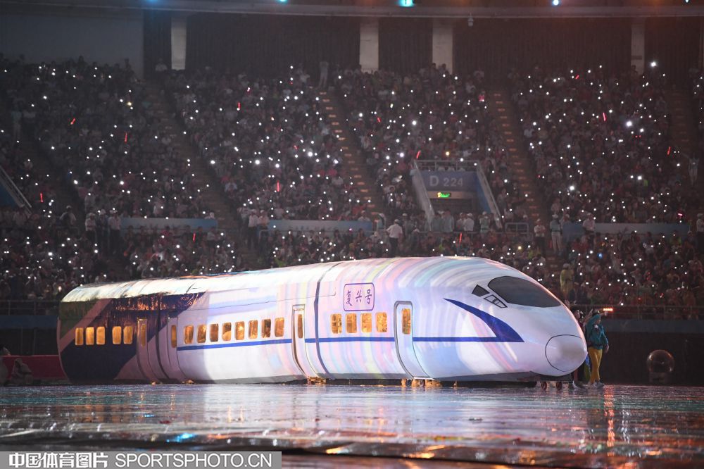 2017年8月27日晚,中华人民共和国第十三届运动会开幕式在天津奥林匹克中心体育场隆重举行。图为开幕式文艺表演《逐梦远航》场景。 (中国体育图片 白宇 摄)