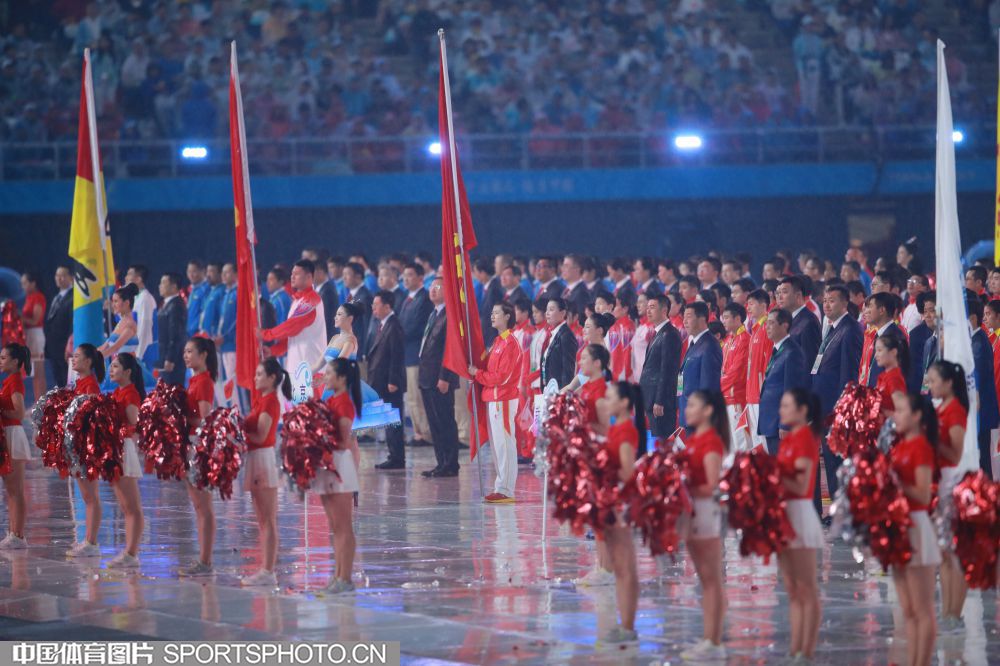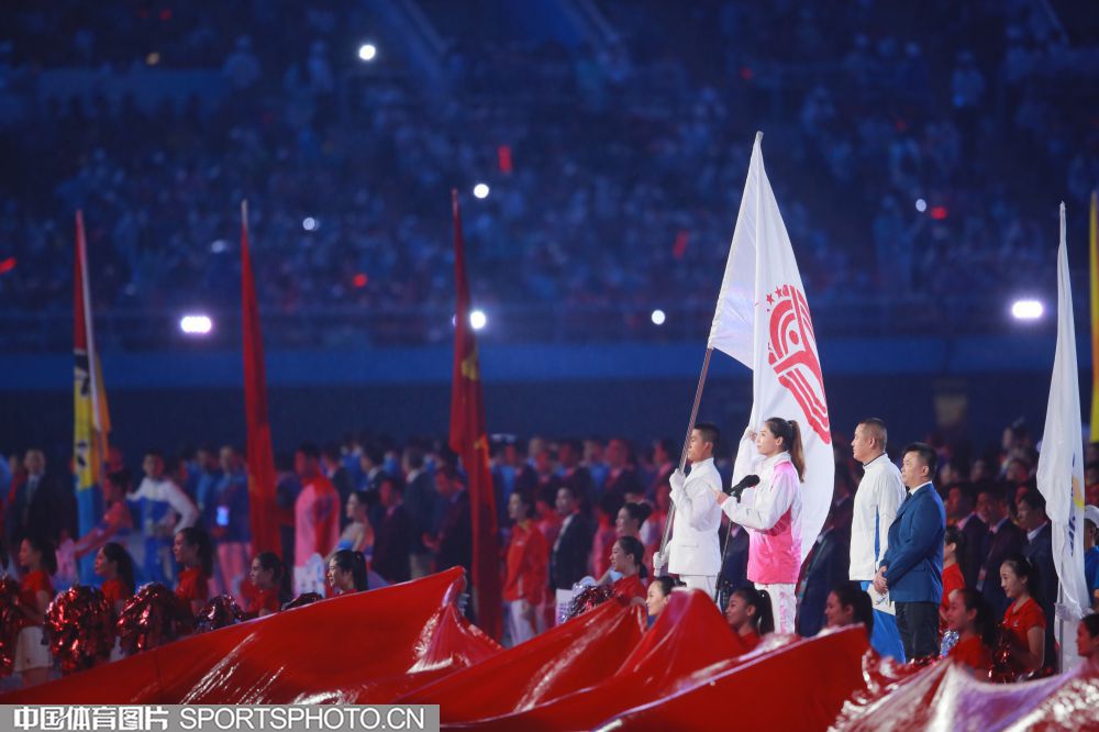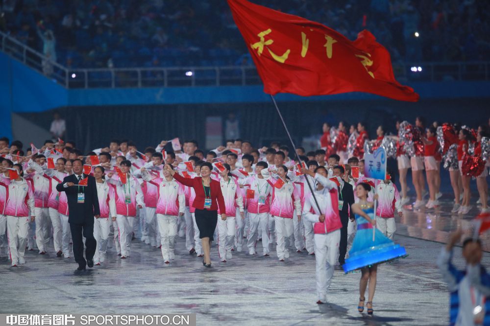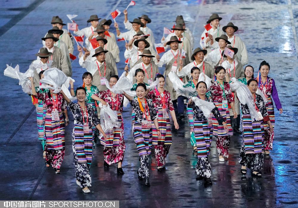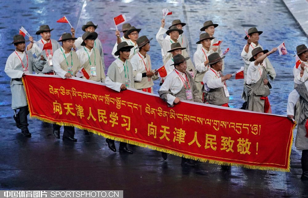 2017年8月27日晚,中华人民共和国第十三届运动会开幕式在天津奥林匹克中心体育场隆重举行。图为西藏自治区代表团入场。 (中国体育图片 魏征 摄)
