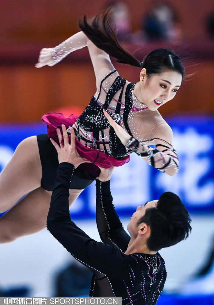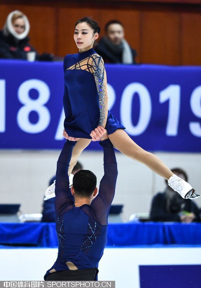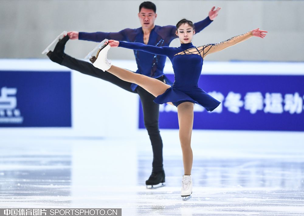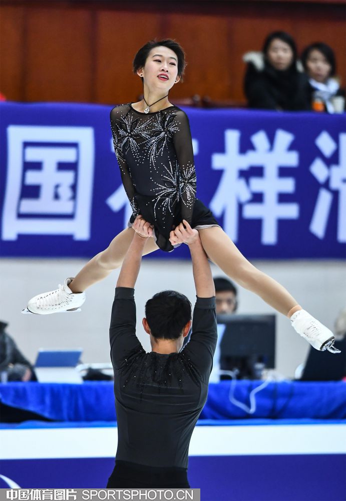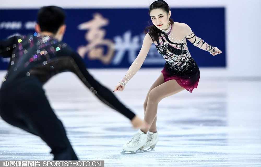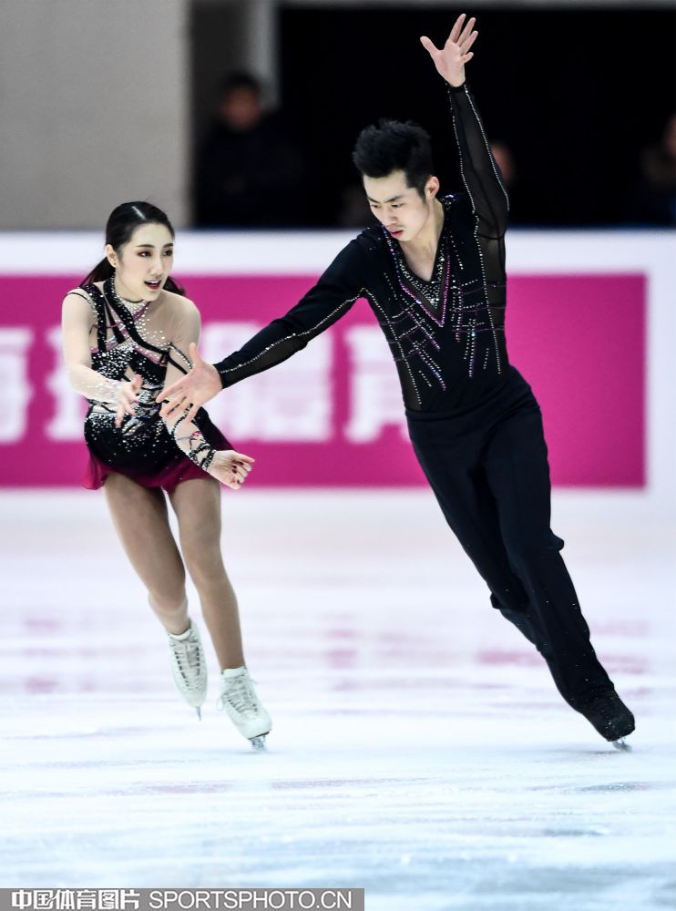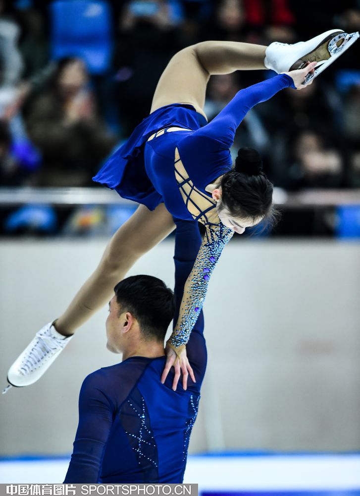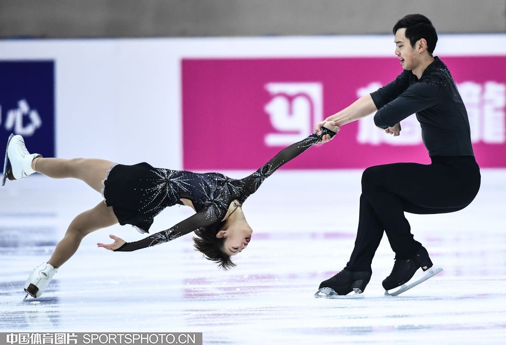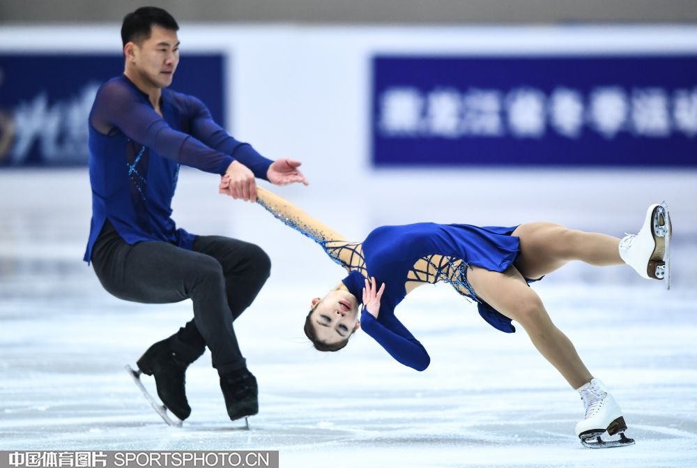 2018年12月29日,2018-2019全国花样滑冰锦标赛在哈尔滨黑龙江省滑冰馆举行,两天的比赛中选手们将争夺男子单人滑、女子单人滑、双人滑和冰上舞蹈的各项名次。隋文静/韩聪、彭程/金杨、王雪涵/王磊分别获得双人滑短节目的前三名。图为王雪涵/王磊在双人滑短节目比赛中。(中国体育图片 安灵均 摄)