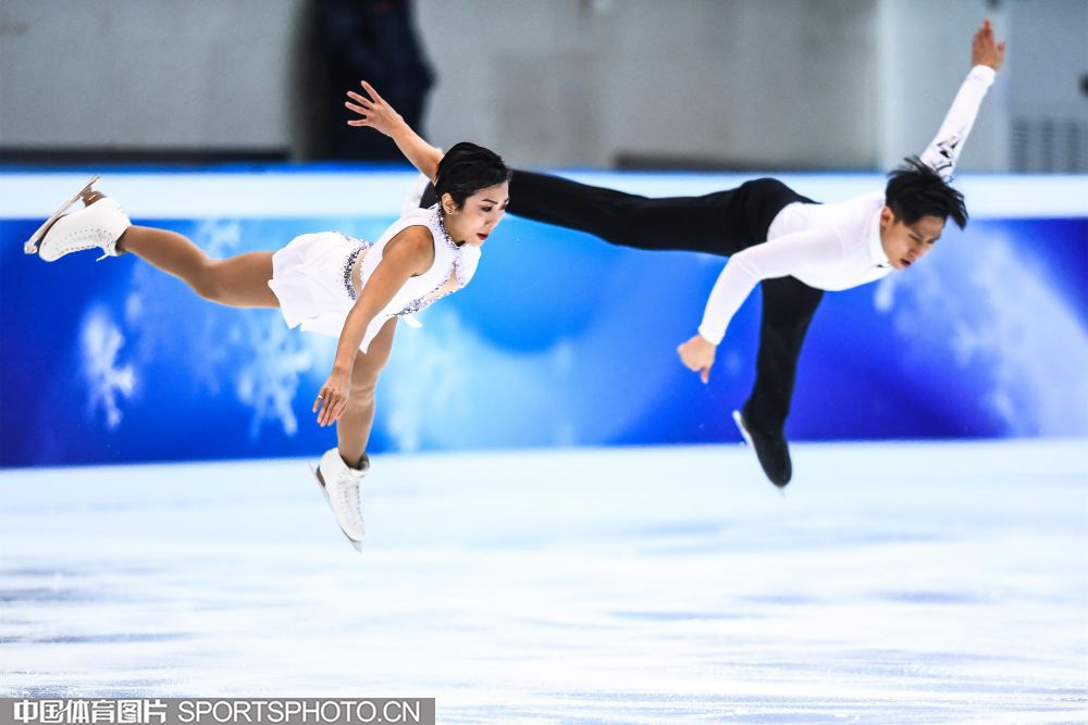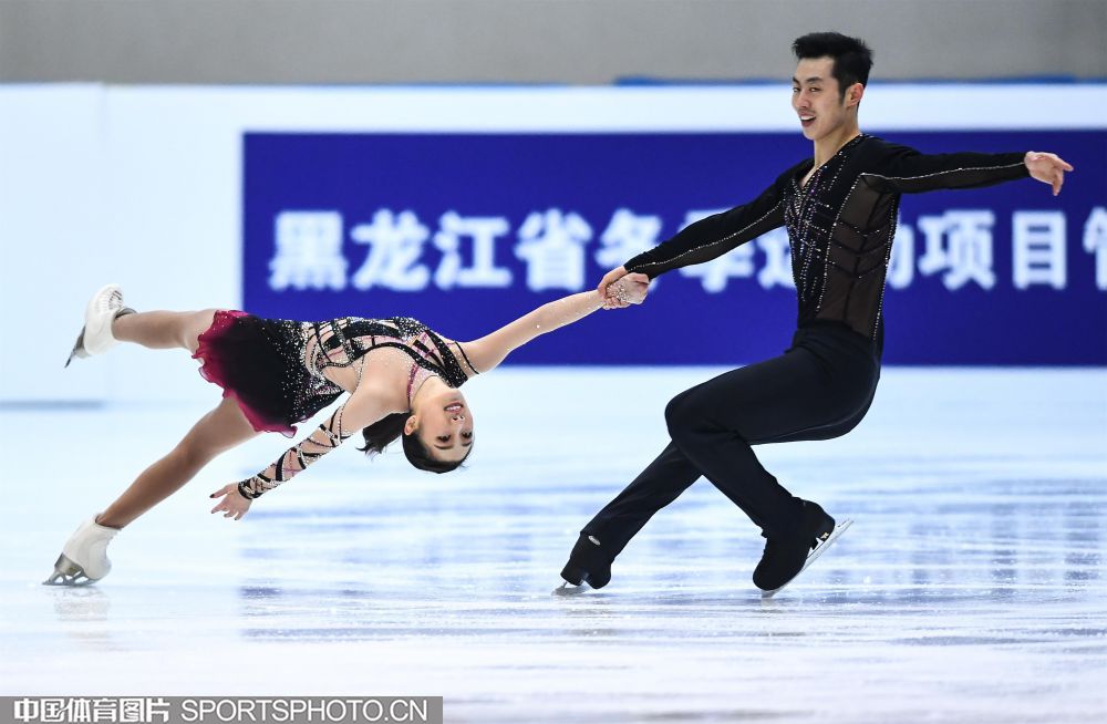 2018年12月29日,2018-2019全国花样滑冰锦标赛在哈尔滨黑龙江省滑冰馆举行,两天的比赛中选手们将争夺男子单人滑、女子单人滑、双人滑和冰上舞蹈的各项名次。隋文静/韩聪、彭程/金杨、王雪涵/王磊分别获得双人滑短节目的前三名。图为隋文静/韩聪在双人滑短节目比赛中。(中国体育图片 安灵均 摄)