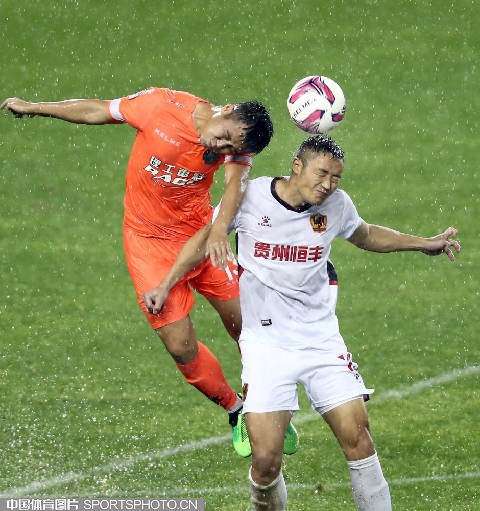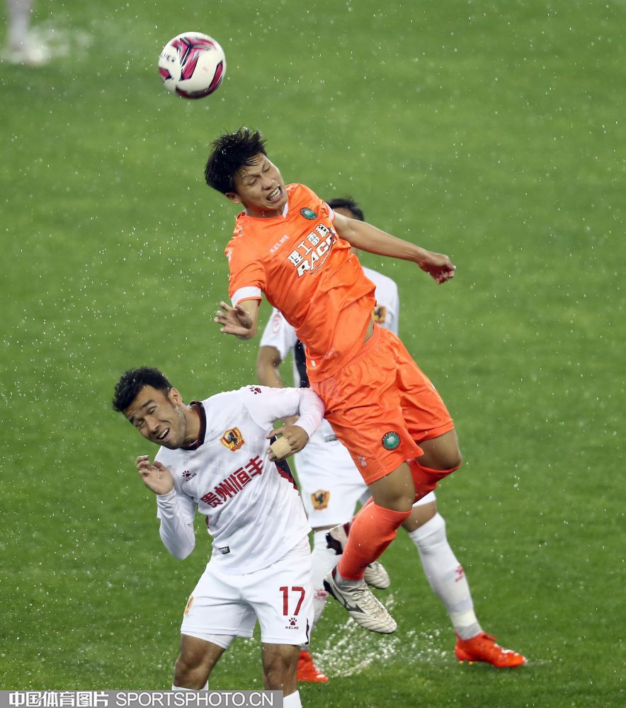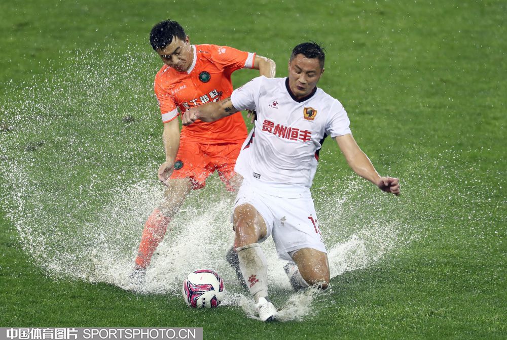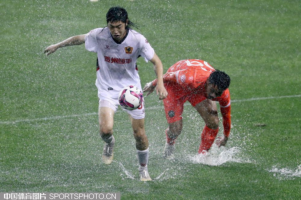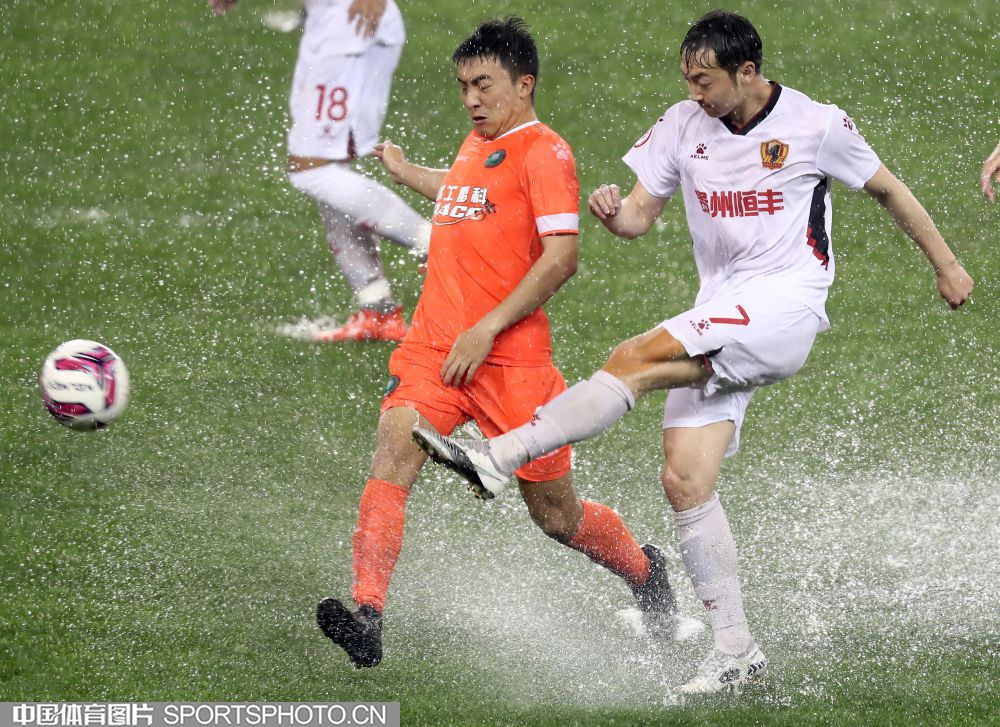 2021年5月15日,2021中国足协甲级联武汉赛区第五轮的一场比赛,在武汉五环体育中心进行。北京理工队(橙衣)以2比0战胜贵州队(白衣),迎来赛季首胜。图为双方队员雨中拼抢。 (中国体育图片 王宪民 摄)