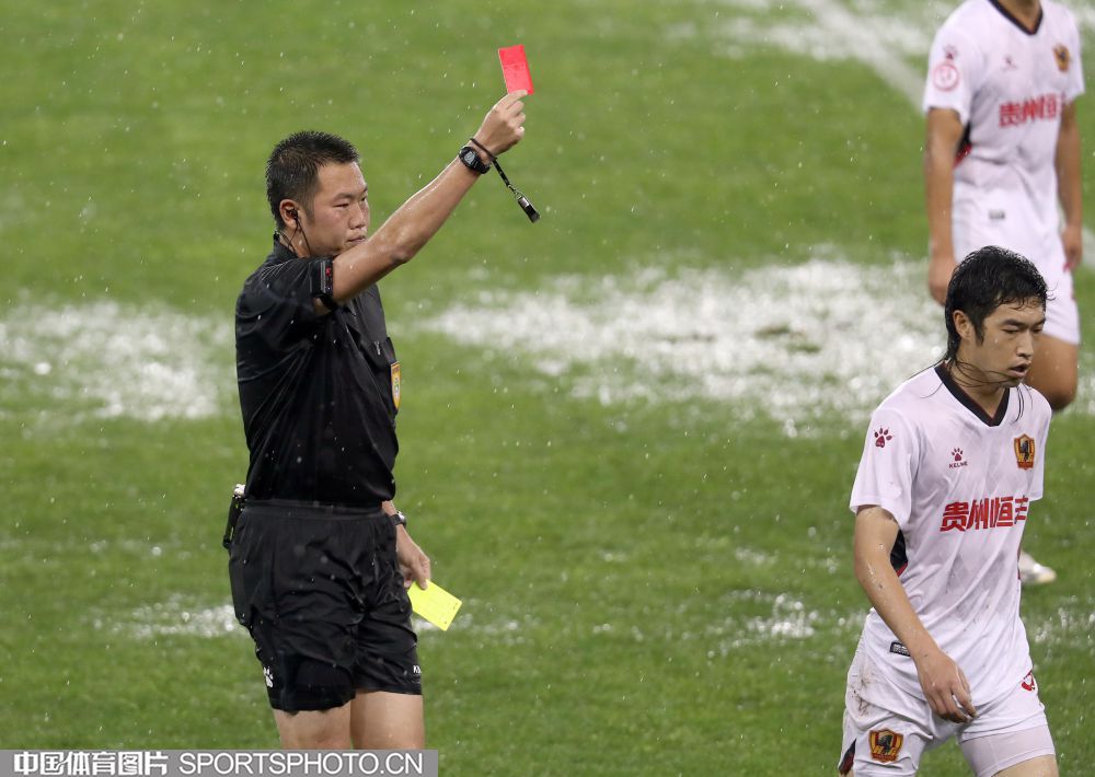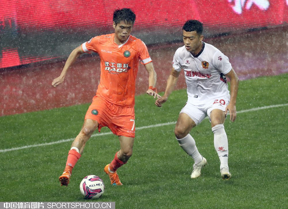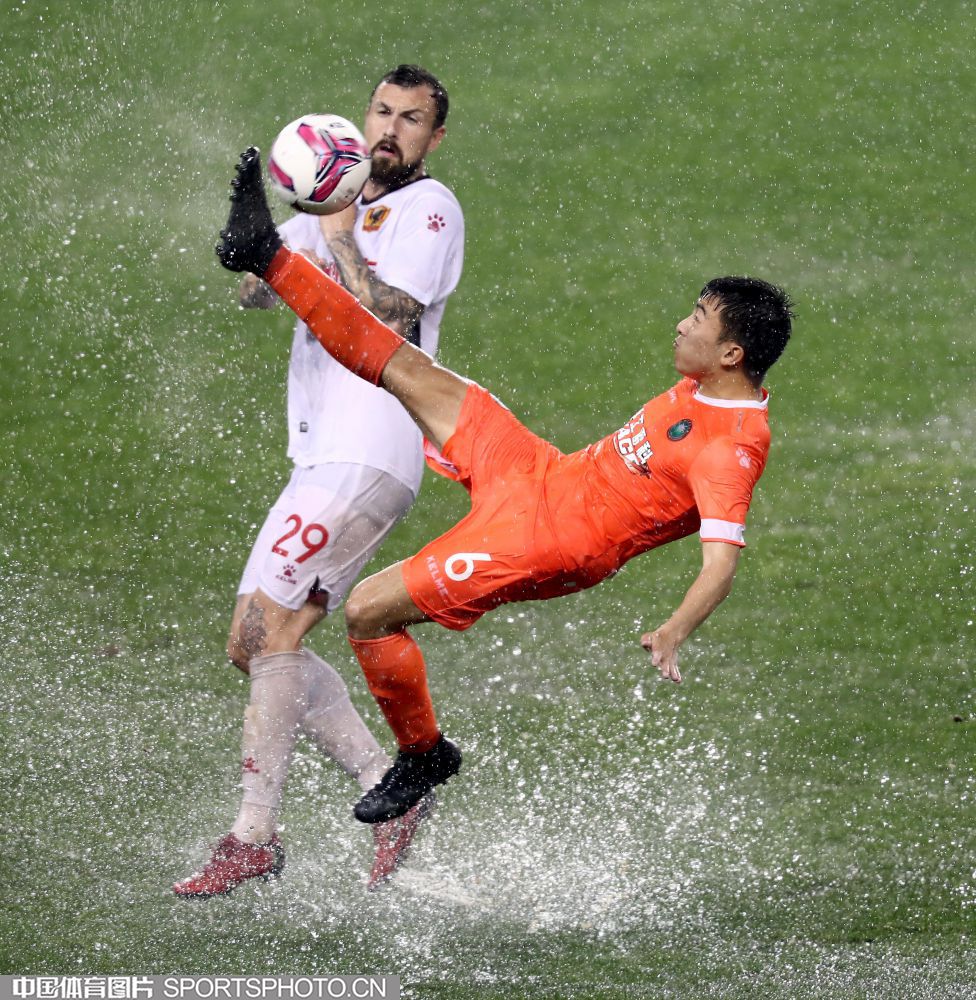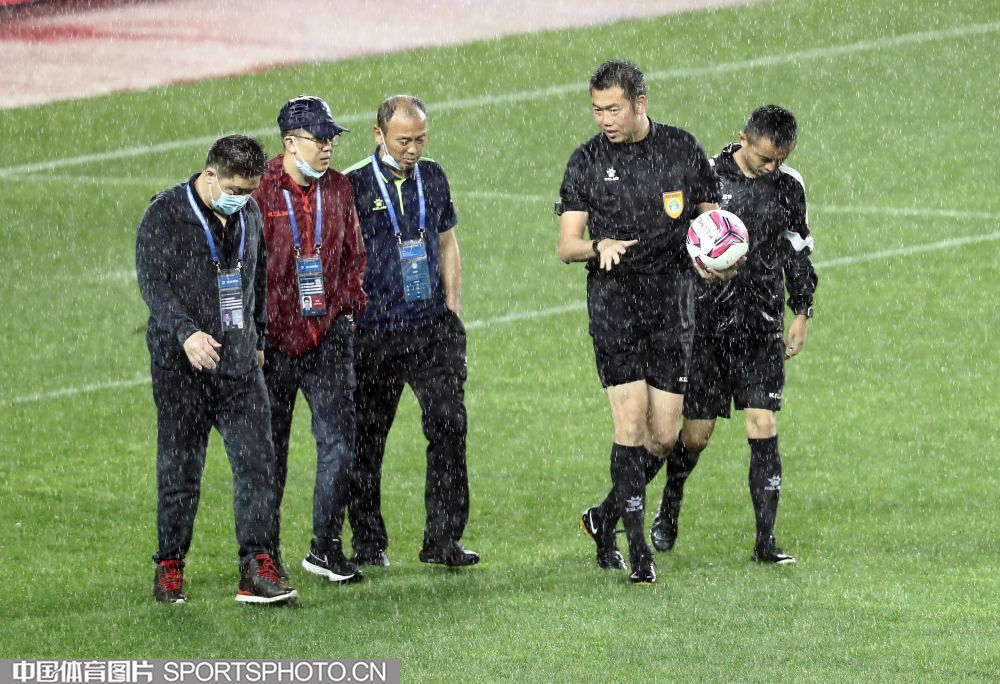 2021年5月15日,2021中国足协甲级联武汉赛区第五轮的一场比赛,在武汉五环体育中心进行。北京理工队(橙衣)以2比0战胜贵州队(白衣),迎来赛季首胜。图为双方队员雨中拼抢。 (中国体育图片 王宪民 摄)