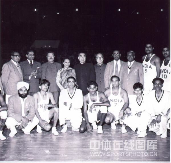 历史资料:1955年印度国家男子排球队访问我国时,周恩来总理(后排左五)、陈毅(后排右五)、贺龙(后排左三)接见印度队全体人员并合影留念。 (中体在线图片 董青 摄)