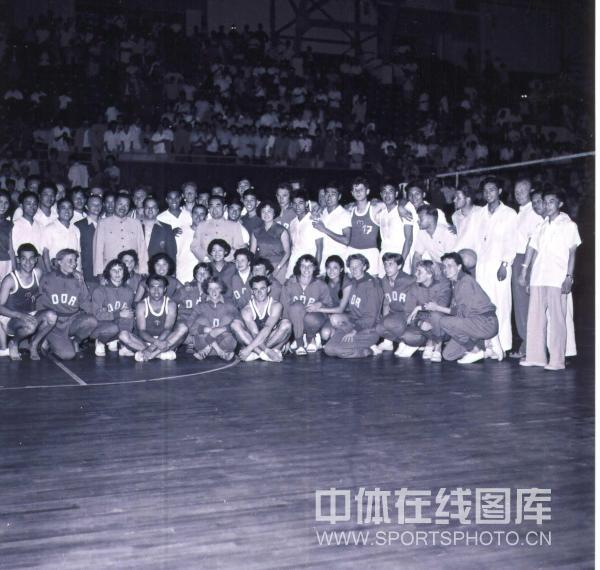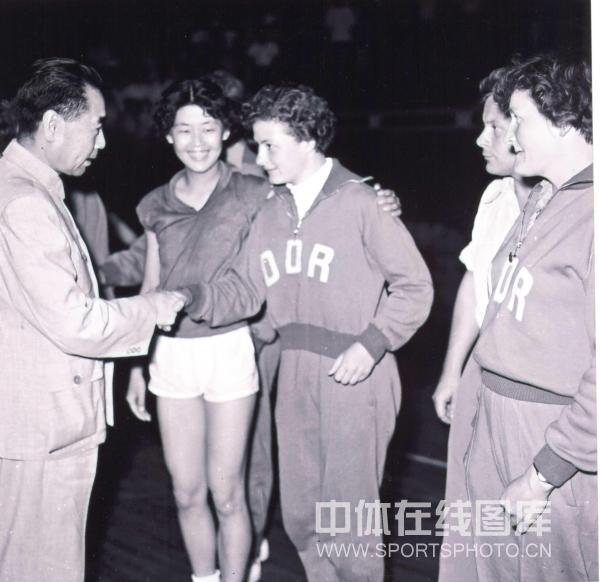 历史资料:1957年,周恩来总理观看中国、民主德国排球比赛。图为赛后周总理与民主德国运动员握手并亲切交谈。 (中体在线图片 钟声 摄)