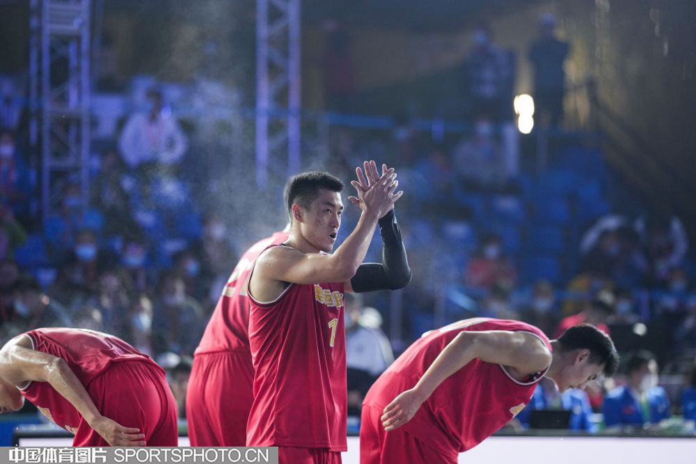 2021年9月26日,第14届全运会三人篮球男子成年组决赛赛在西安城市运动公园举行,奥运联合队(红衣)以21比12战胜广东队(白衣),夺得冠军。图为联合队队员赛后答谢球迷。 (中国体育图片 倪敏哲 摄)