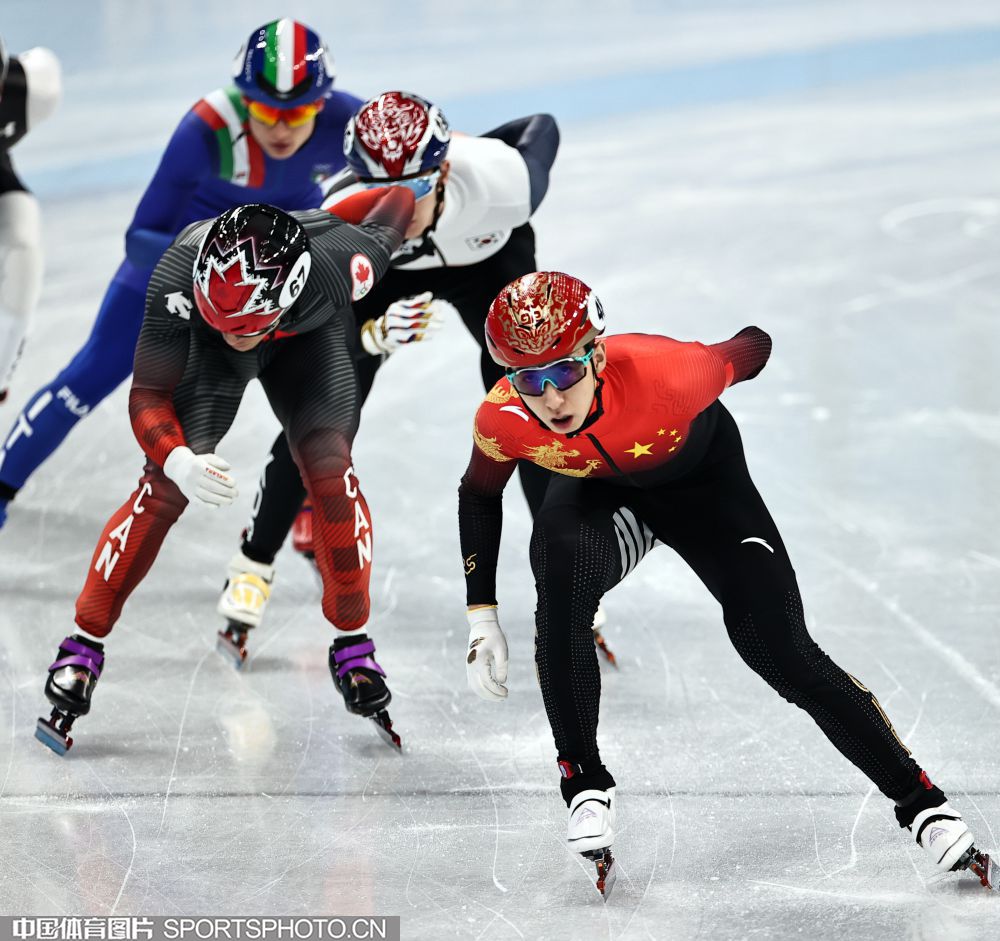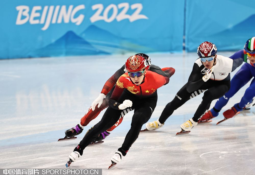 2022年2月7日晚,北京冬奥会短道速滑男子1000米1/4赛在首都体育馆举行,中国选手武大靖位列小组第二名,晋级半决赛。图为武大靖(红衣)在比赛中。 (中国体育图片 王宪民 摄)