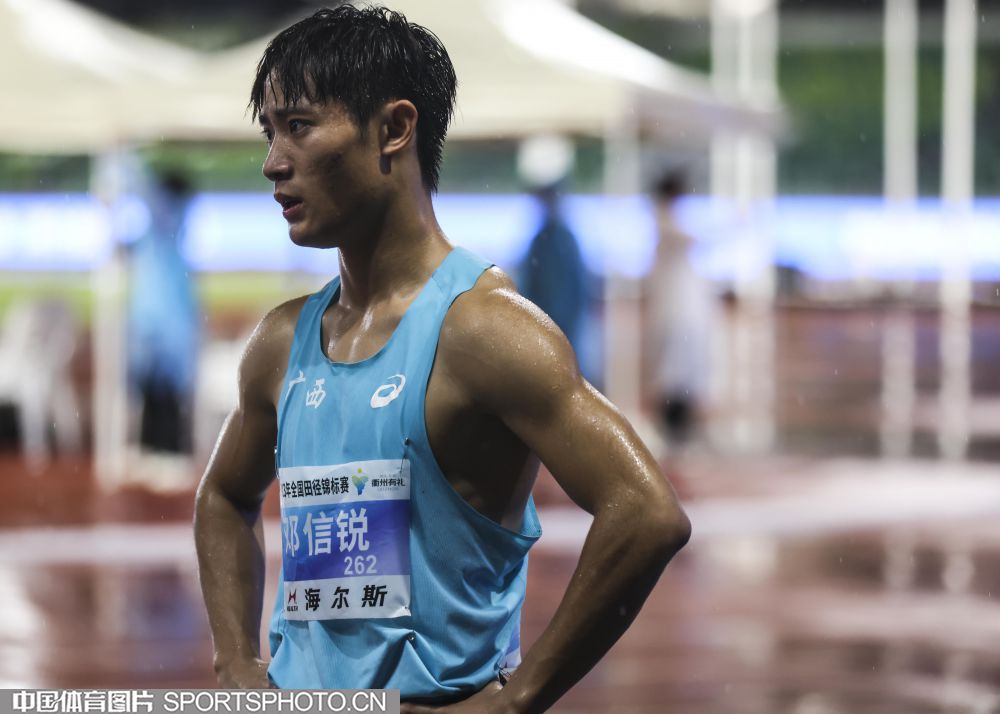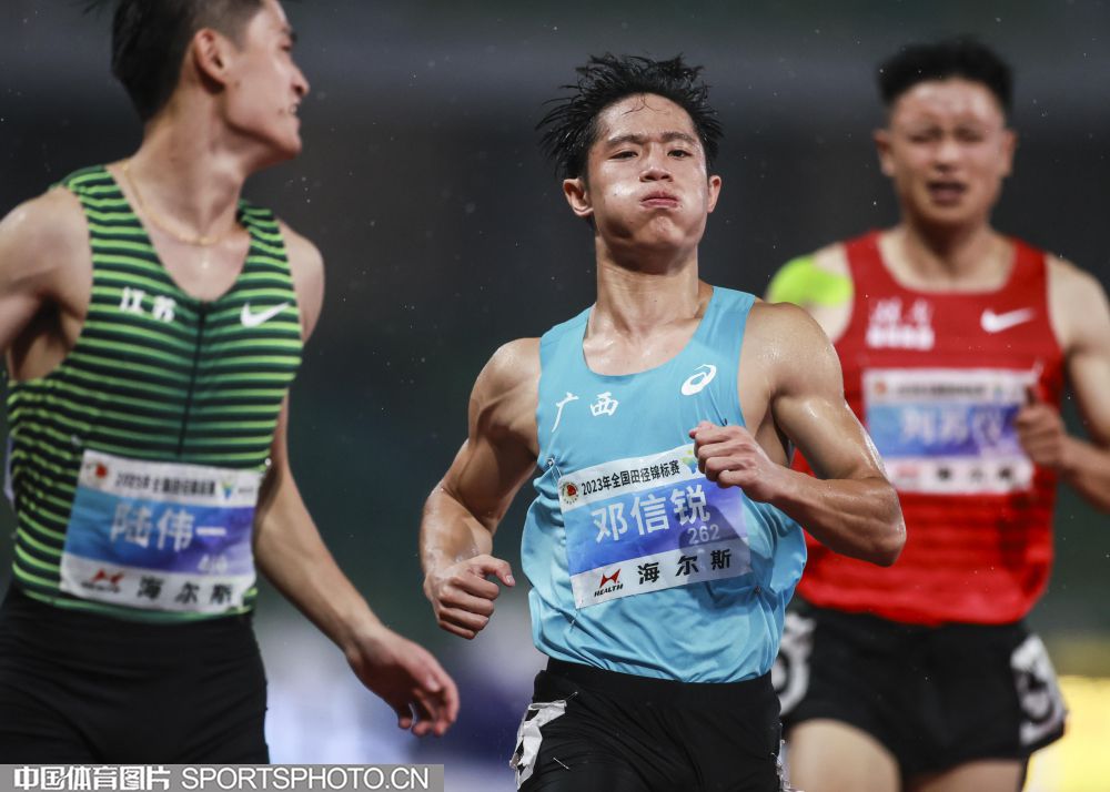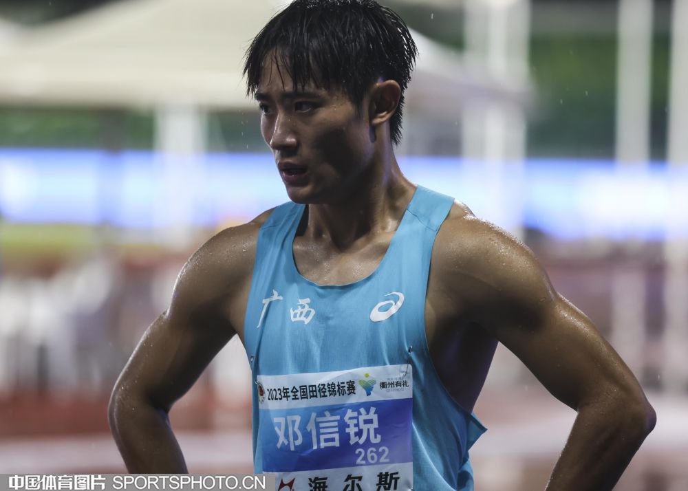 2023年7月21日,2023年全国田径锦标赛在浙江衢州水亭门拉开帷幕。在男子100米决赛中,广西选手邓信锐以10秒23的成绩,获得冠军。图为邓信锐。(中国体育图片 张昕 摄)