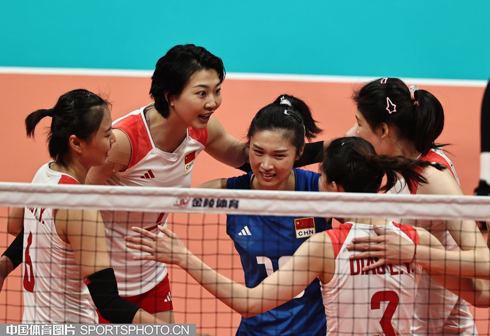 2023年10月5日,杭州亚运会女子排球决赛在杭州师范大学(仓前校区)体育馆进行。中国队3比0击败日本队,获得金牌。图为中国队队员庆祝得分。(中国体育图片 王宪民 摄)