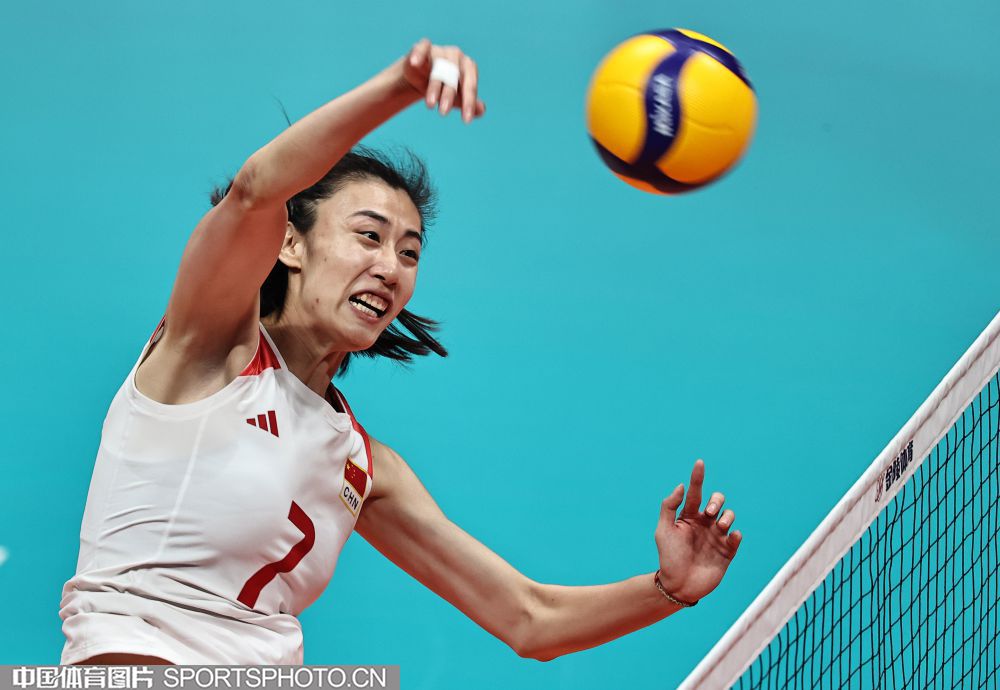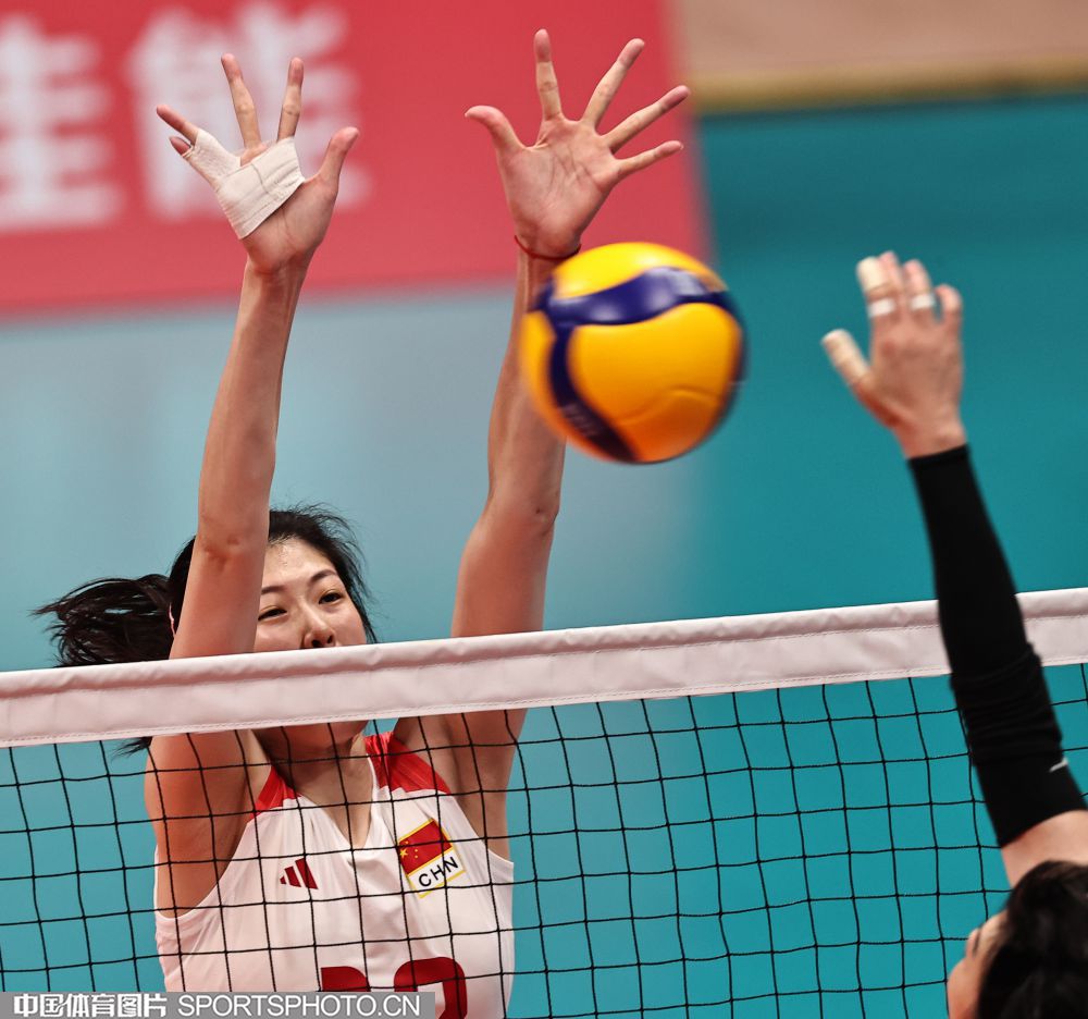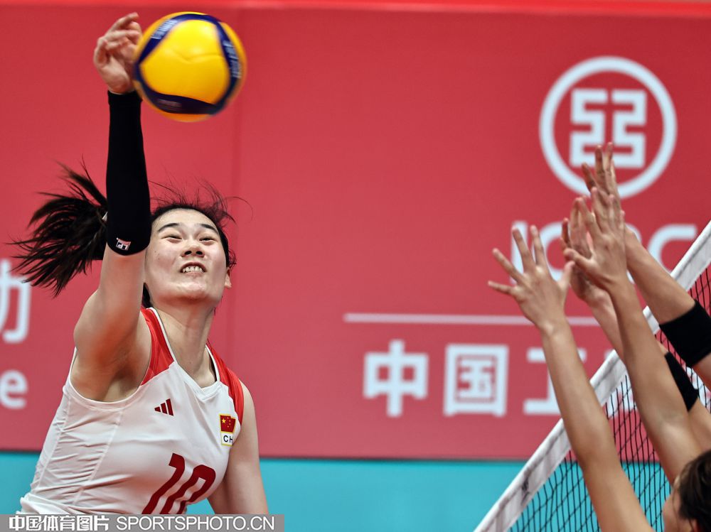 2023年10月5日,杭州亚运会女子排球决赛在杭州师范大学(仓前校区)体育馆进行。中国队3比0击败日本队,获得金牌。图为中国队队员庆祝得分。(中国体育图片 王宪民 摄)