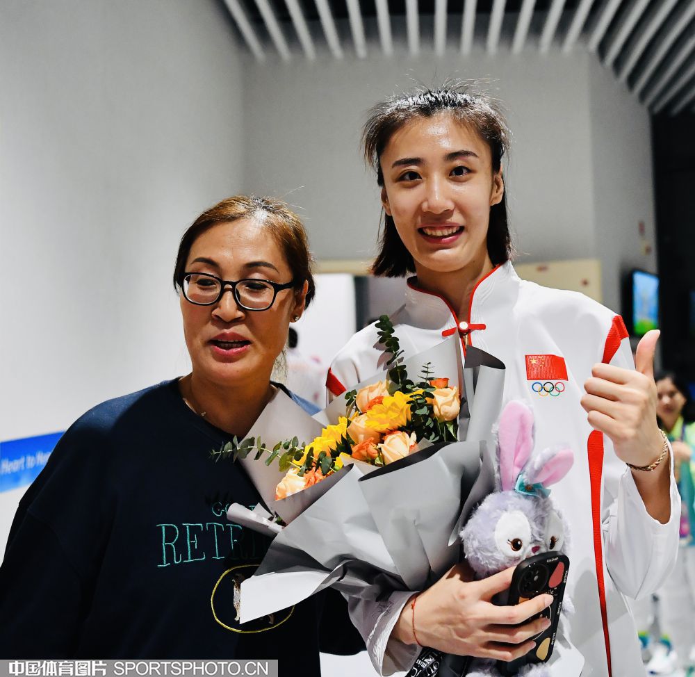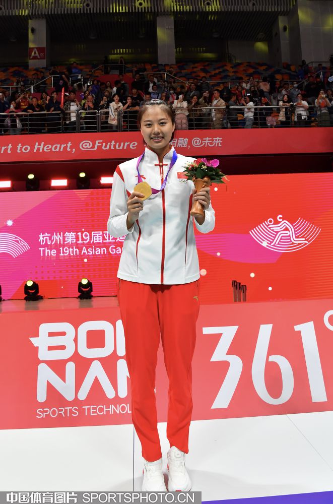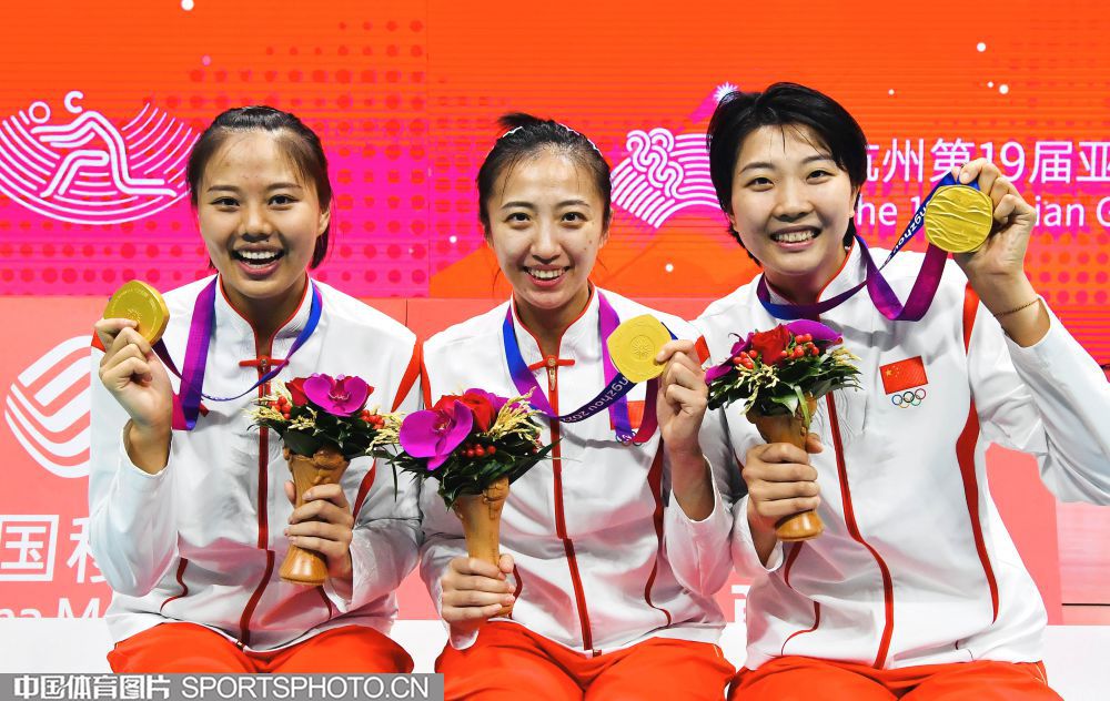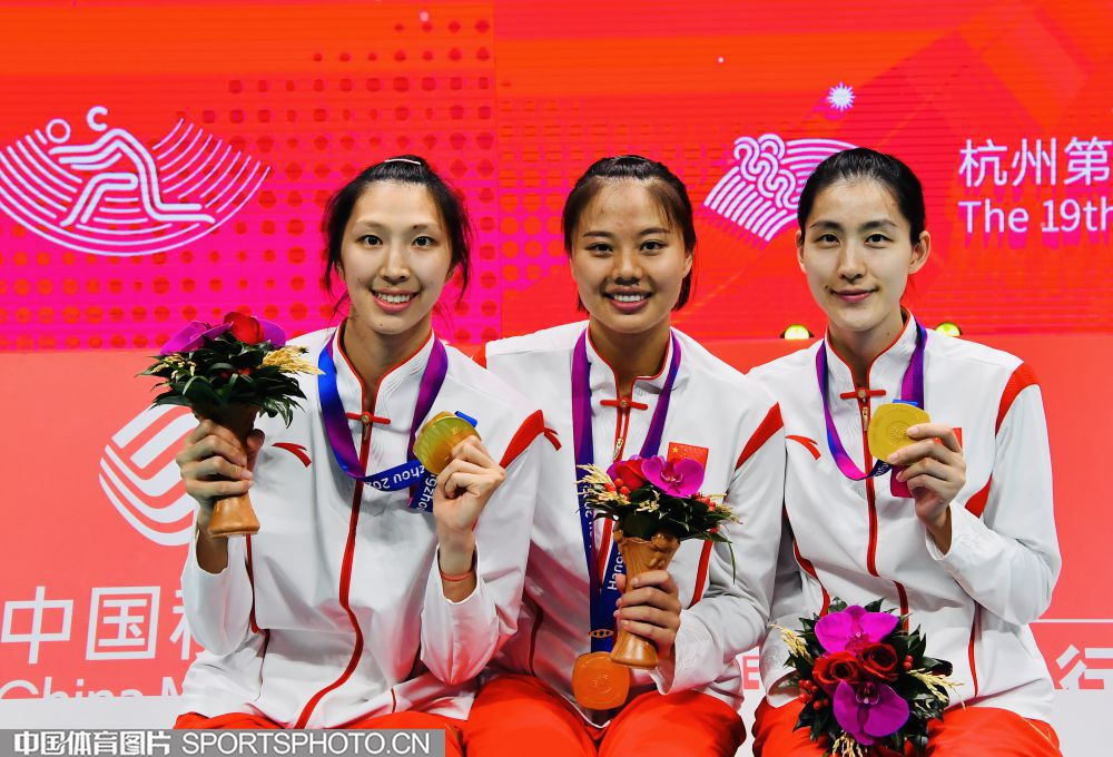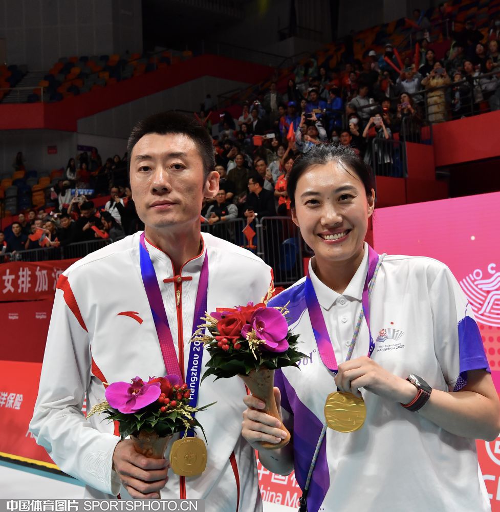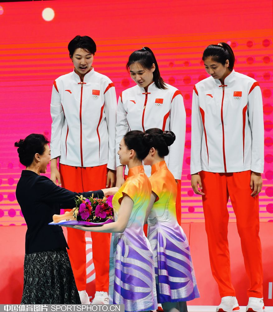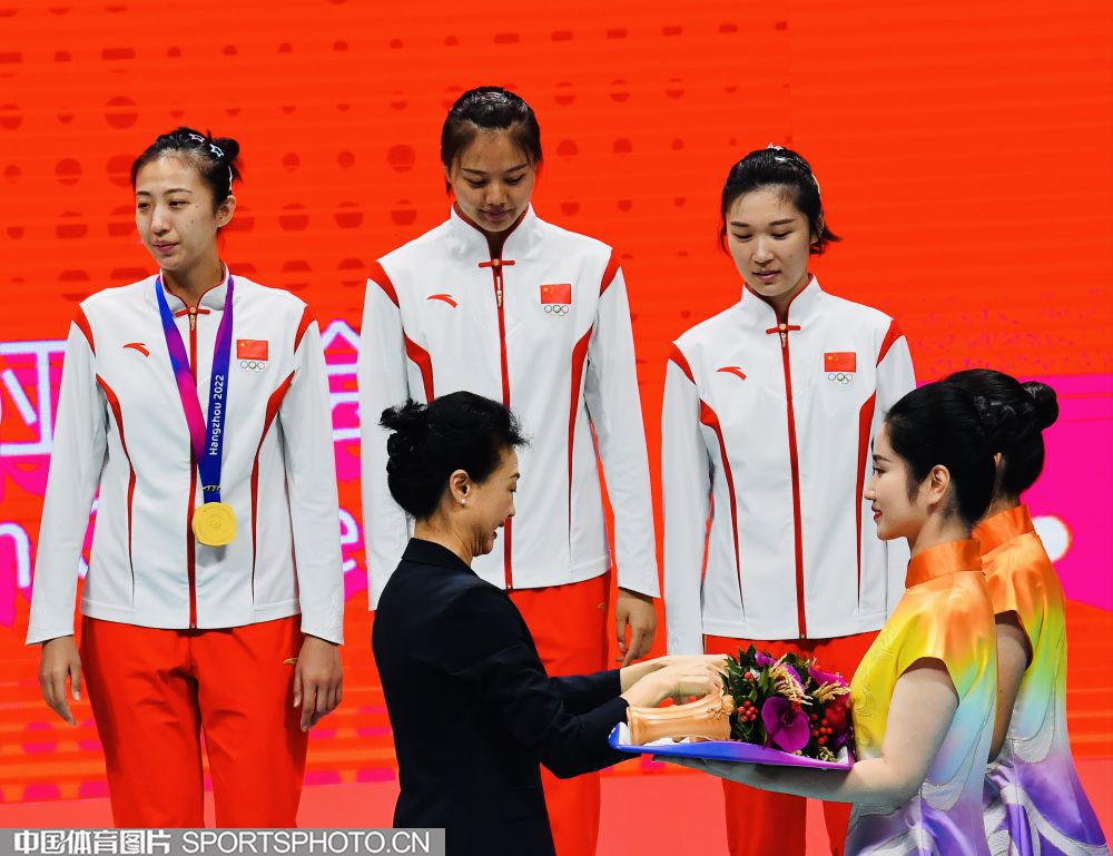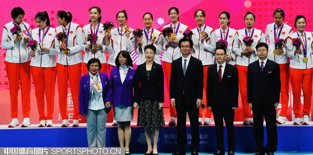 2023年10月5日,杭州亚运会女子排球决赛在杭州师范大学(仓前校区)体育馆进行。中国队3比0击败日本队,获得金牌。图为国际奥委会委员李玲蔚为中国队颁奖。 (中国体育图片 刘亚茹 摄)