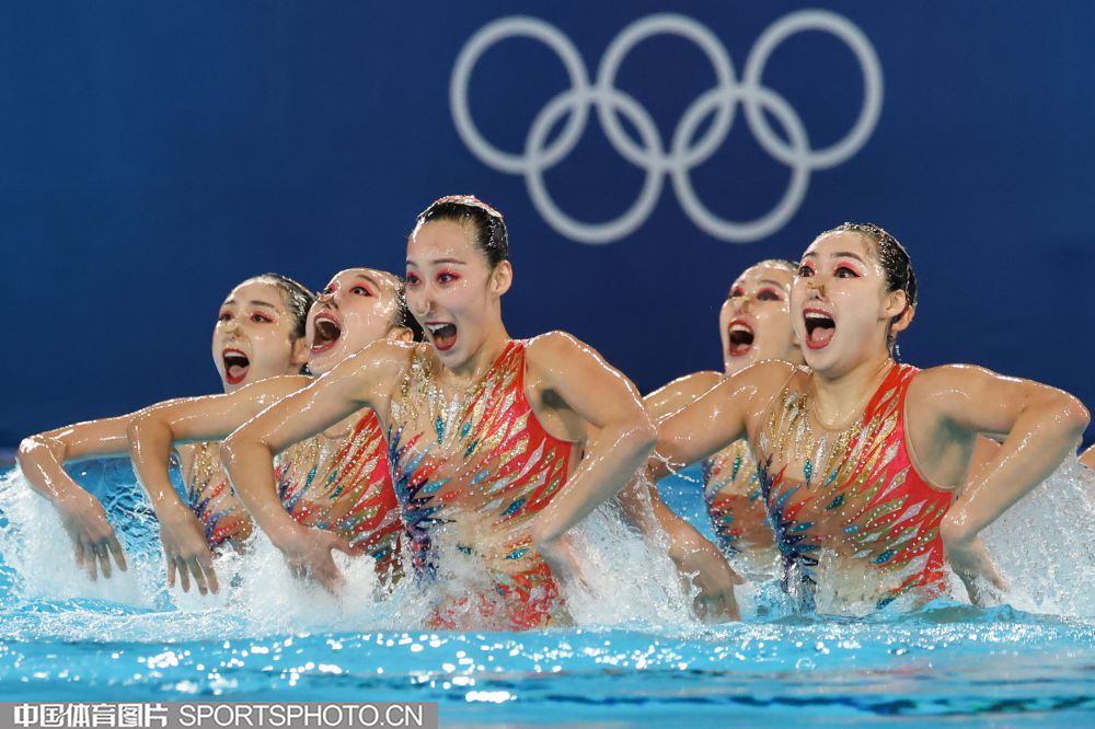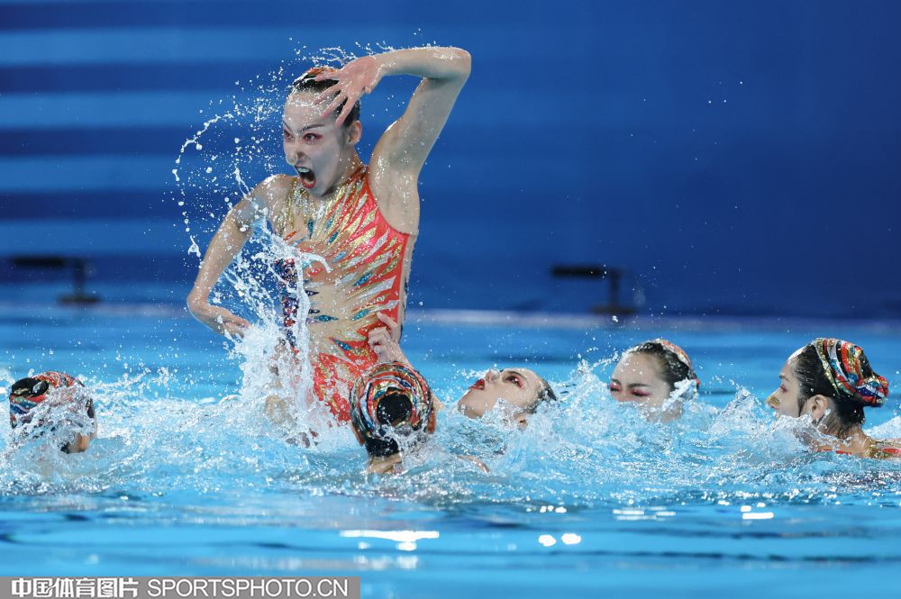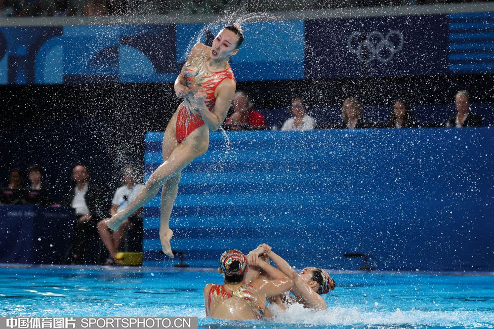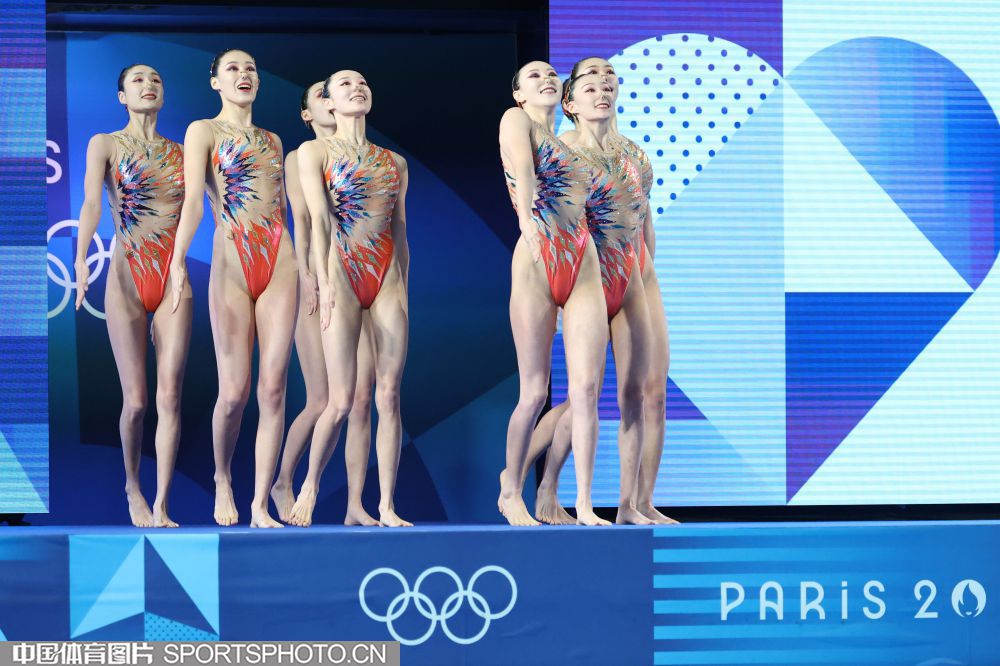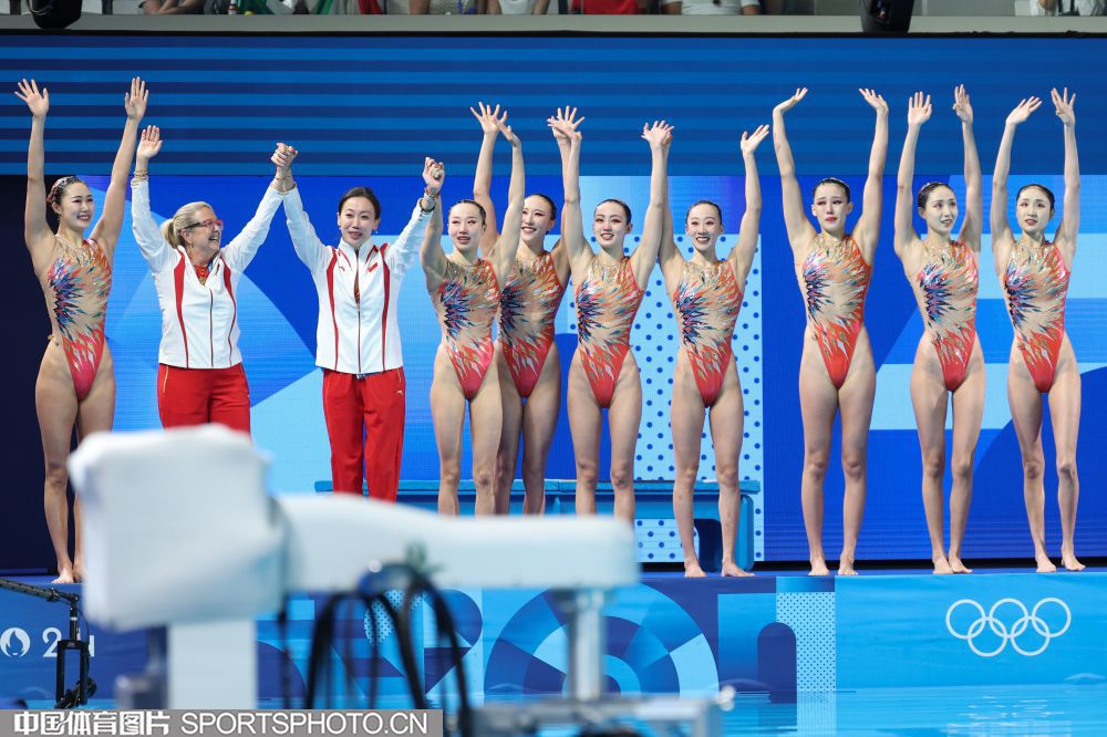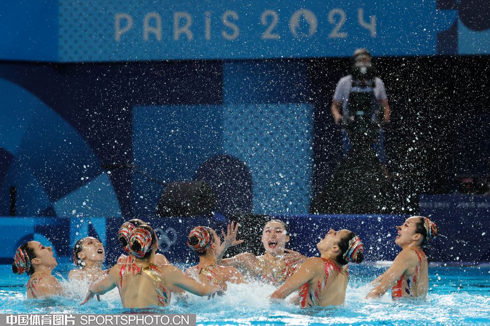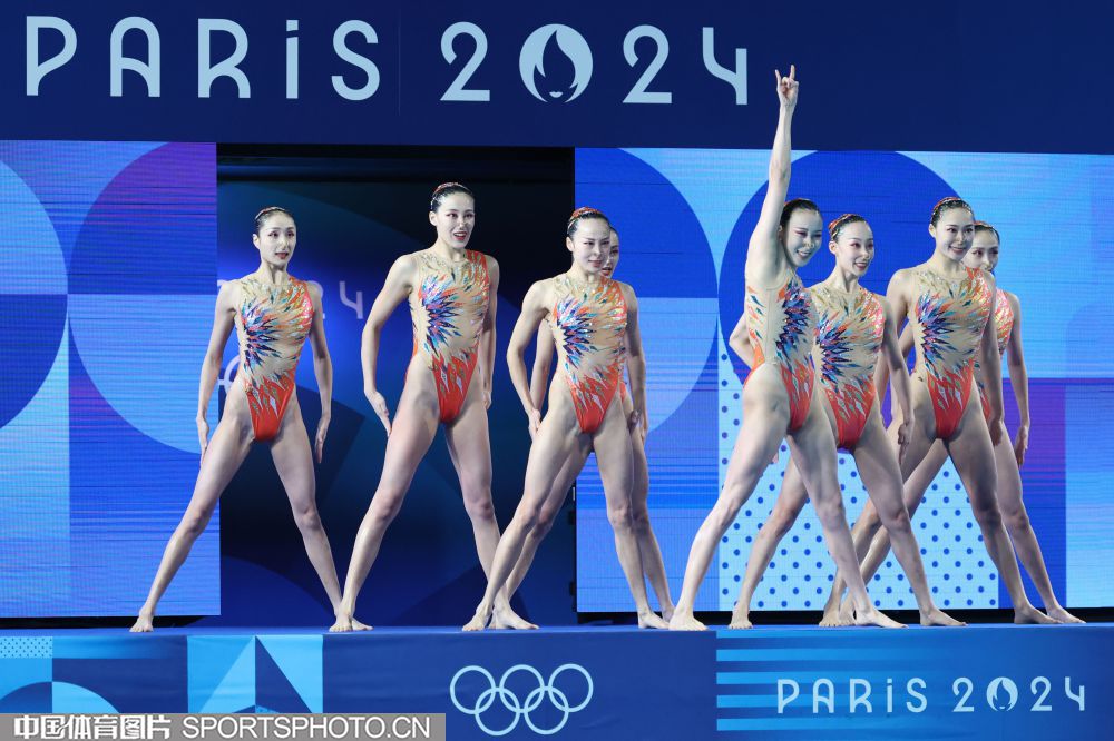 法国当地时间2024年8月7日,巴黎奥运会花样游泳集体技巧自选在巴黎水上运动中心举行,中国队常昊,冯雨、王赐月、王柳懿、王芊懿、向玢璇、肖雁宁、张雅怡以996.1389的总成绩,夺得金牌,实现了中国花游在奥运金牌史上“零的突破”。这是几代花游人努力奋斗的结果。图为中国队在决赛中。(中国体育图片 安灵均 摄)