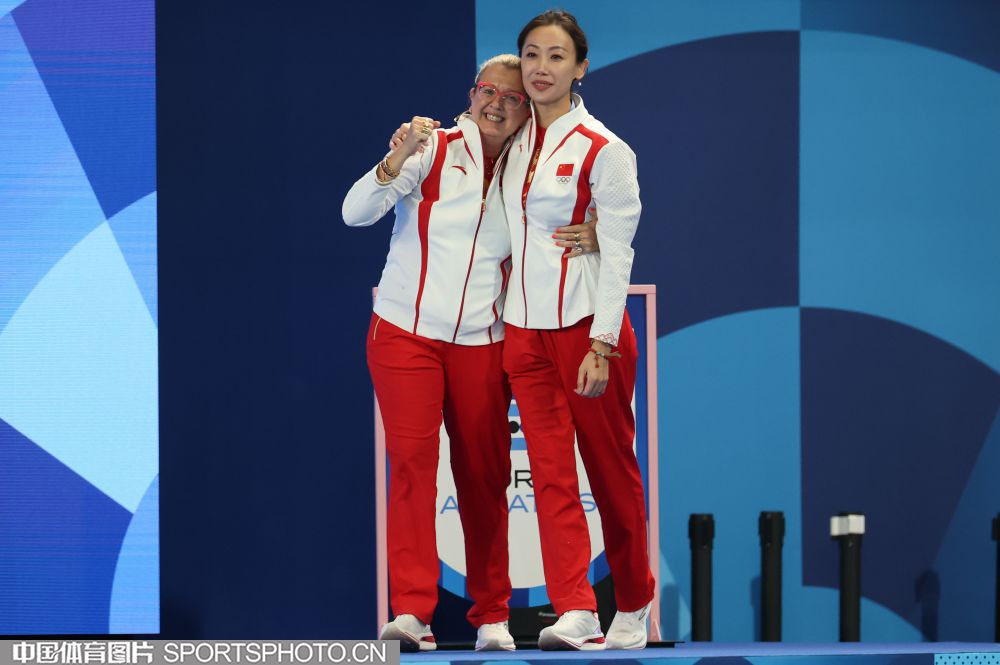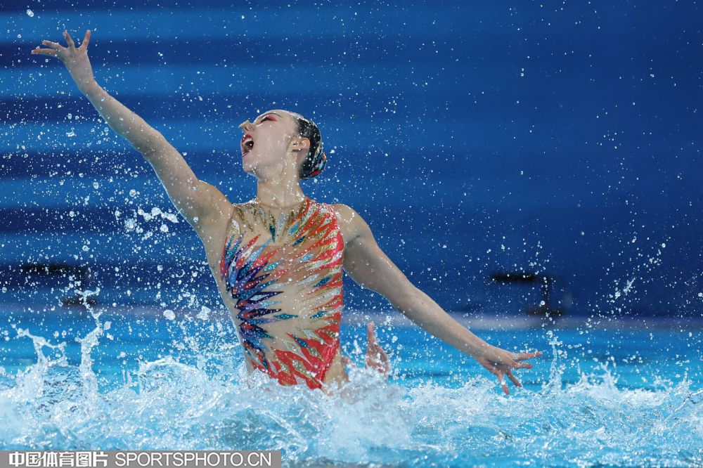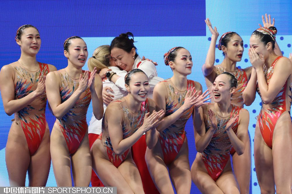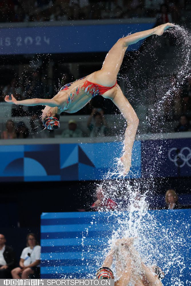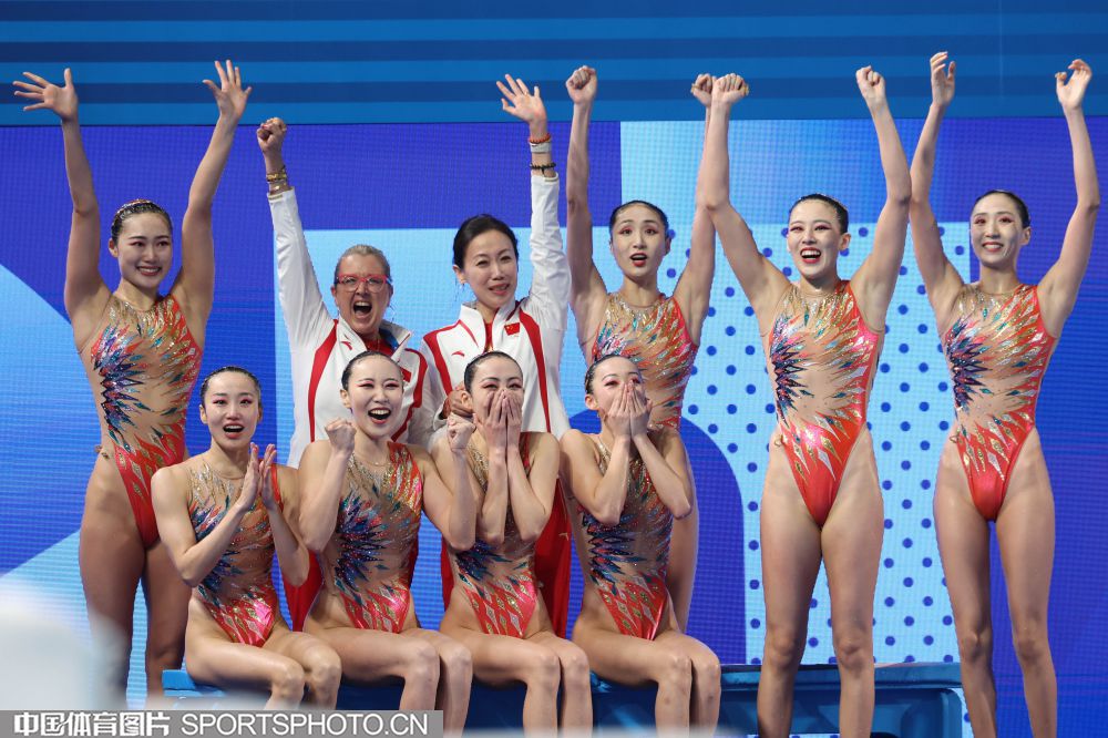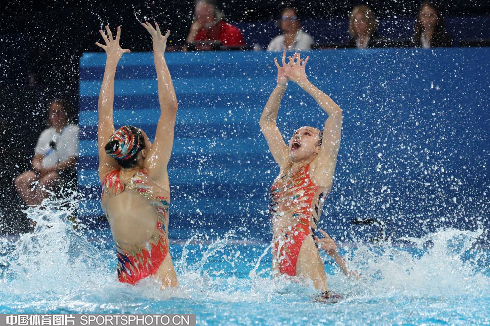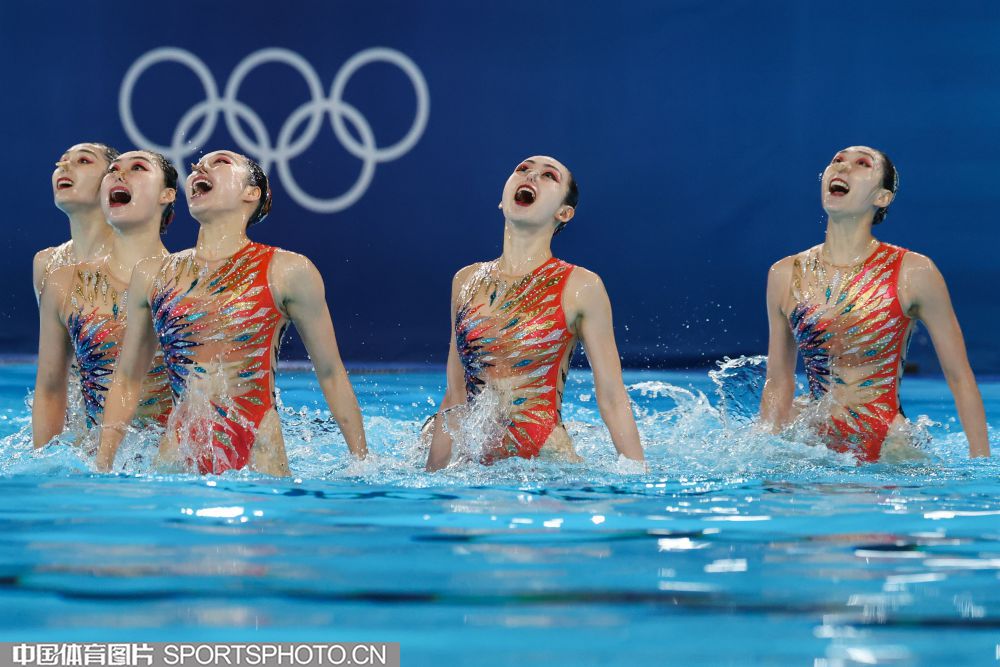 法国当地时间2024年8月7日,巴黎奥运会花样游泳集体技巧自选在巴黎水上运动中心举行,中国队常昊,冯雨、王赐月、王柳懿、王芊懿、向玢璇、肖雁宁、张雅怡以996.1389的总成绩,夺得金牌,实现了中国花游在奥运金牌史上“零的突破”。这是几代花游人努力奋斗的结果。图为中国队在决赛中。(中国体育图片 安灵均 摄)