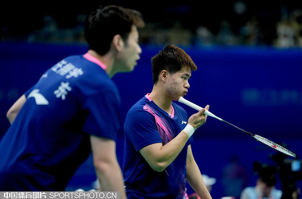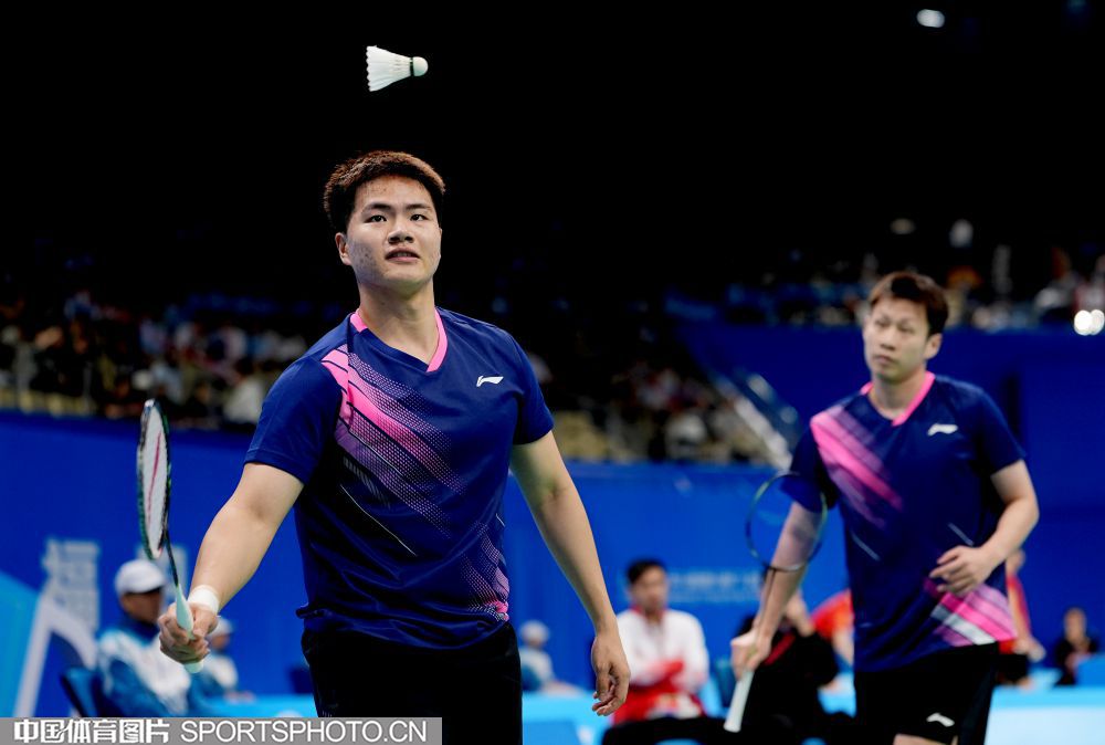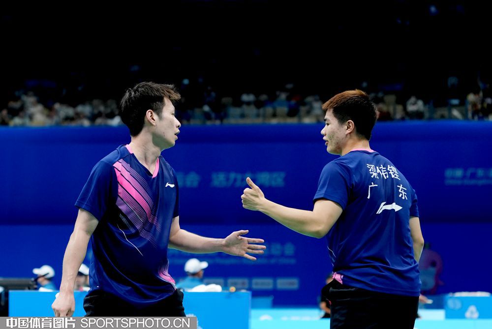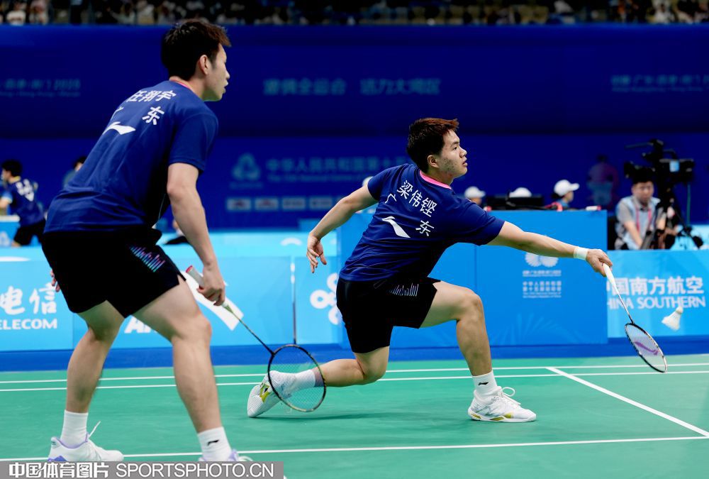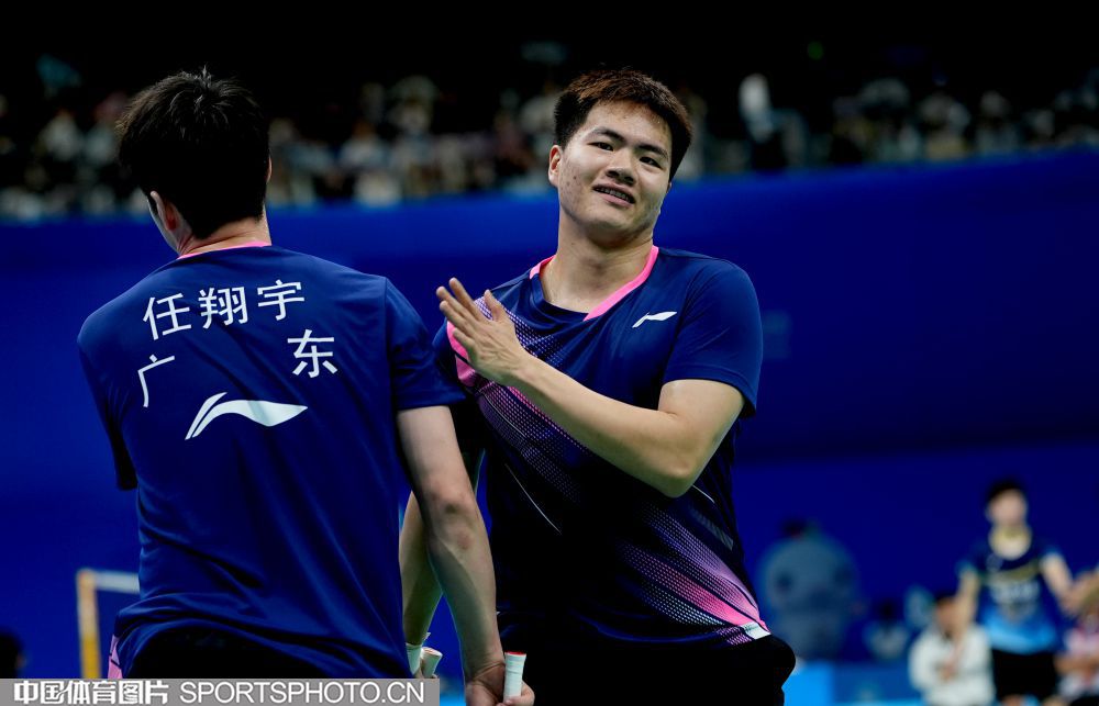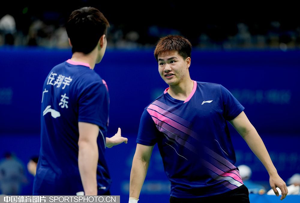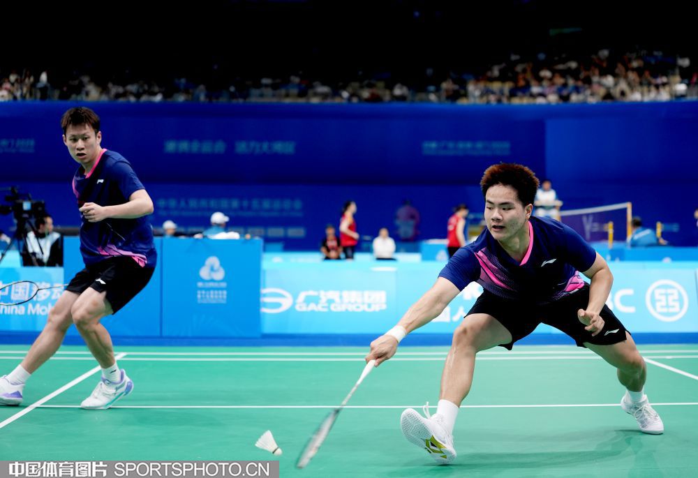 2025年11月9日,中华人民共和国第十五届运动会羽毛球项目在深圳体育中心体育馆进入第三比赛日,国手悉数登场为各自代表队角逐团体赛晋级资格。图为广东选手梁伟铿(右)、任翔宇在比赛中。(中国体育图片 倪敏哲 摄)