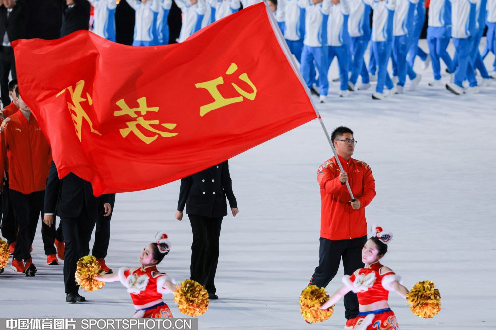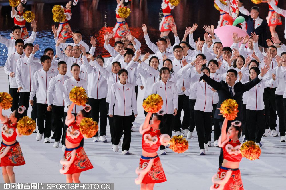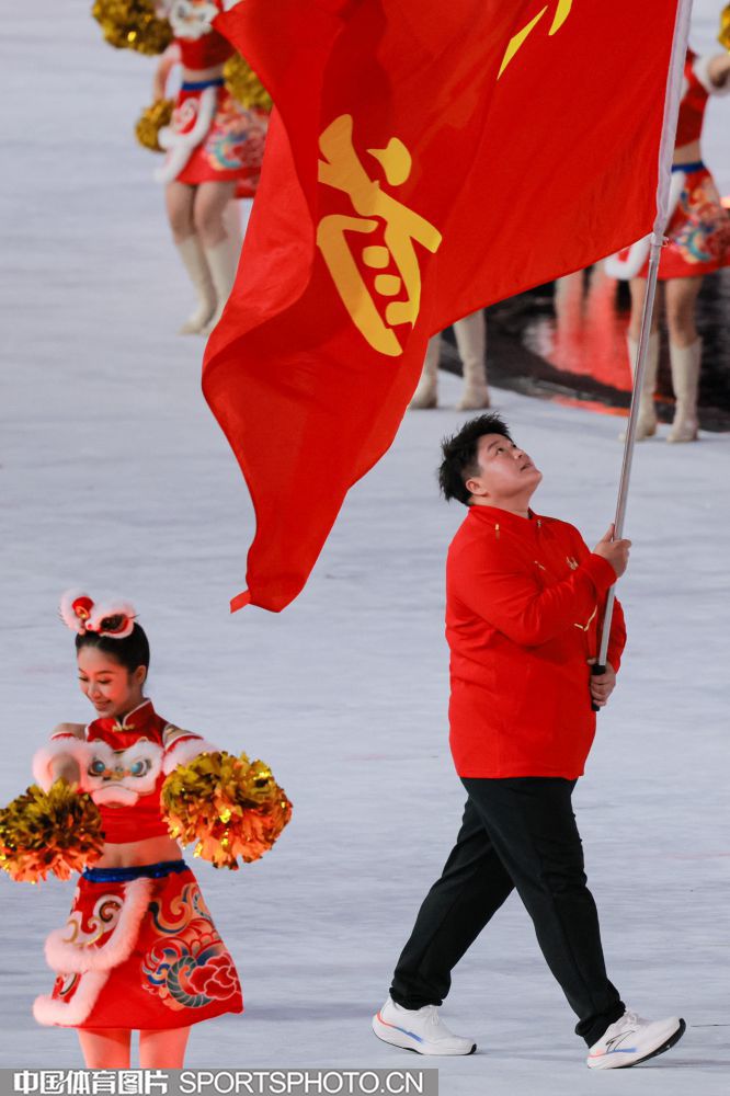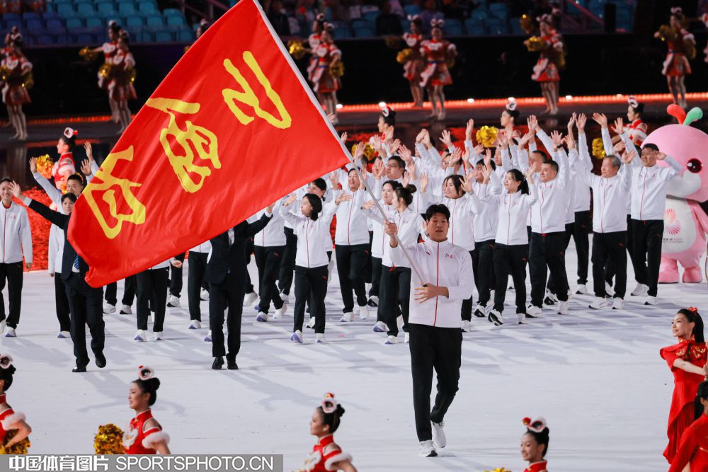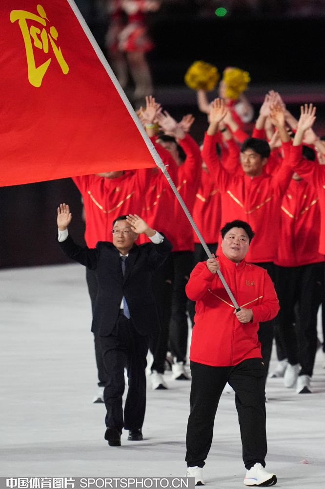 2025年11月9日,中华人民共和国第十五届运动会开幕式在广东奥林匹克体育中心举行。图为江苏省体育代表团旗手、亚运冠军、男子田径链球运动员王琦。 (中国体育图片 鹿麟 摄)