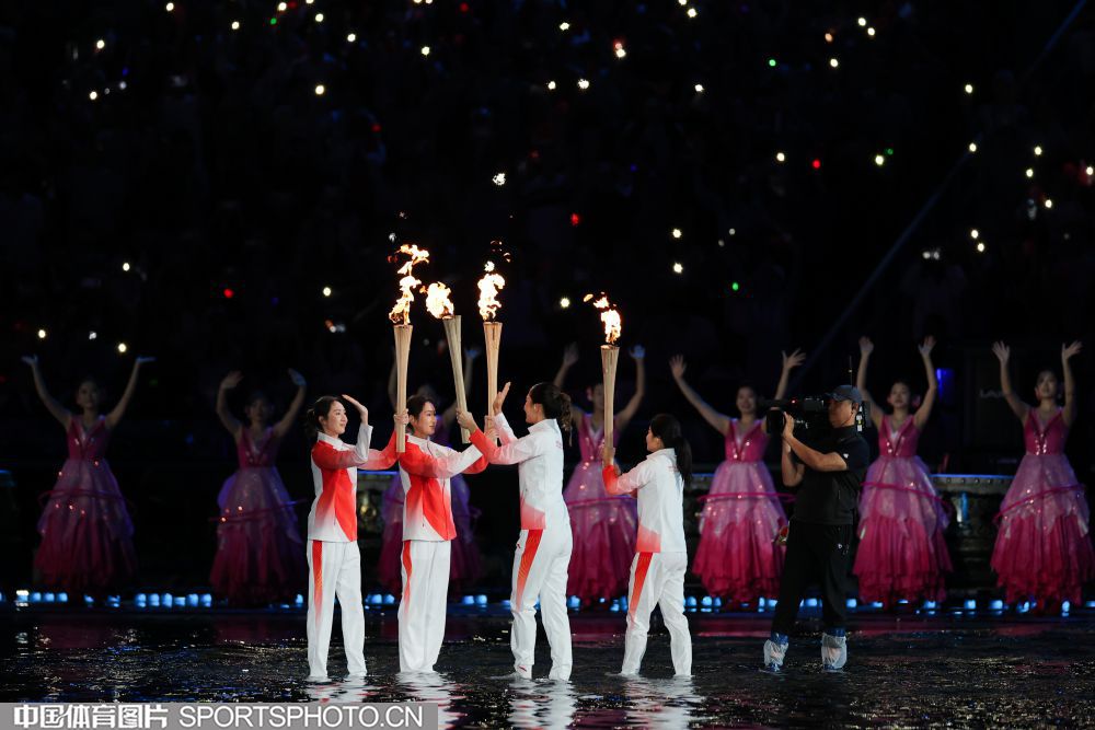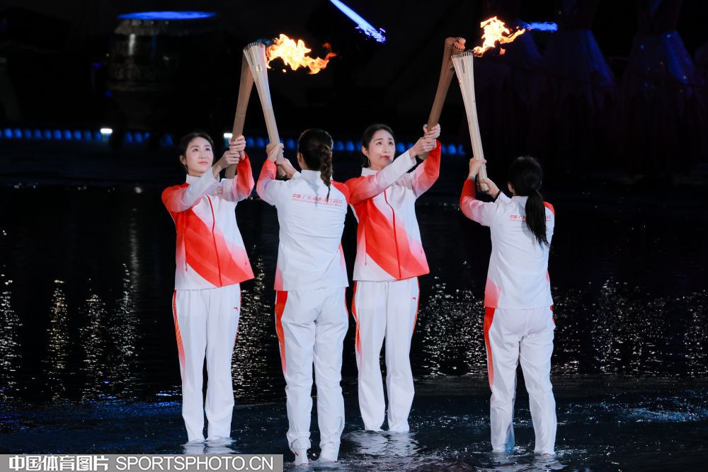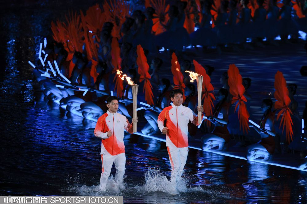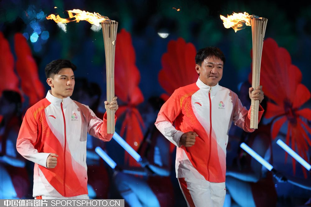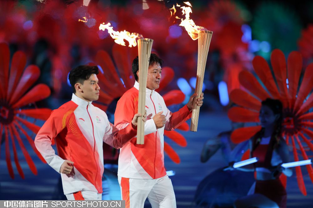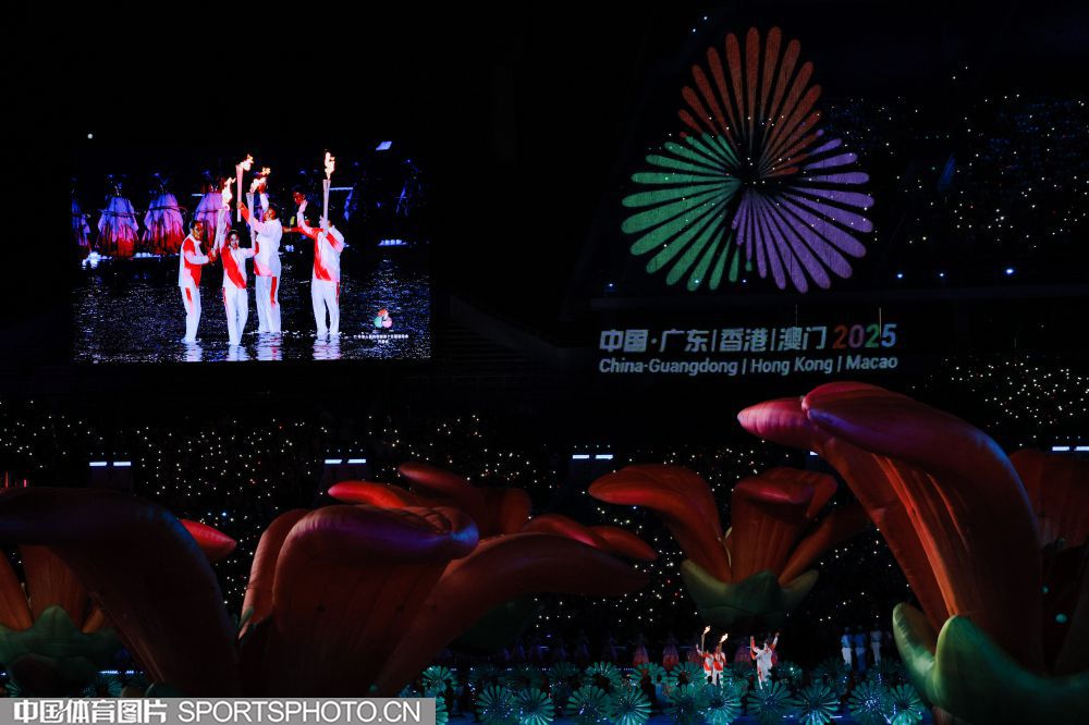 2025年11月9日,中华人民共和国第十五届运动会开幕式在广东奥林匹克体育中心举行。图为火炬传递现场。(中国体育图片 张昕 摄)