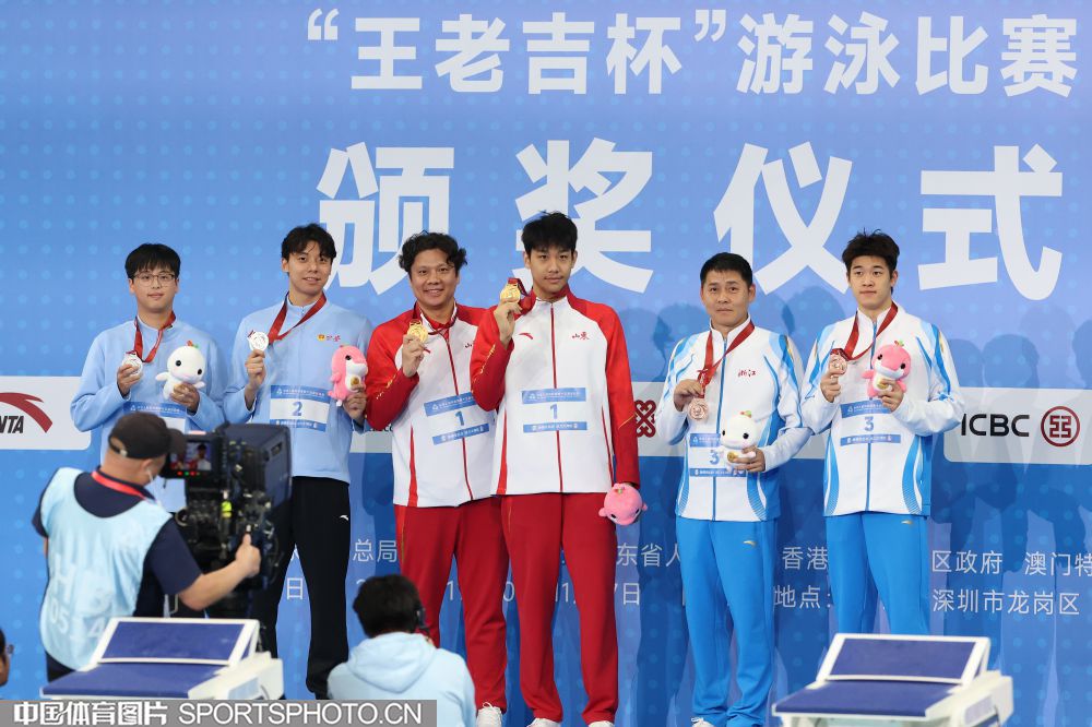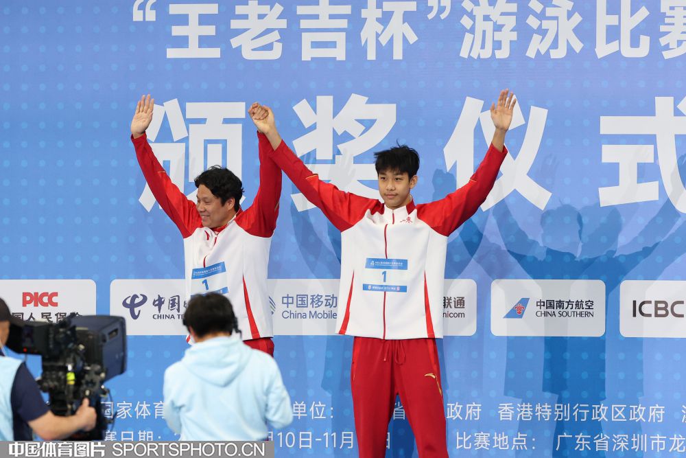 2025年11月12日,中华人民共和国第十五届运动会游泳比赛继续在深圳大运中心游泳馆进行。在男子200米自由泳决赛中,山东队张展硕游出1分44秒86的成绩,获得金牌并打破国家纪录。图为张展硕(右)在颁奖仪式上。(中国体育图片 安灵均 摄)