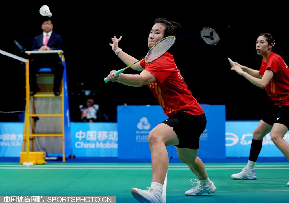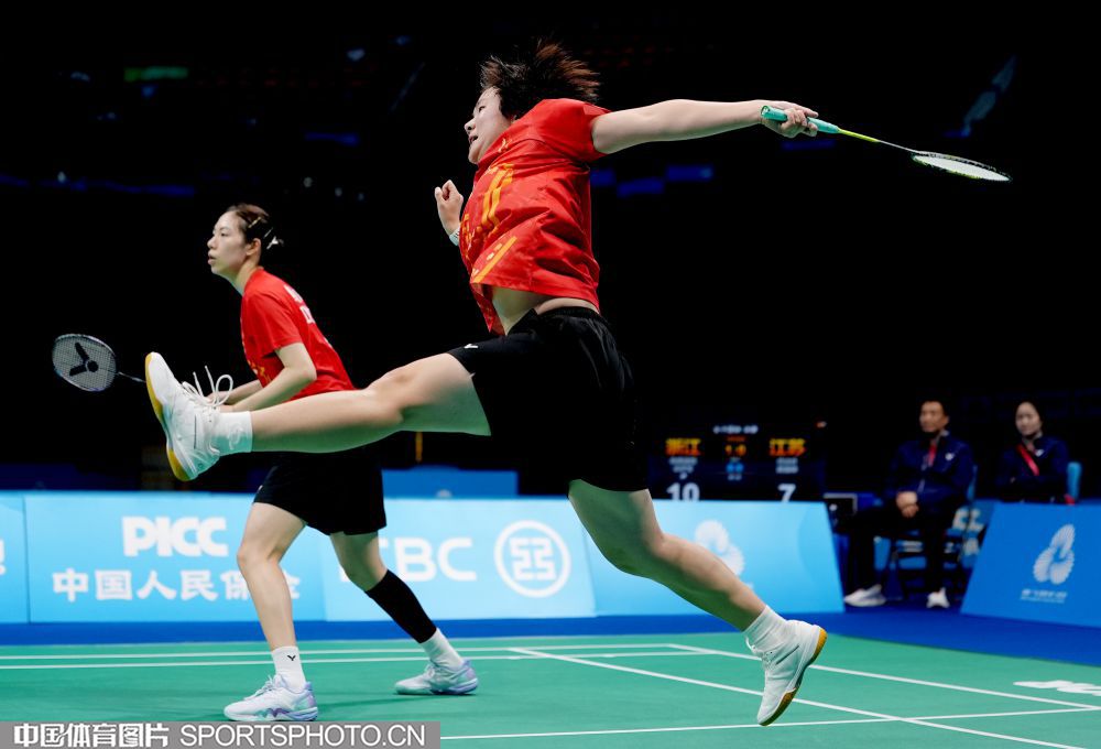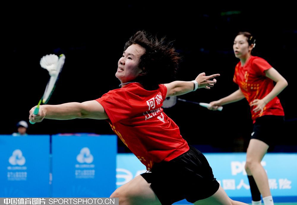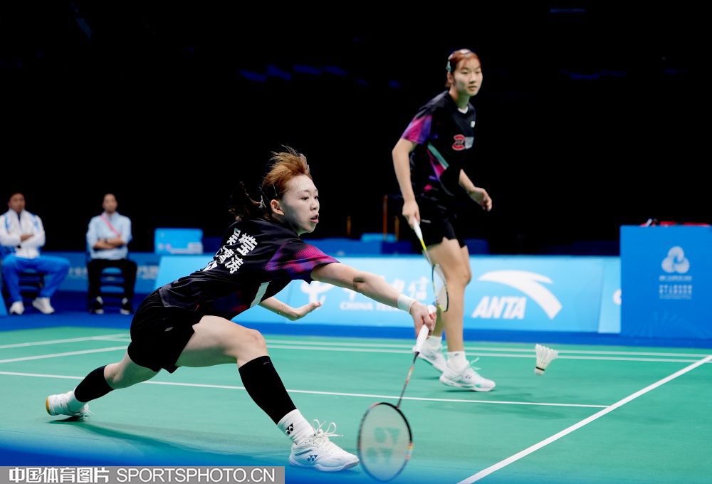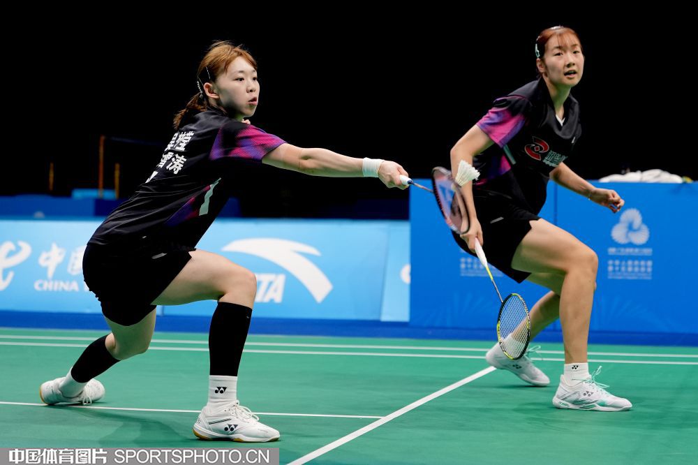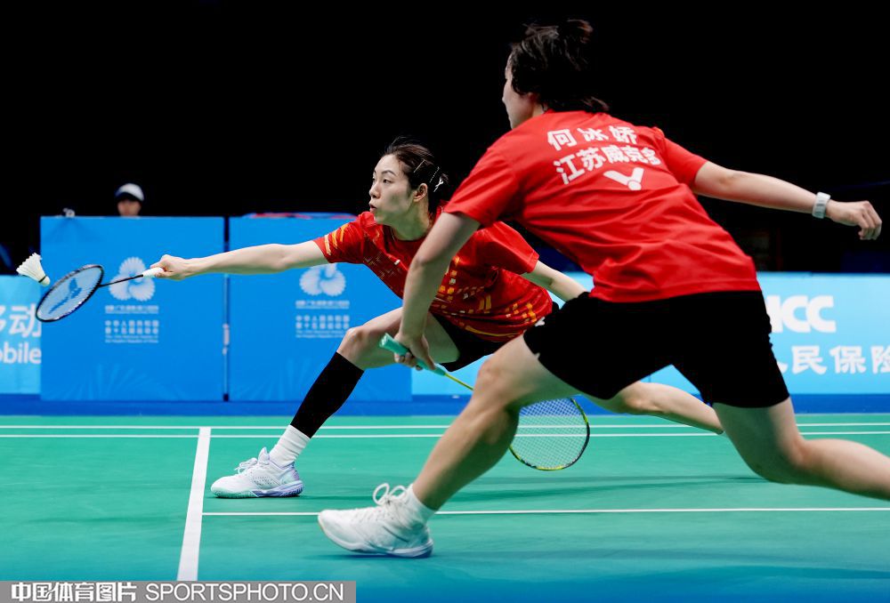 2025年11月14日,第十五届全国运动会羽毛球项目女子团体决赛在深圳体育中心体育馆举行,最终浙江队以3比0战胜江苏队获得冠军。图为江苏选手何冰娇/鲍骊婧在比赛中。(中国体育图片 倪敏哲 摄)