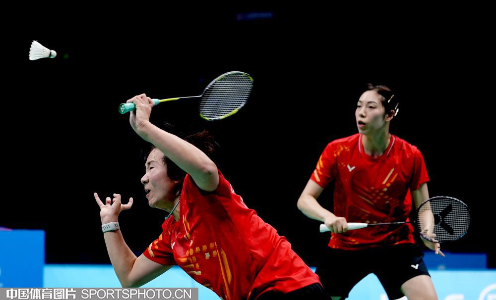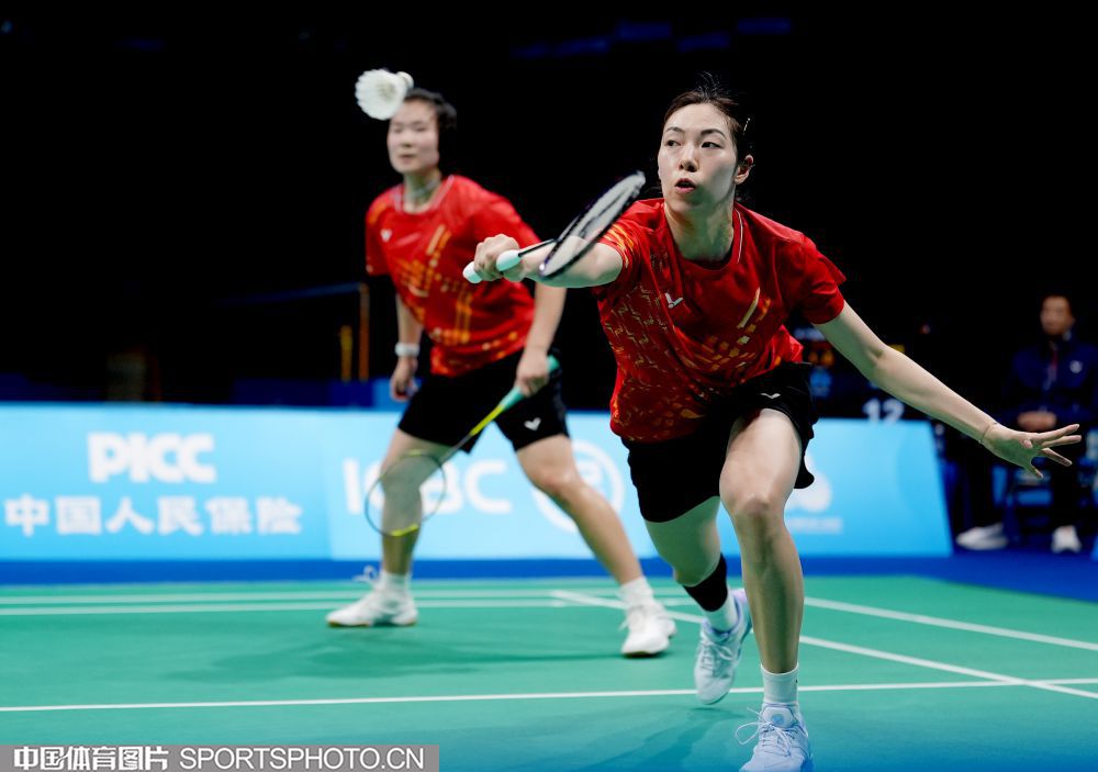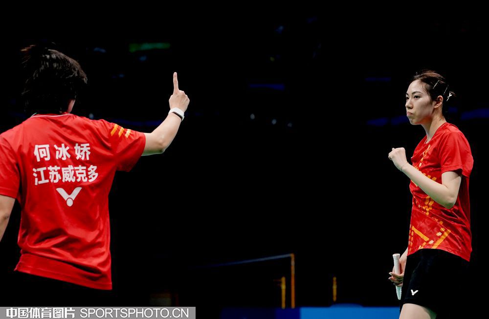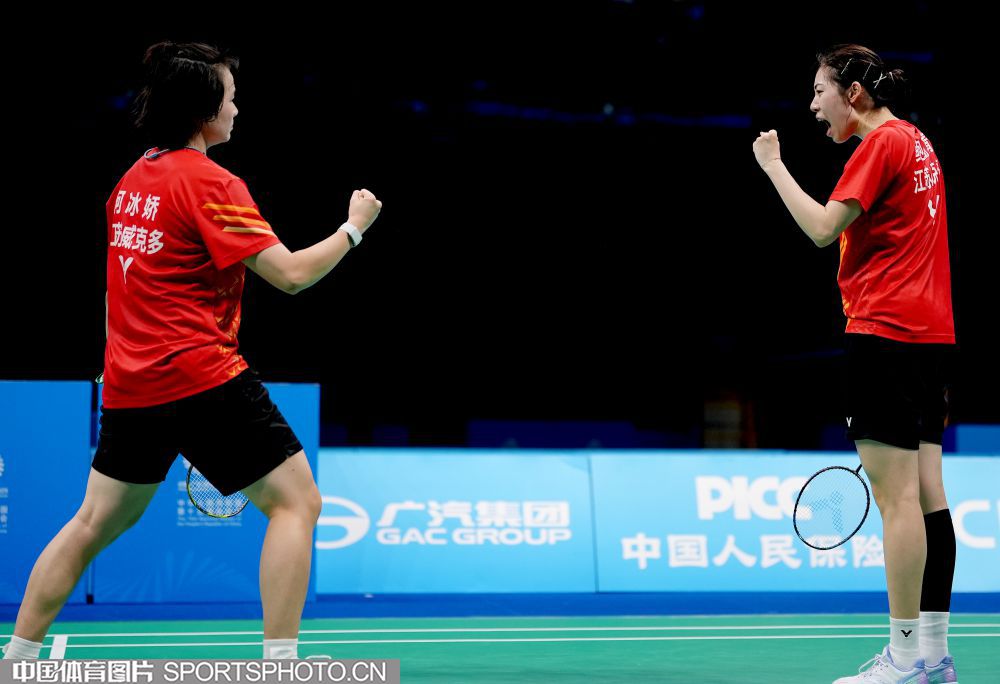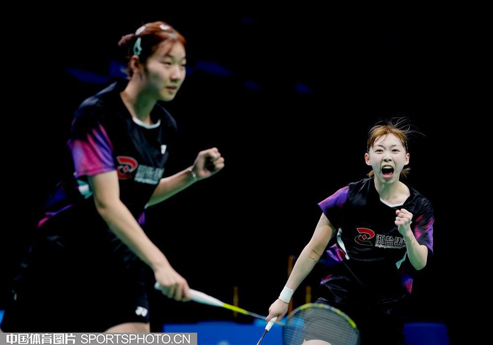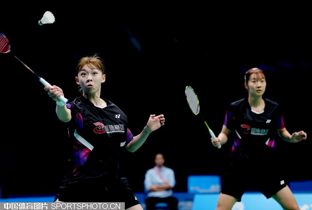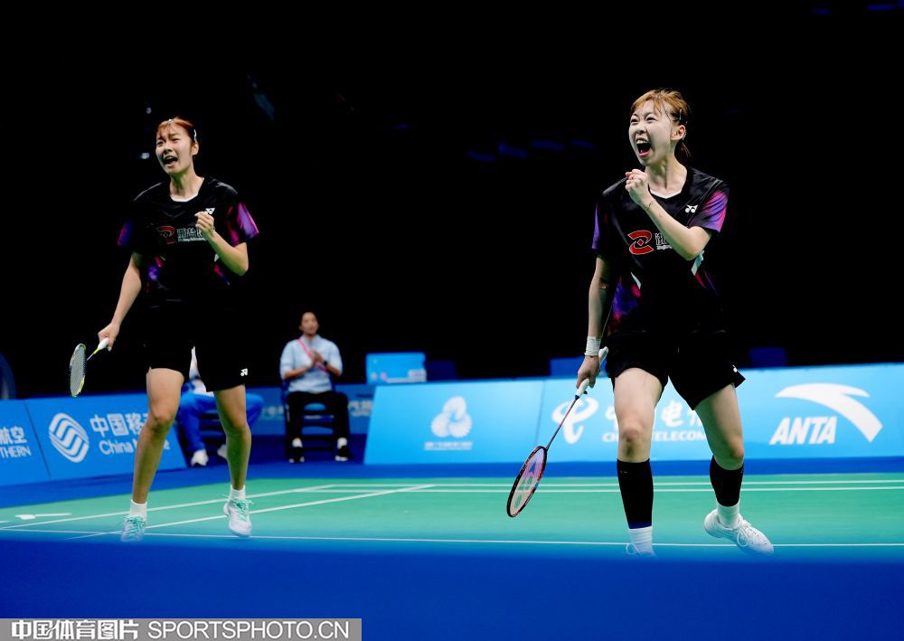 2025年11月14日,第十五届全国运动会羽毛球项目女子团体决赛在深圳体育中心体育馆举行,最终浙江队以3比0战胜江苏队获得冠军。图为江苏选手何冰娇/鲍骊婧在比赛中。(中国体育图片 倪敏哲 摄)