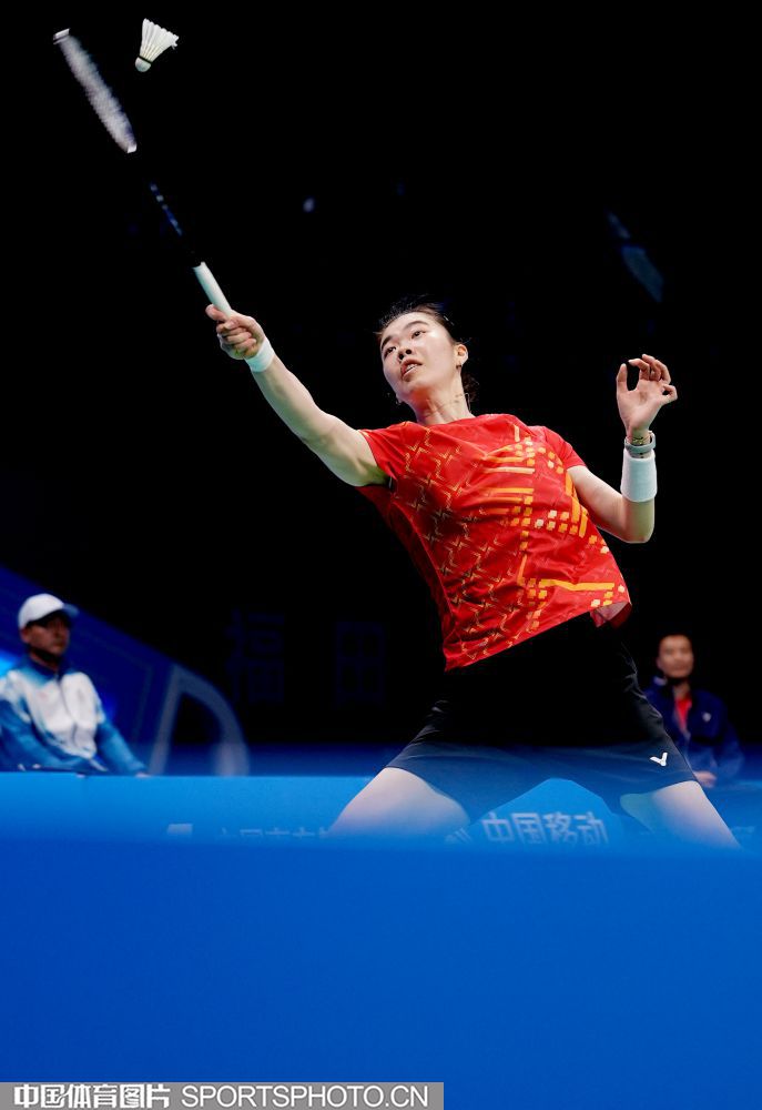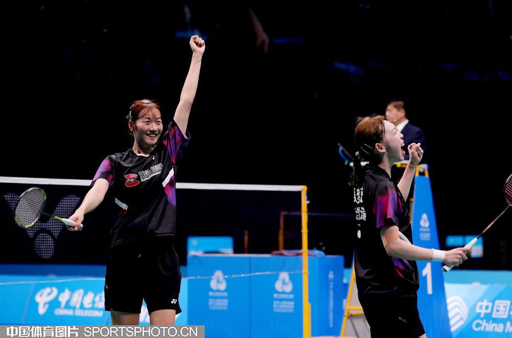 2025年11月14日,第十五届全国运动会羽毛球项目女子团体决赛在深圳体育中心体育馆举行,最终浙江队以3比0战胜江苏队获得冠军。图为浙江选手陈樊淑湉/吴梦莹在比赛中。(中国体育图片 倪敏哲 摄)