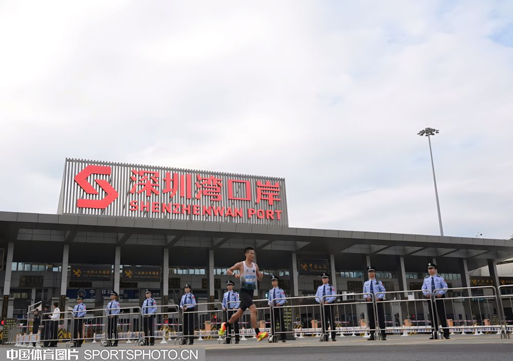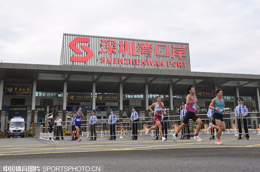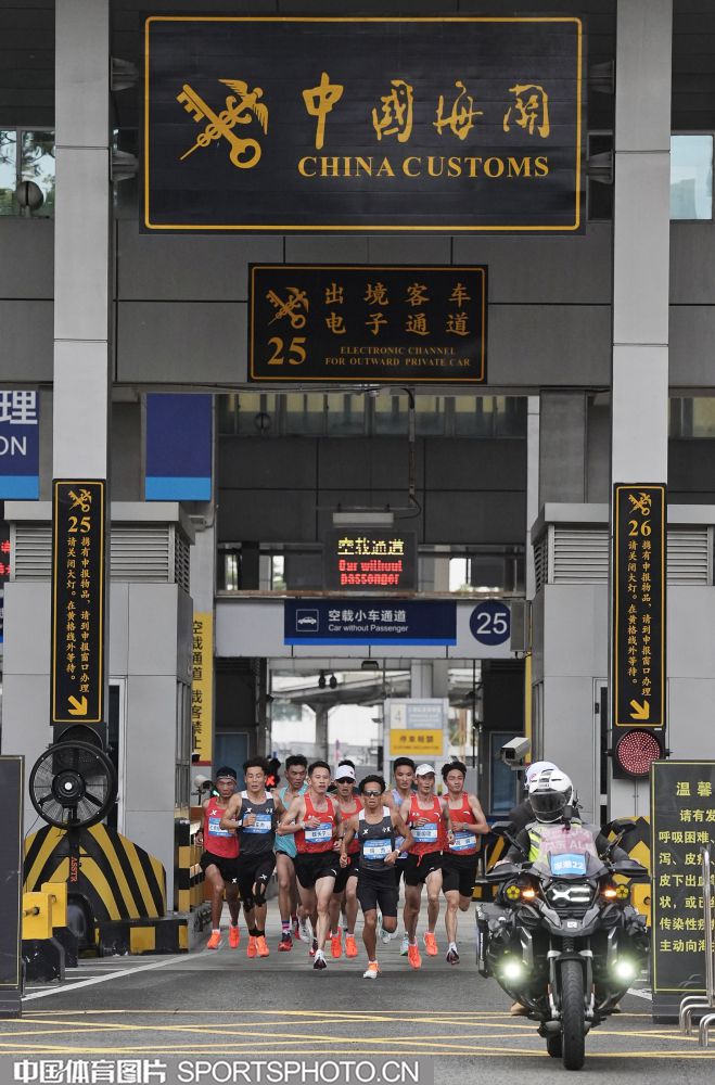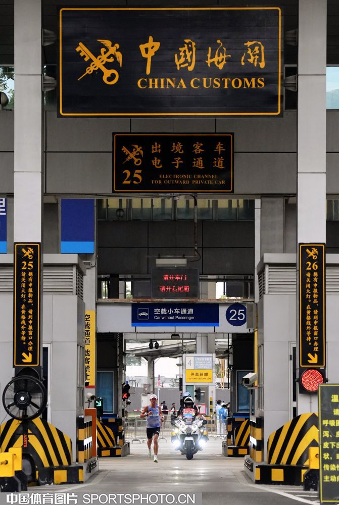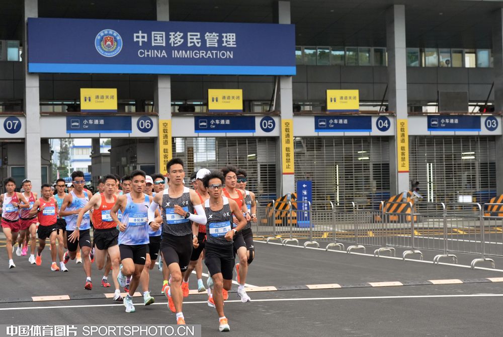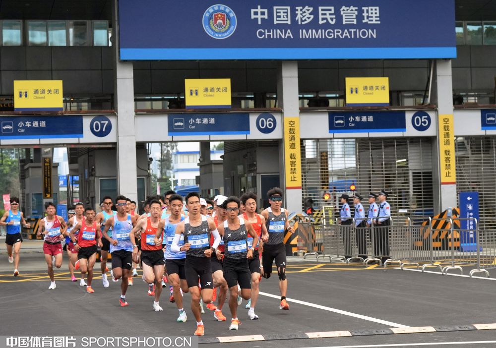 2025年11月15日,十五运会男子马拉松比赛在深圳湾体育中心旁海德三道开赛,这是全运会历史上首个跨境马拉松赛事,选手们需经过深圳湾口岸进入香港赛段。图为选手们通过深圳湾口岸跑进香港。 (中国体育图片 倪敏哲 摄)