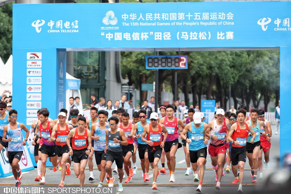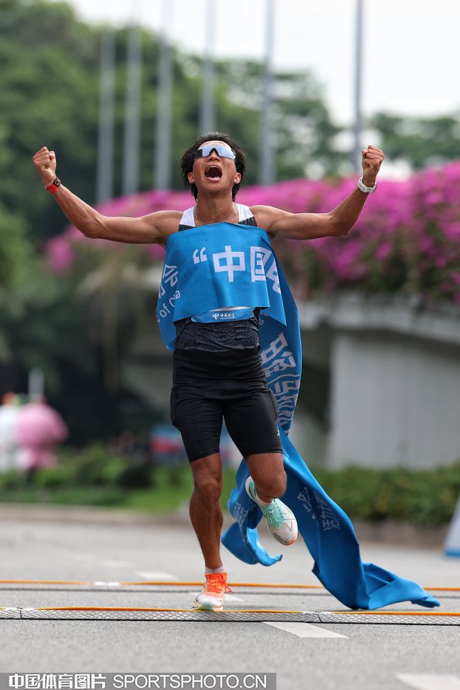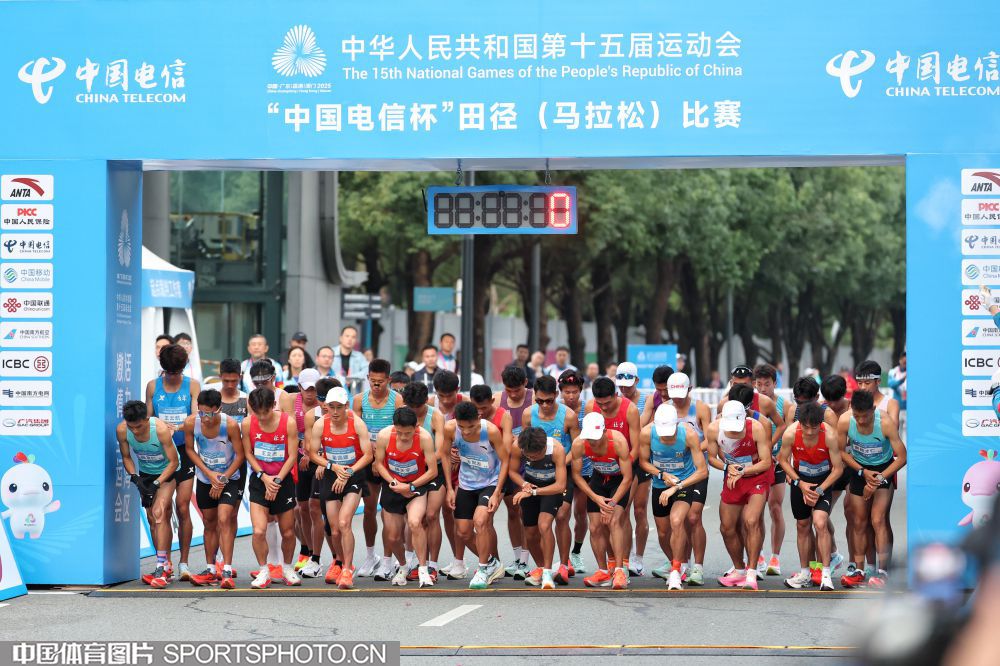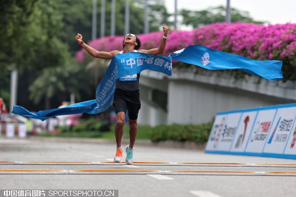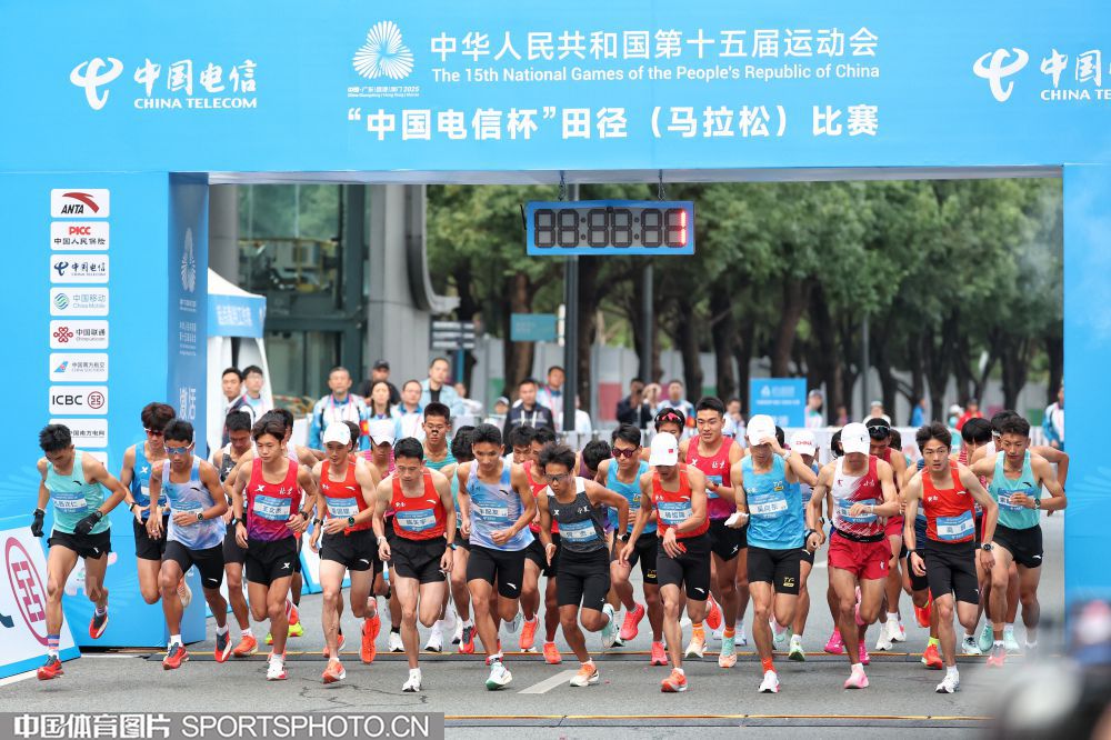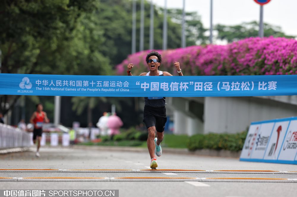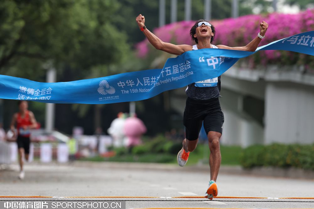 2025年11月15日,十五运会男子马拉松比赛在深圳湾体育中心旁海德三道开赛,这是全运会历史上首个跨境马拉松赛事,选手们需经过深圳湾口岸进入香港赛段。图为宁夏选手何杰夺得冠军。(中国体育图片 安灵均 摄)