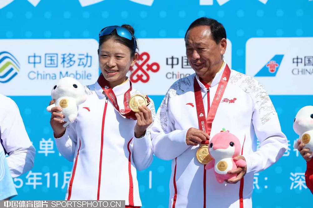 2025年11月15日,十五运会女子马拉松比赛在深圳湾体育中心旁海德三道开赛。最终云南队选手张德顺夺冠,西藏队次仁措姆获得亚军,河南队选手路颖获得季军。图为冠军张德顺(左)与教练在颁奖仪式现场。(中国体育图片 安灵均 摄)