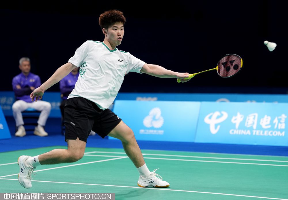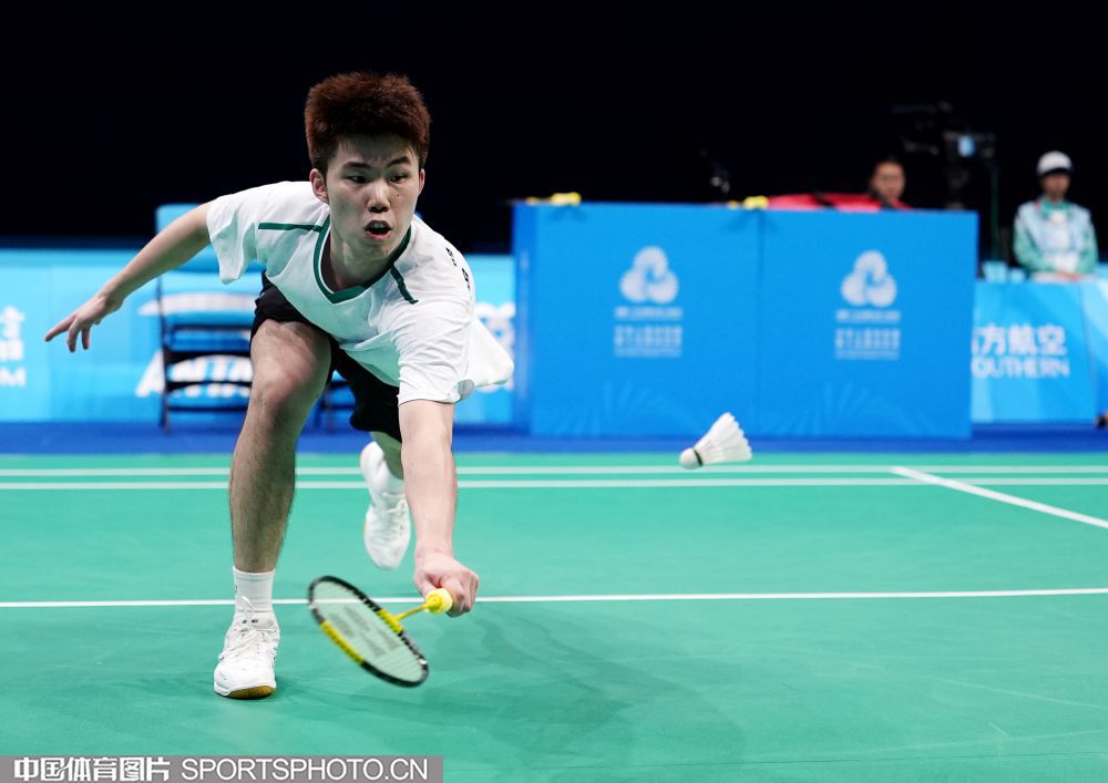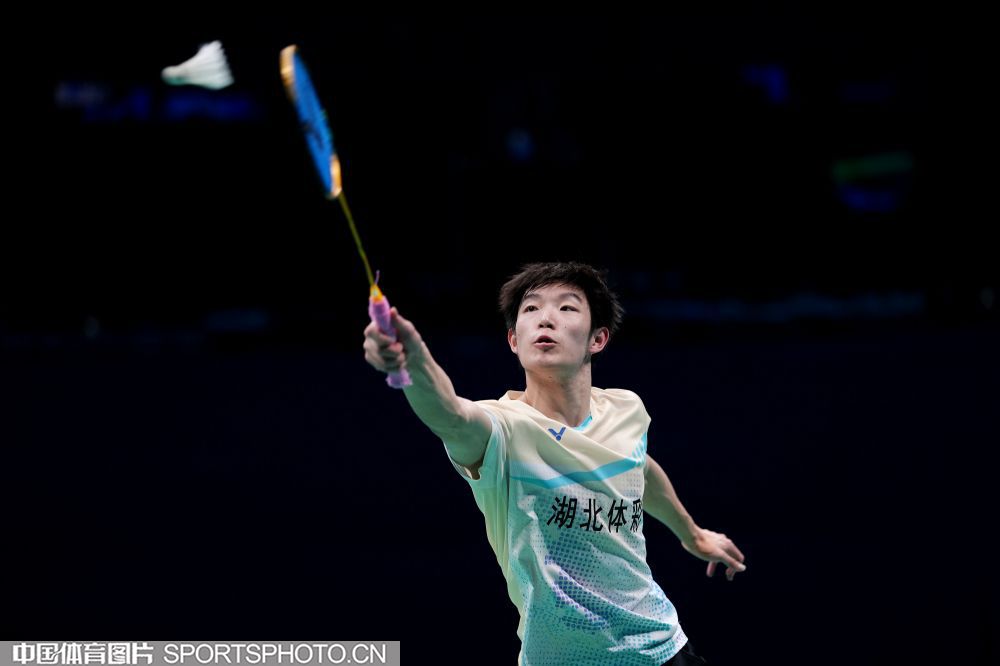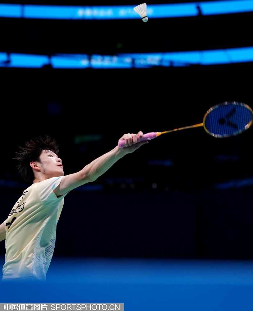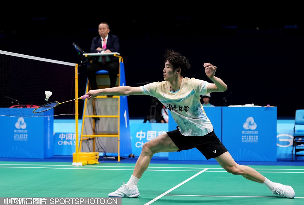 2025年11月20日,第十五届全国运动会羽毛球项目在深圳体育中心体育馆进入最后一个比赛日。在男子单打决赛中,福建选手翁泓阳战胜湖北选手朱轩辰获得冠军。图为福建选手翁泓阳在比赛中。(中国体育图片 倪敏哲 摄)