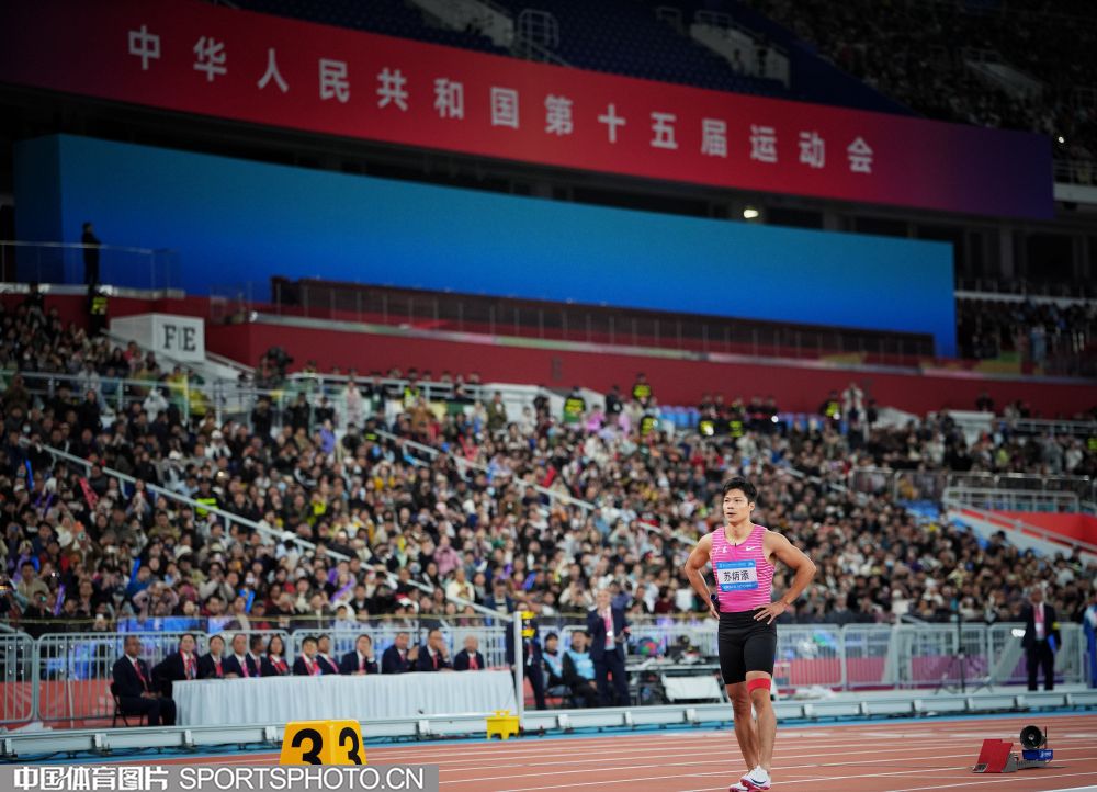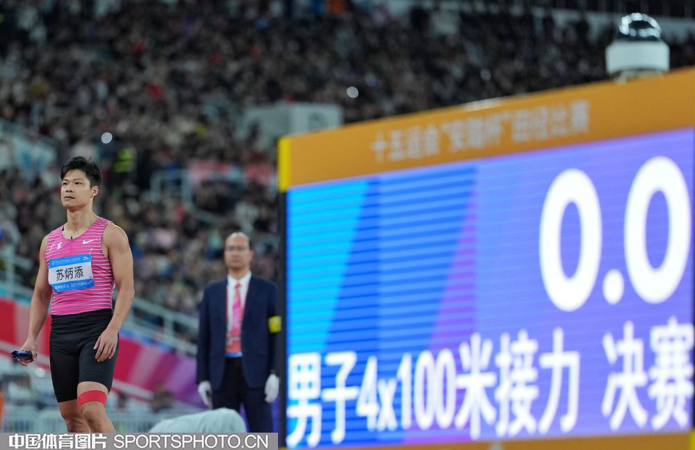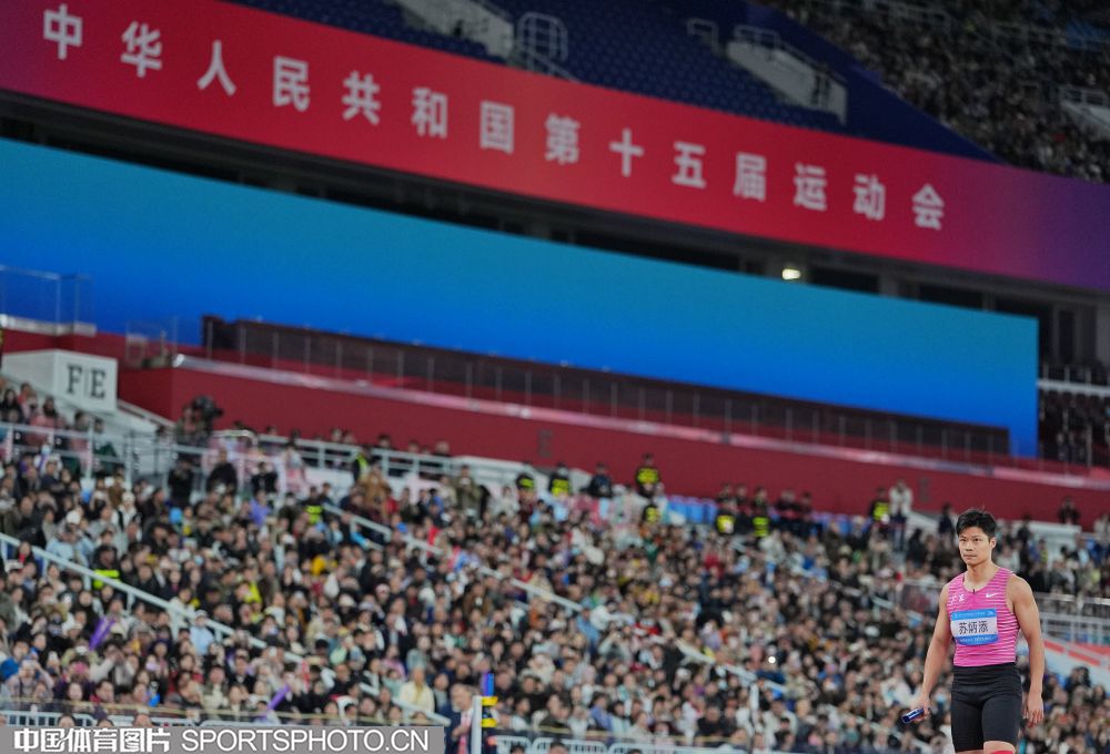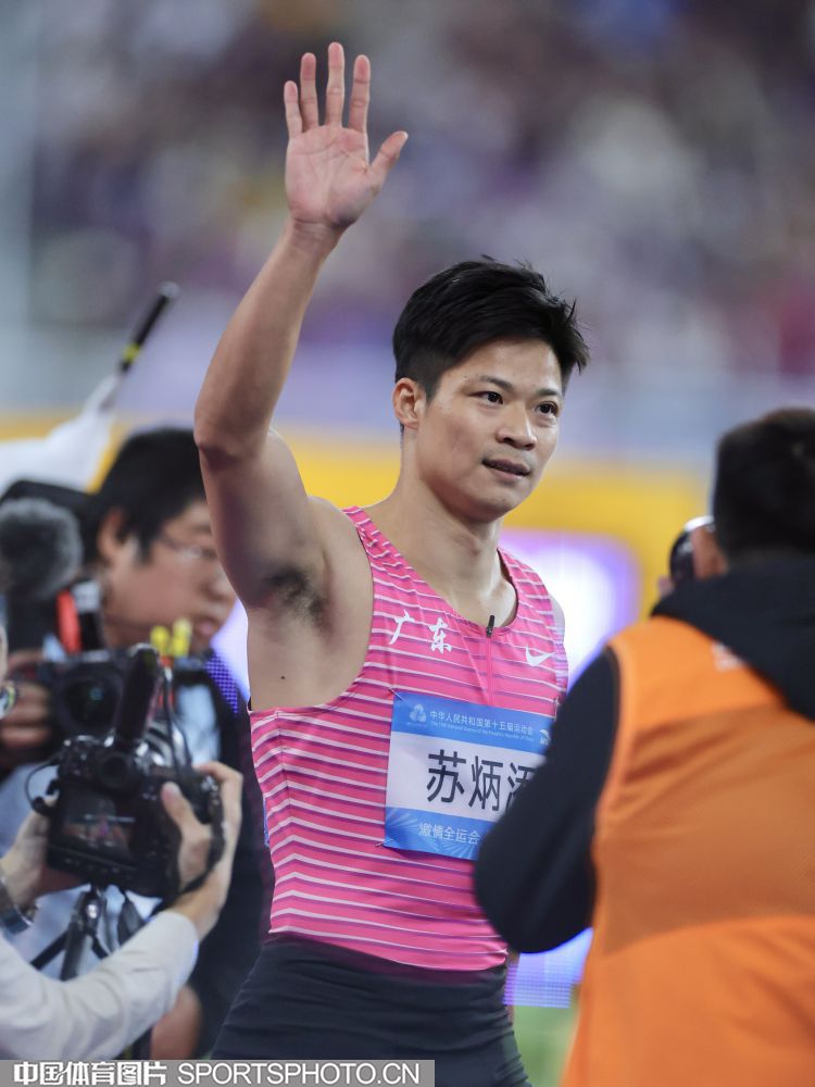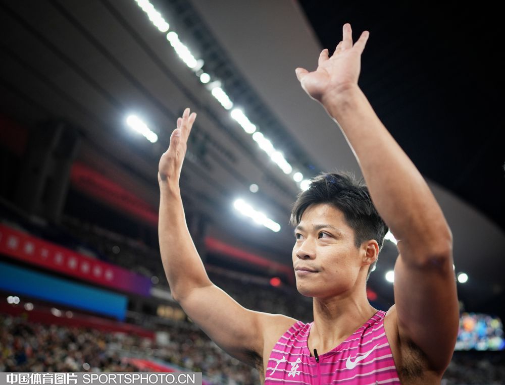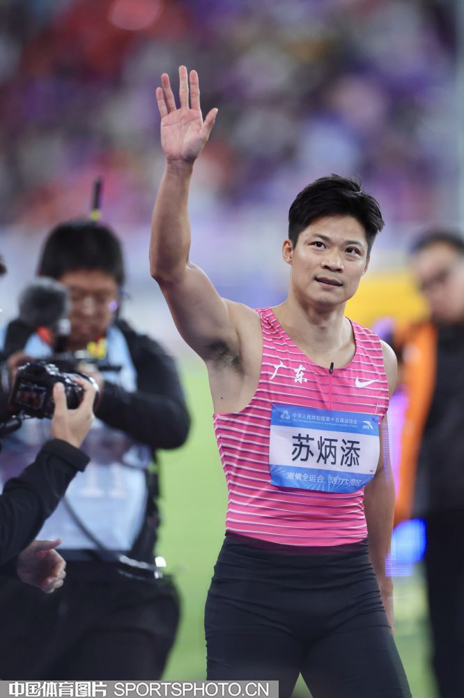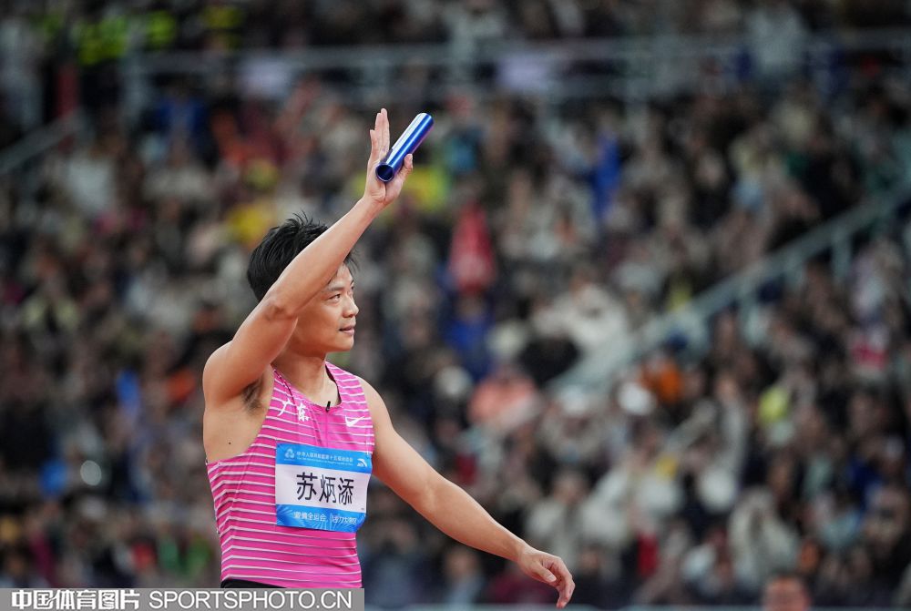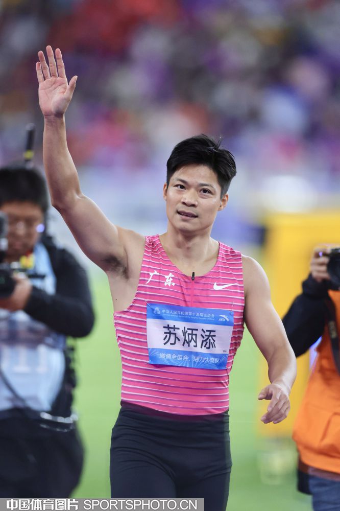 2025年11月20日,第十五届全国运动会田径男子4x100米接力决赛在广东省奥体中心体育场举行,湖北队、江西队和江苏队获得前三名,广东队获得第四名。图为苏炳添向观众致意。(中国体育图片 张昕 摄)