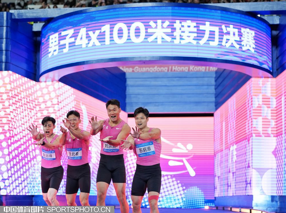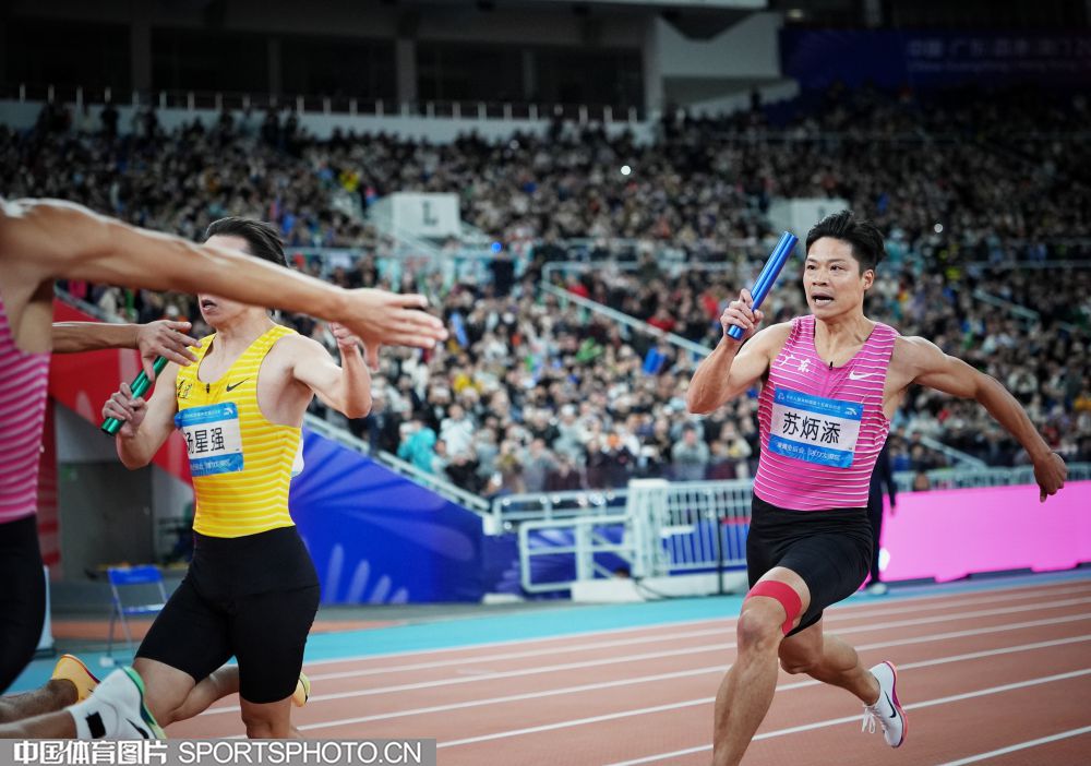 图组名称:十五运会田径男子4x100米接力决赛 广东队获得第四名