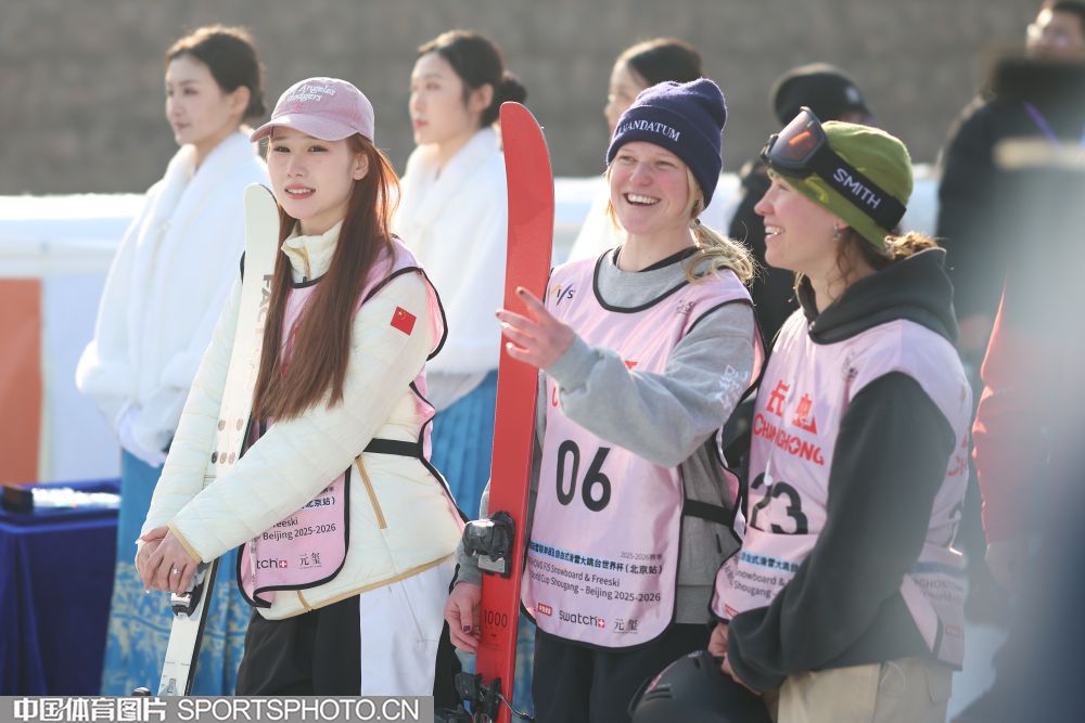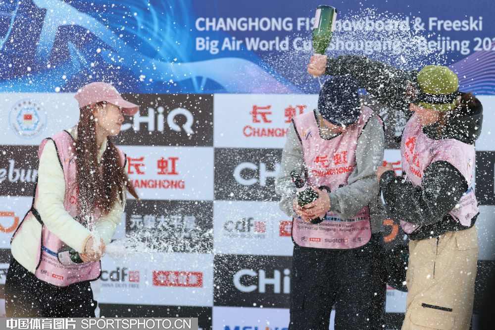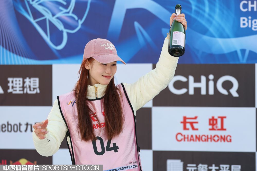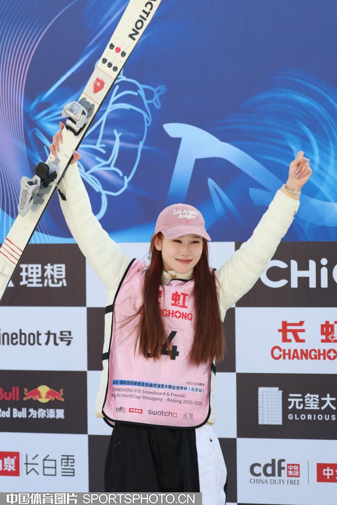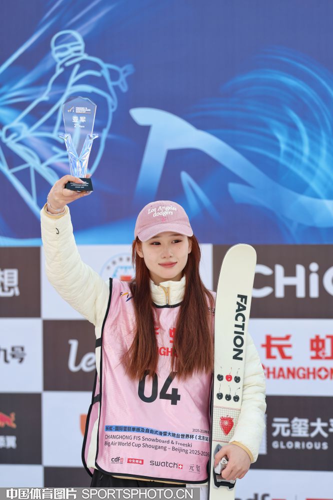 2025年12月6日,2025-2026赛季长虹·国际雪联单板及自由式滑雪大跳台世界杯(北京站)在首钢滑雪大跳台“雪飞天”继续进行。在自由式滑雪女子组决赛中,中国选手刘梦婷以172.25分的成绩获得银牌,队友韩林杉以164.25分获得第五名。图为刘梦婷在颁奖仪式上中。(中国体育图片 安灵均 摄)