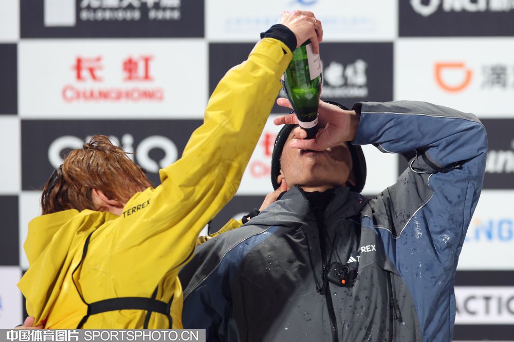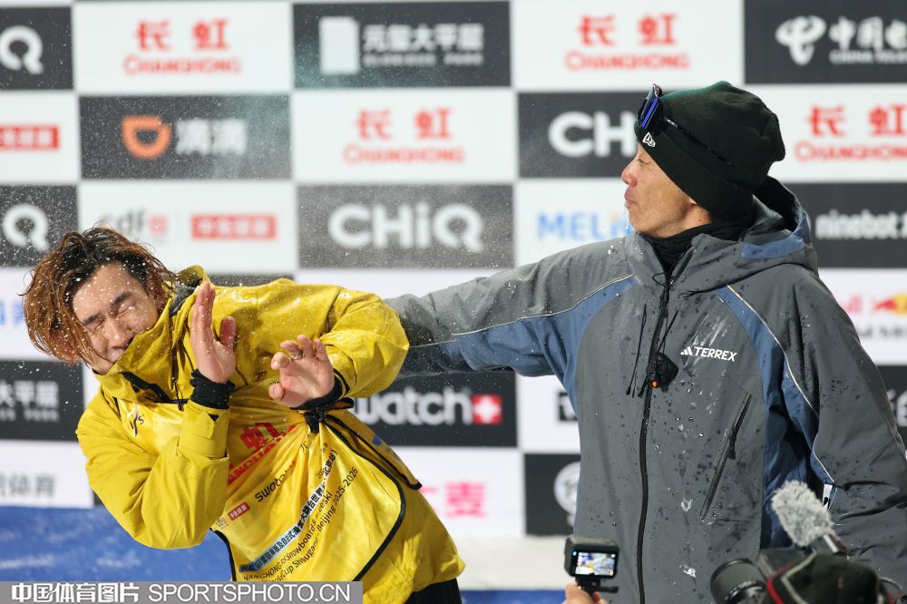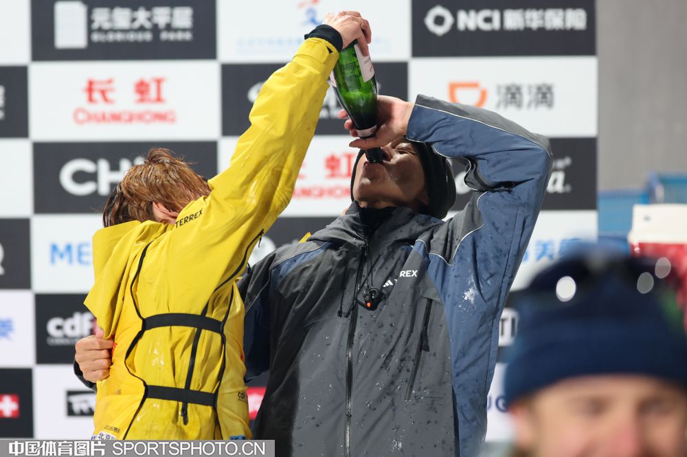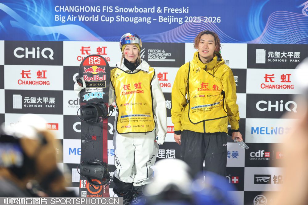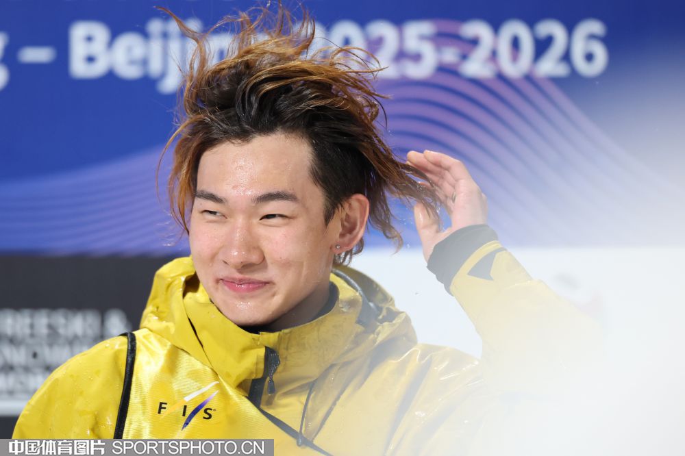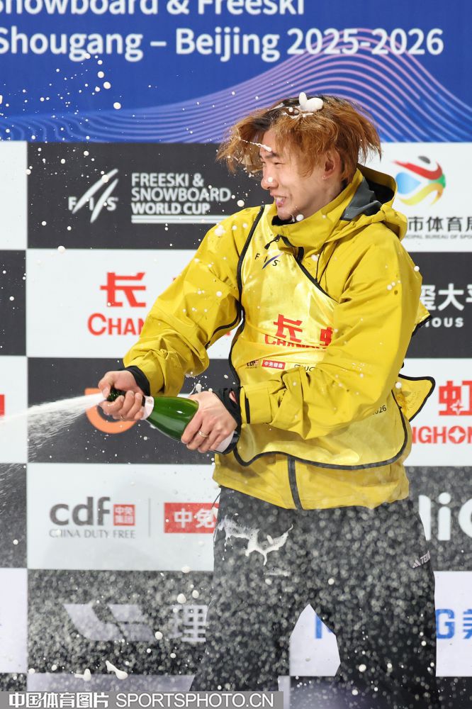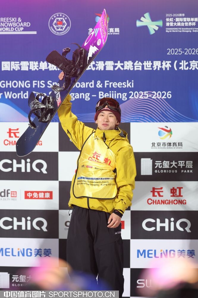 2025年12月6日,2025-2026赛季长虹·国际雪联单板及自由式滑雪大跳台世界杯(北京站)在首钢滑雪大跳台“雪飞天”继续进行。在单板滑雪男子组决赛中,中国选手苏翊鸣以181.00分的成绩获得金牌。队友葛春雨和赵英旭位列第八位和第九位。图为苏翊鸣在颁奖仪式上。(中国体育图片 安灵均 摄)