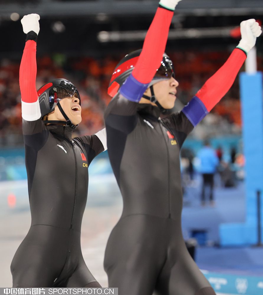 当地时间2月15日,米兰冬奥会速度滑冰男子团体追逐资格赛在米兰速度滑冰馆进行,刘瀚彬、吴宇、李文淏组成的中国队以3分41秒67的成绩获得小组第三,顺利晋级半决赛,创造了中国在该项目冬奥历史最佳战绩。图为刘瀚彬(左)、李文淏庆祝。 (中国体育图片 白宇摄)