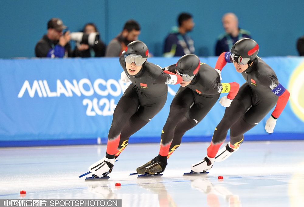 当地时间2月15日,米兰冬奥会速度滑冰男子团体追逐资格赛在米兰速度滑冰馆进行,刘瀚彬、吴宇、李文淏组成的中国队以3分41秒67的成绩获得小组第三,顺利晋级半决赛,创造了中国在该项目冬奥历史最佳战绩。图为刘瀚彬、吴宇、李文淏(从左至右)在比赛中。 (中国体育图片 倪敏哲 摄)
