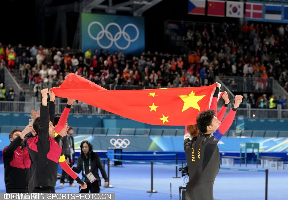 当地时间2月17日,米兰冬奥会速度滑冰男子团体追逐B组决赛在米兰速度滑冰馆举行,由李文淏、吴宇、刘瀚彬、组成的中国队以3分41秒38的成绩战胜荷兰队,获得铜牌。图为中国队队员高举国旗庆祝夺得铜牌。(中国体育图片 白宇 摄)