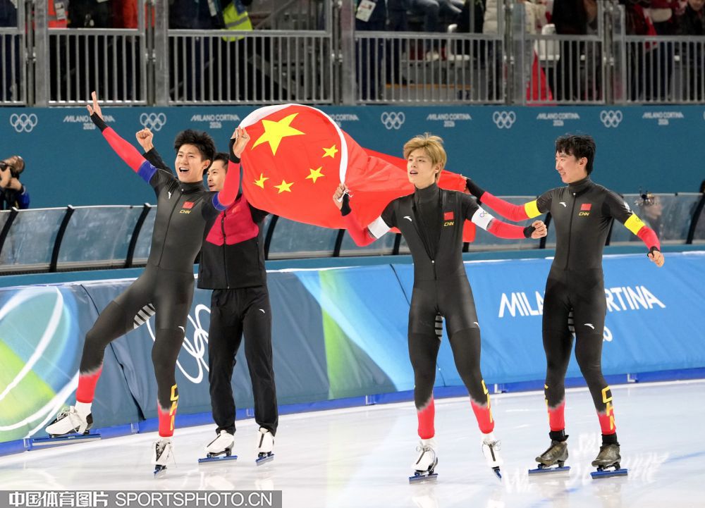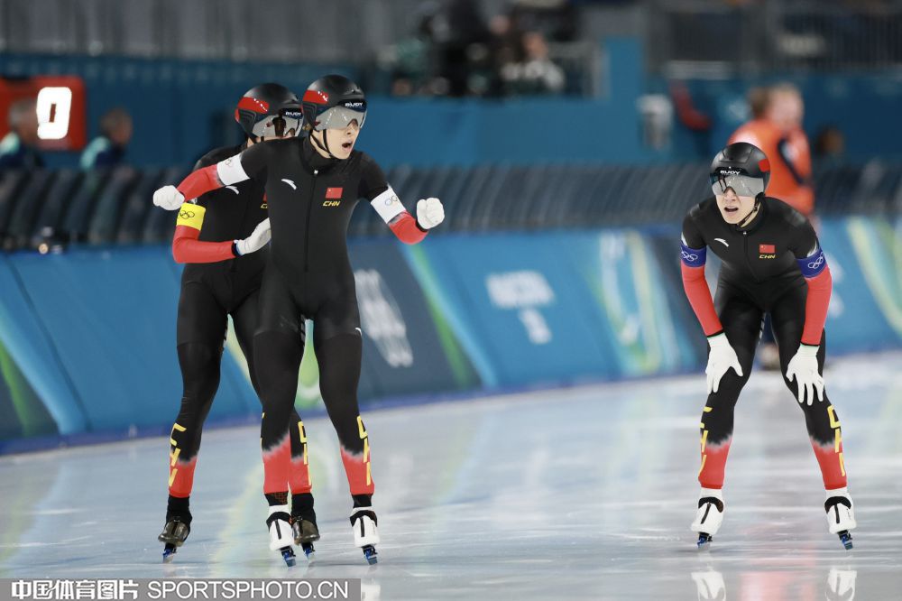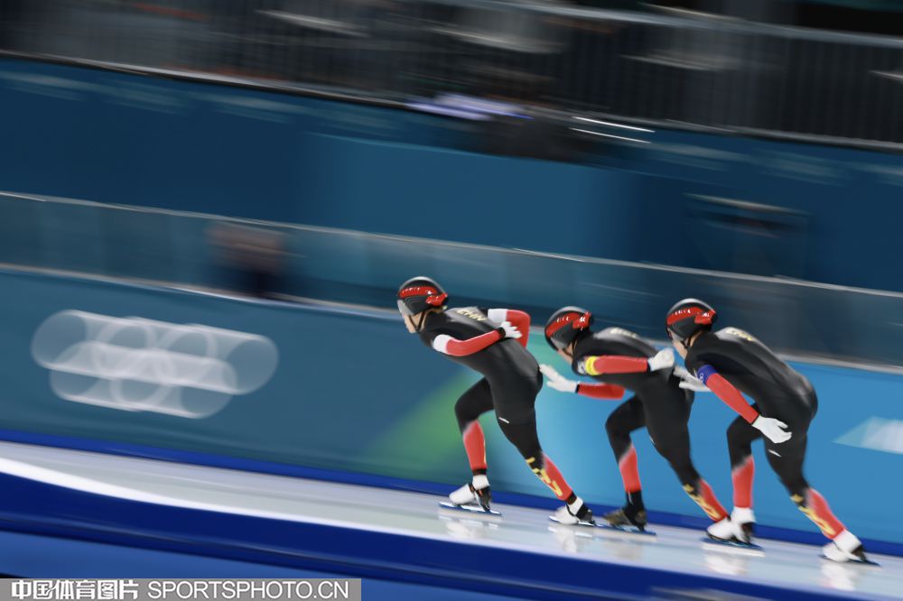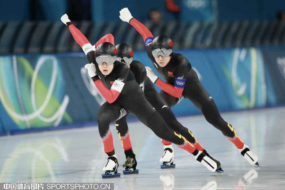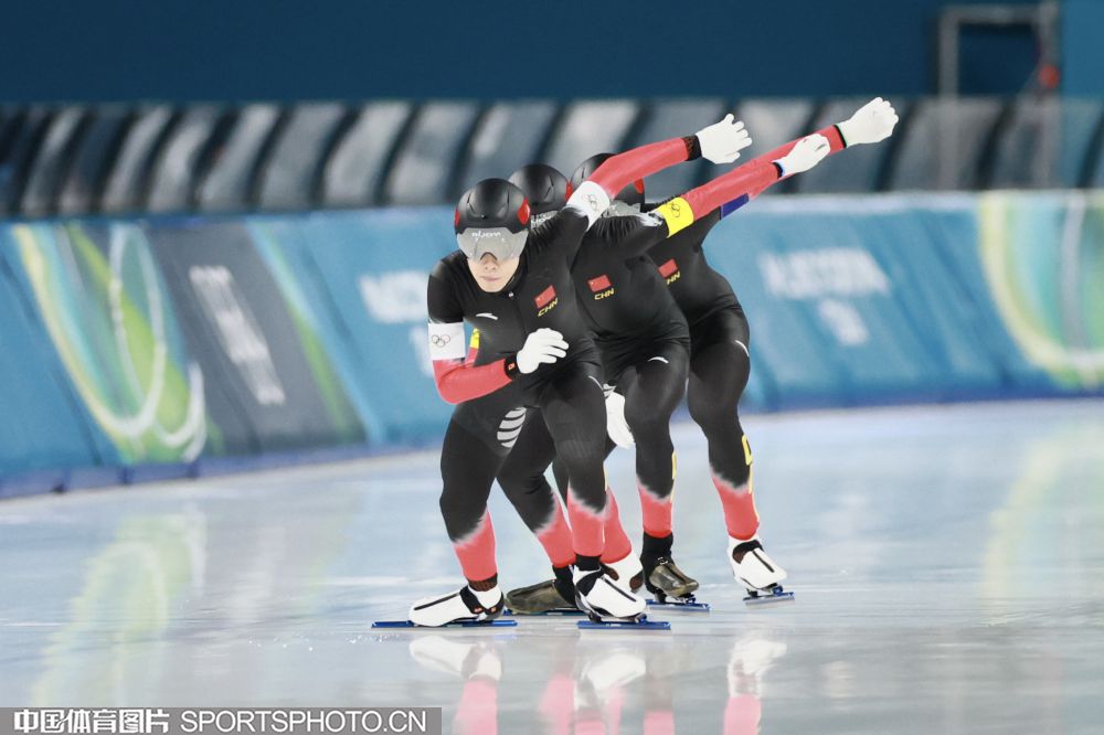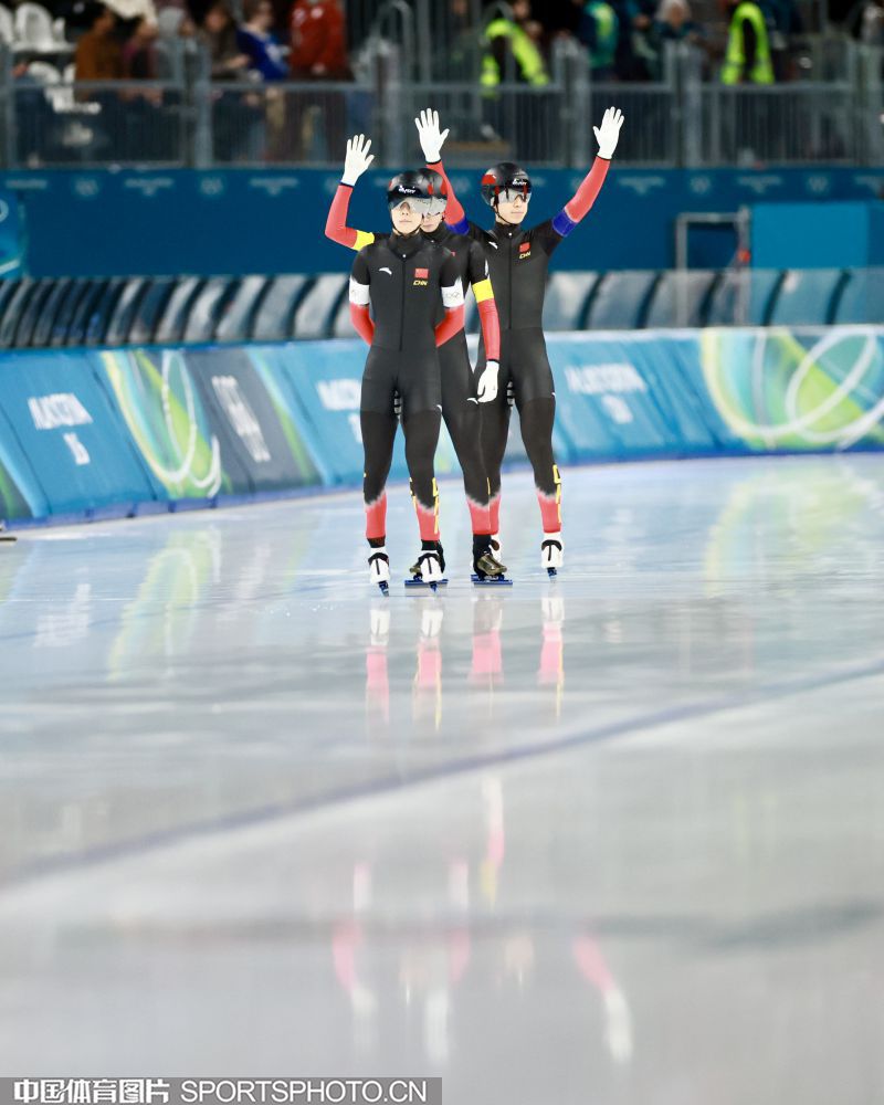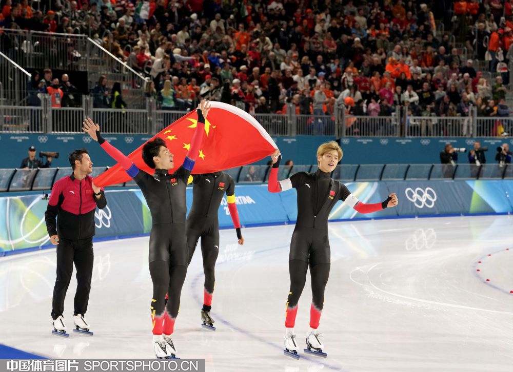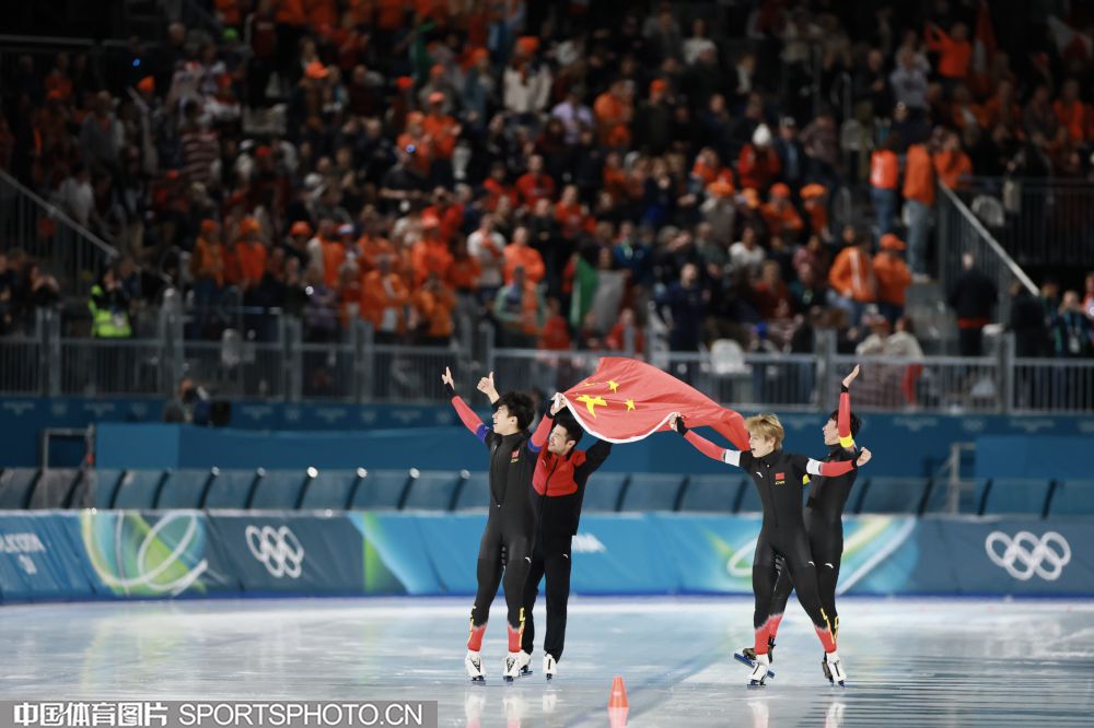 图组名称:米兰冬奥会速度滑冰男子团体追逐B组决赛 中国队获得铜牌