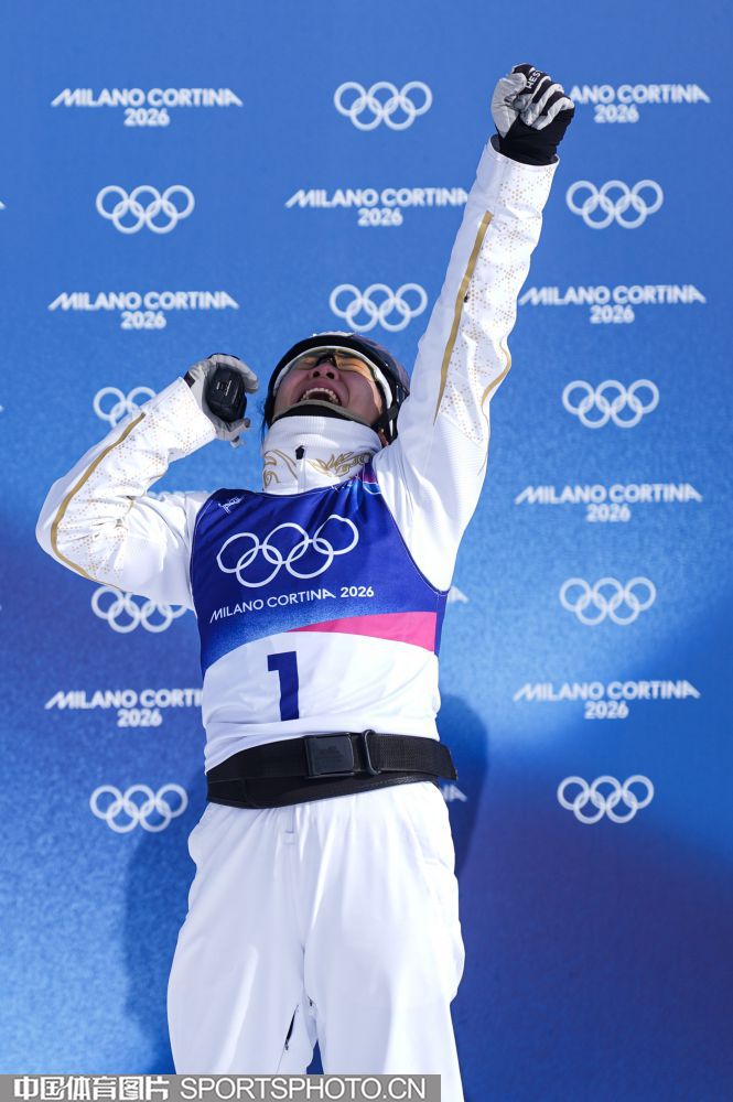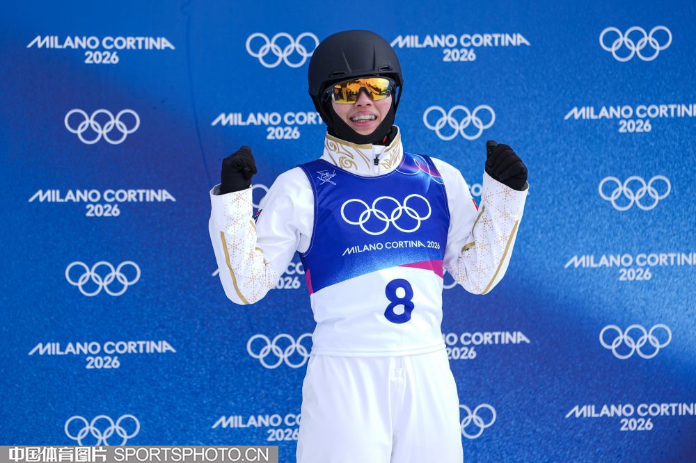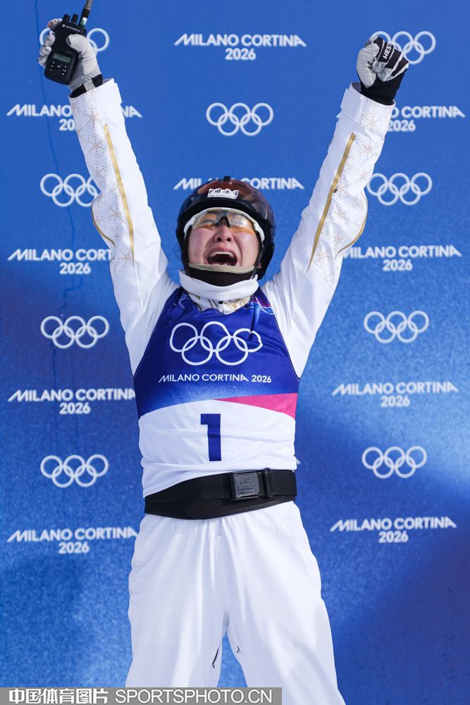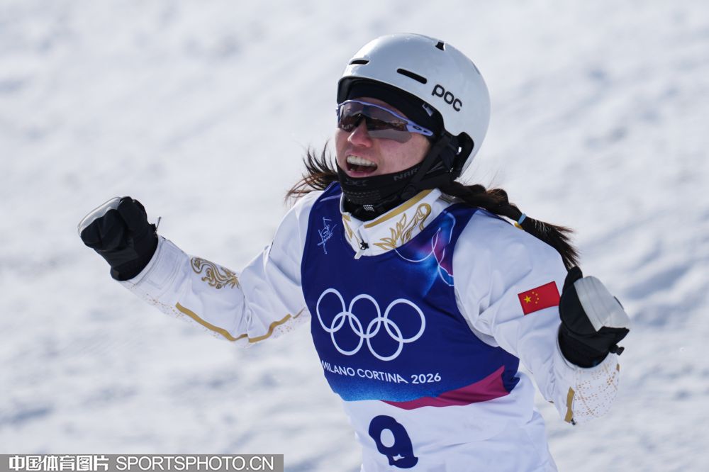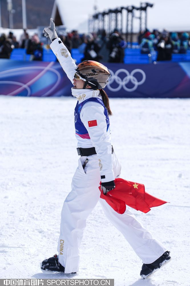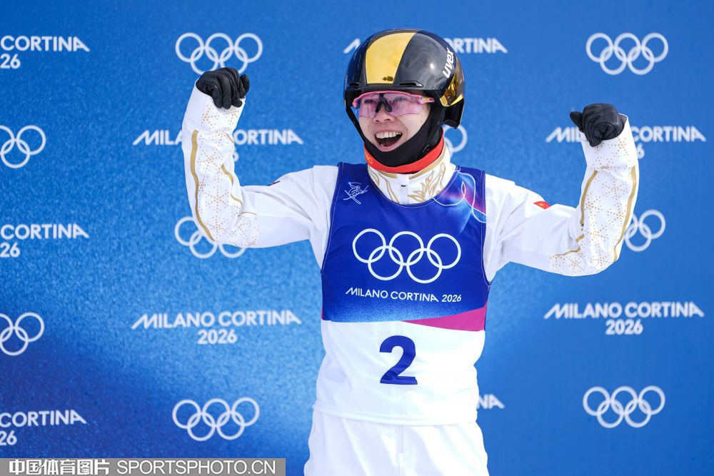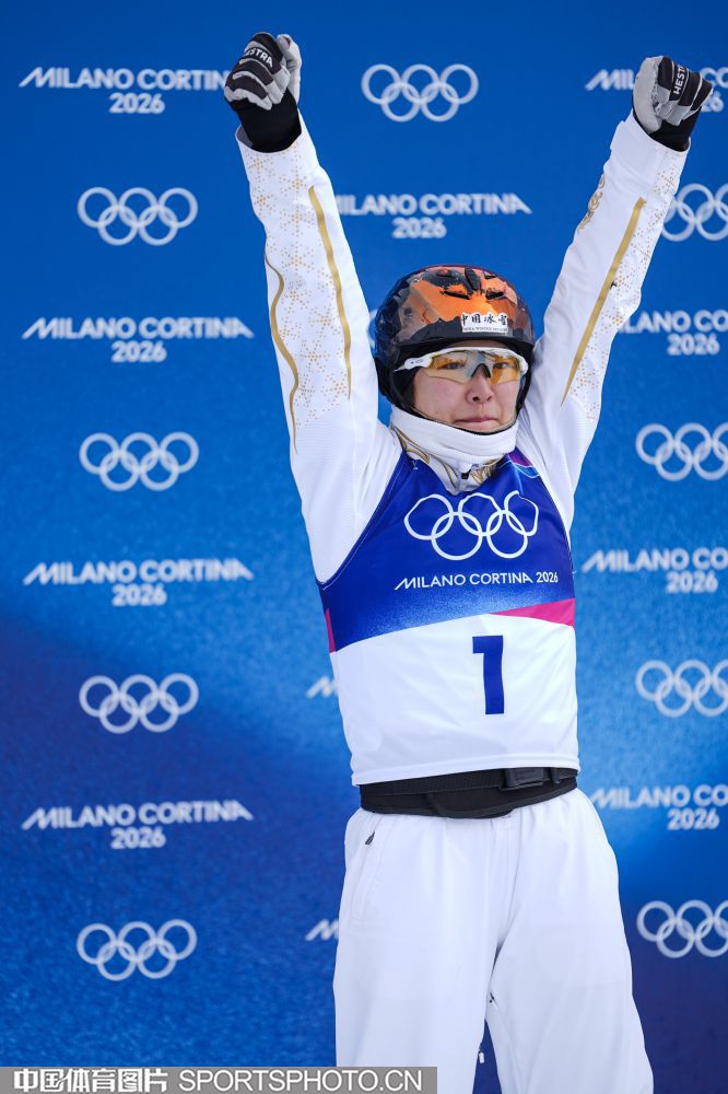 当地时间2月17日,米兰冬奥会自由式滑雪女子空中技巧决赛在利维尼奥空中技巧与雪上技巧公园进行。中国选手徐梦桃以112.90分的成绩实现卫冕,邵琪以101.90分的成绩夺得铜牌,孔凡钰和陈梅婷获得第四名和第九名。图为徐梦桃庆祝夺金。(中国体育图片 魏征 摄)