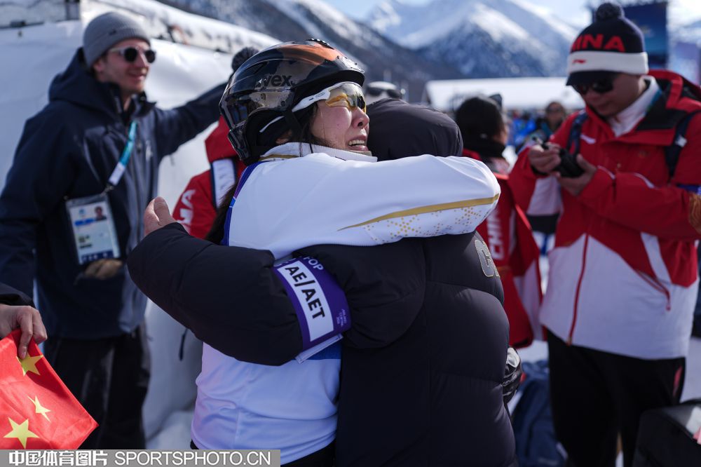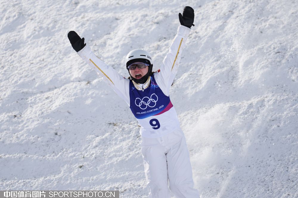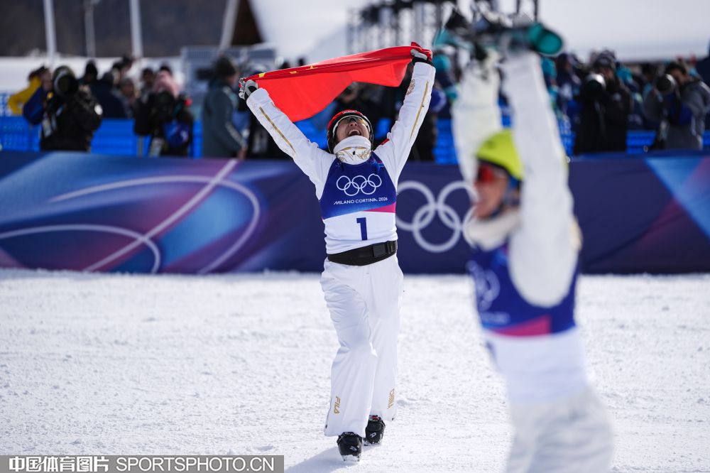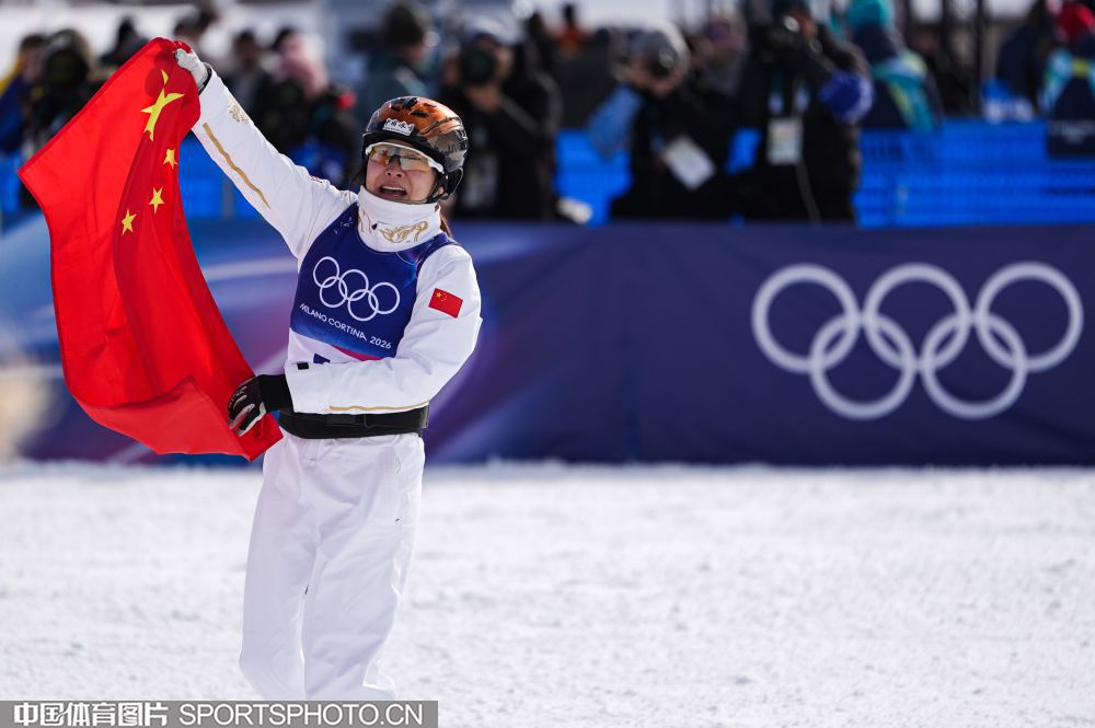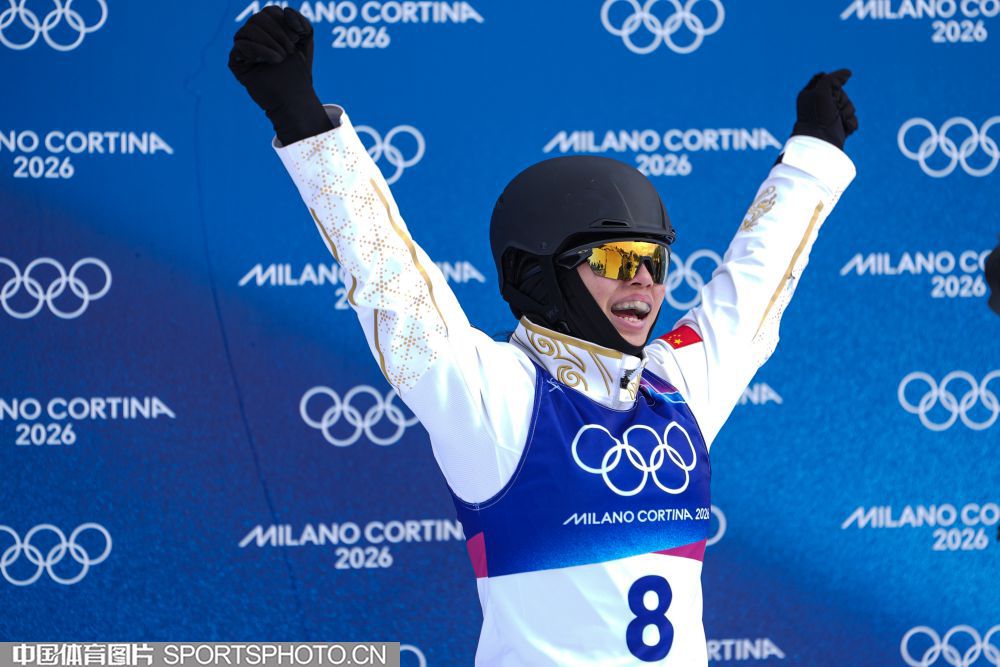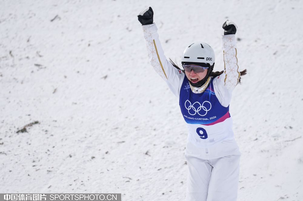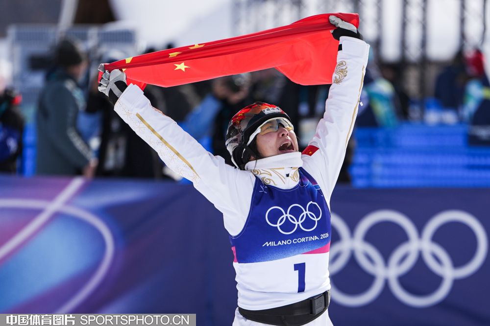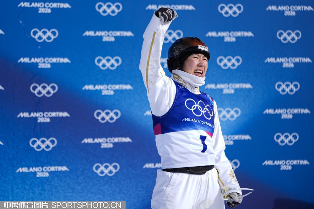 当地时间2月17日,米兰冬奥会自由式滑雪女子空中技巧决赛在利维尼奥空中技巧与雪上技巧公园进行。中国选手徐梦桃以112.90分的成绩实现卫冕,邵琪以101.90分的成绩夺得铜牌,孔凡钰和陈梅婷获得第四名和第九名。图为徐梦桃庆祝夺金。(中国体育图片 魏征 摄)