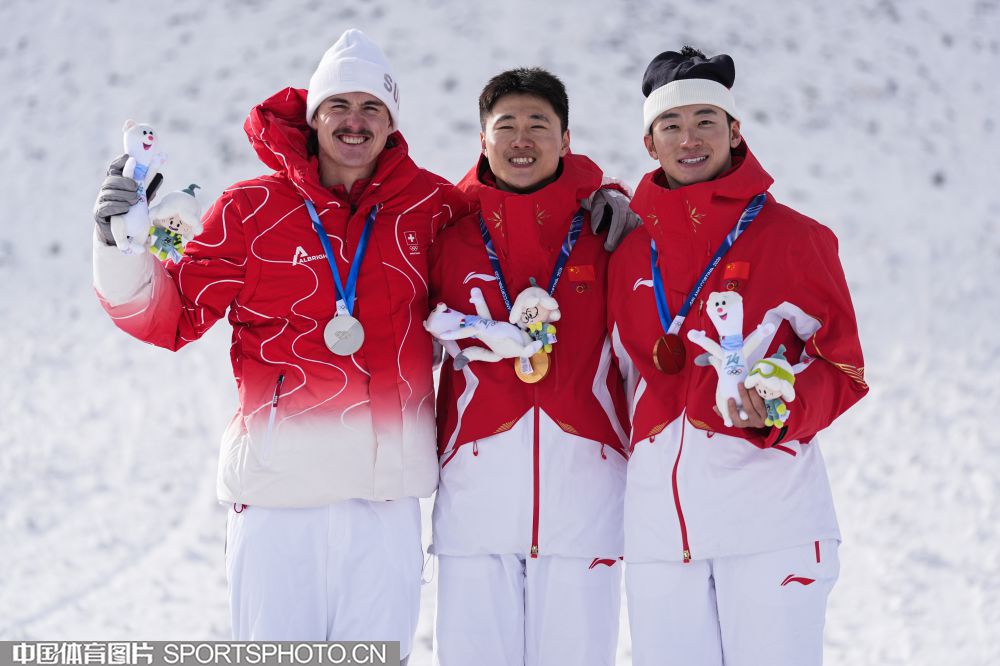 当地时间2月20日,米兰冬奥会自由式滑雪男子空中技巧决赛在利维尼奥空中技巧与雪上技巧公园进行。中国选手王心迪以132.60分获得金牌,李天马以123.93分获得铜牌,孙佳旭和齐广璞获得第四名和第六名。图为(左起)瑞士选手罗特、王心迪、李天马在颁奖仪式上。(中国体育图片 魏征 摄)
