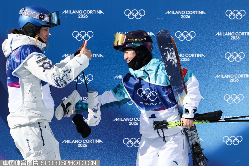 当地时间2月22日,米兰冬奥会自由式滑雪女子U型场地技巧决赛在利维尼奥雪上公园举行。中国选手谷爱凌以94.75分获得冠军,李方慧以93.00分获得银牌,张可欣和刘奕杉分列第六和第九。图为谷爱凌(左)和李方慧。(中国体育图片 安灵均 摄)
