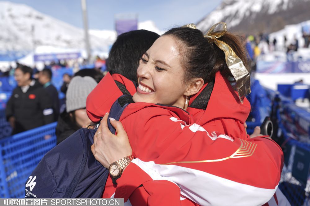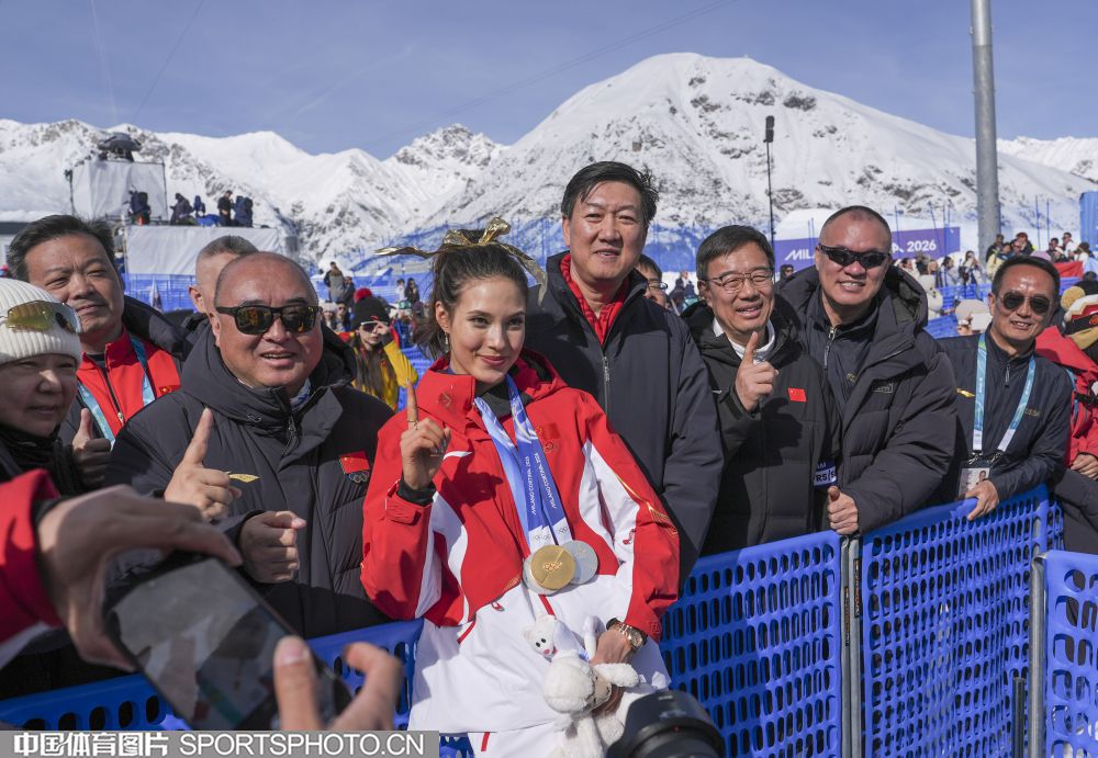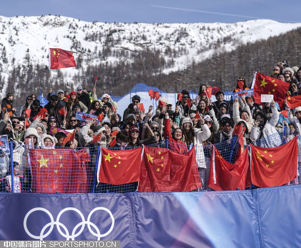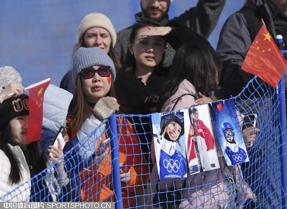 当地时间2月22日,米兰冬奥会自由式滑雪女子U型场地技巧决赛在利维尼奥雪上公园举行。中国选手谷爱凌以94.75分获得冠军,李方慧以93.00分获得银牌,张可欣和刘奕杉分列第六和第九。图为场边观众。(中国体育图片 魏征 摄)