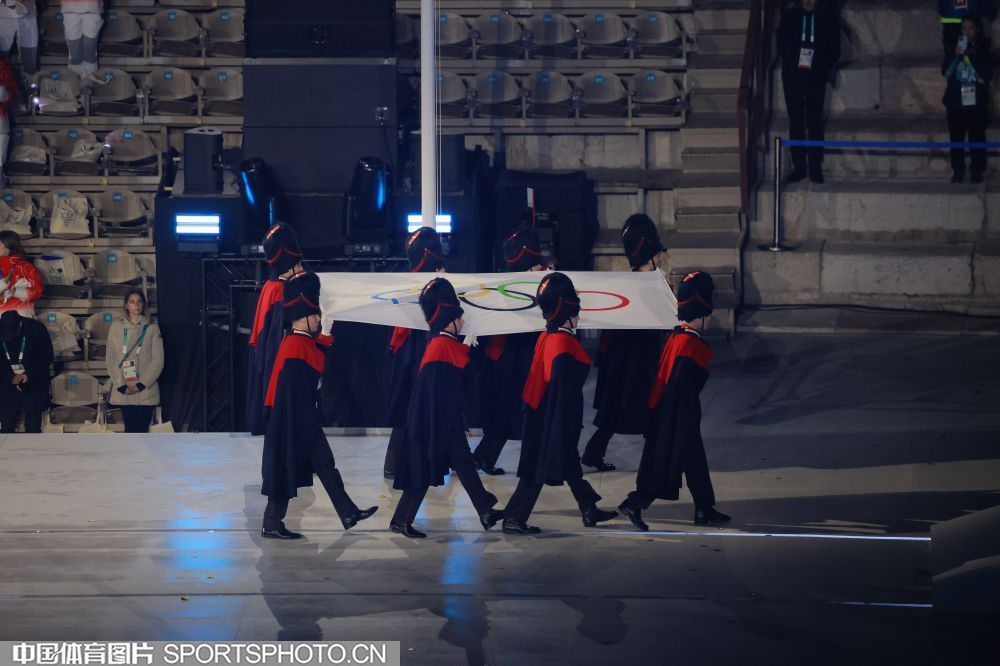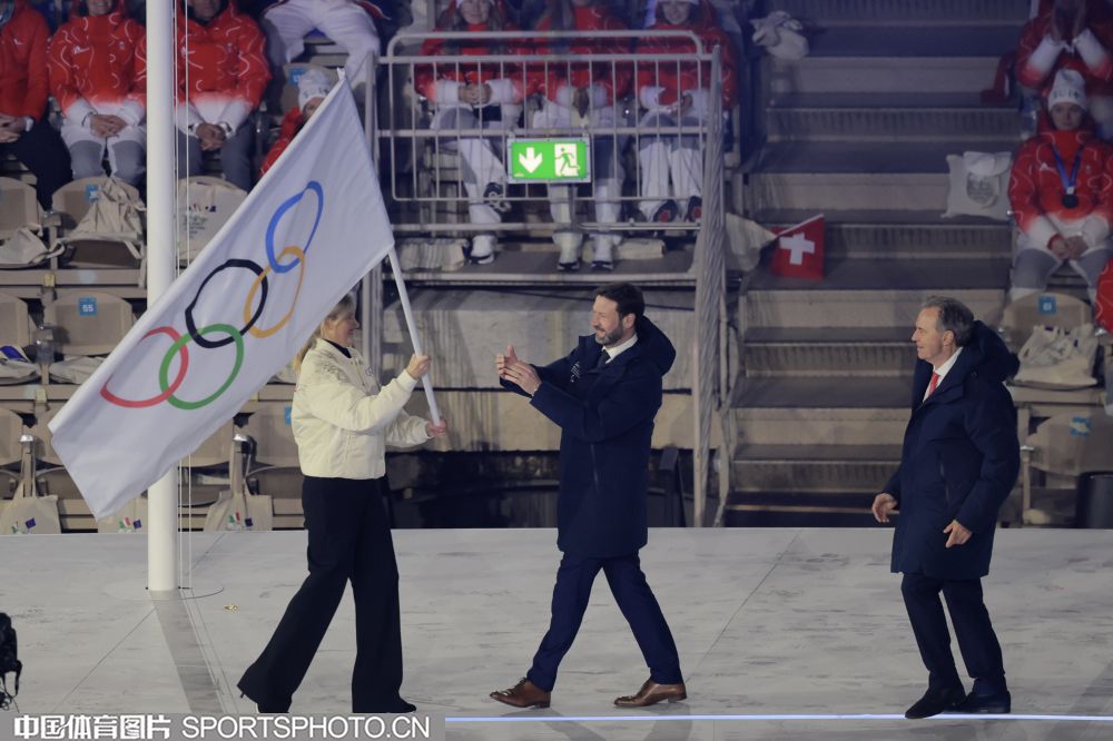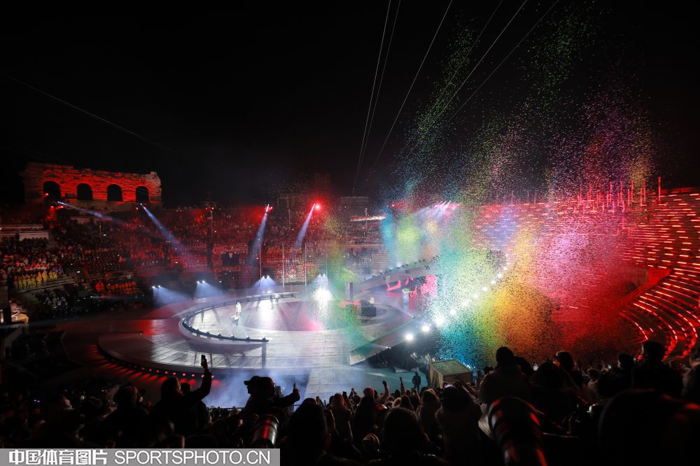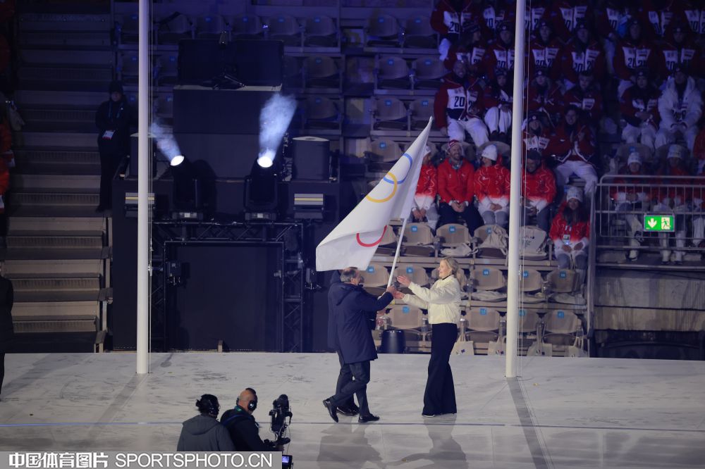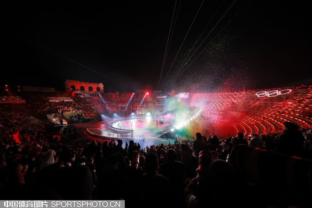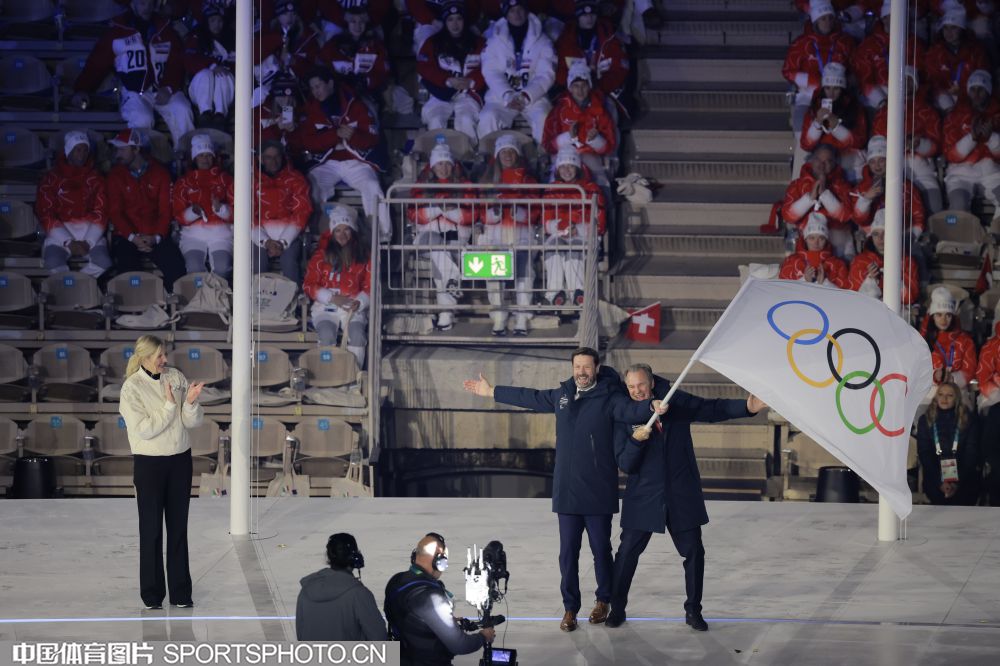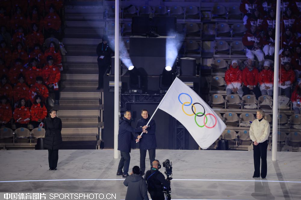 当地时间2月22日晚,2026年米兰-科尔蒂纳冬季奥运会闭幕式在意大利维罗纳圆形竞技场举行。图为米兰市长朱塞佩·萨拉(左)与科尔蒂纳丹佩佐市长詹卢卡·洛伦齐将奥林匹克会旗交还给国际奥委会主席柯丝蒂·考文垂。(中国体育图片 鹿麟 摄)