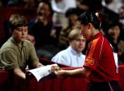 王楠/张怡宁夺得世乒赛女双冠军 王楠为小球迷签名