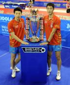 马龙、王励勤与巴克莱英超冠军奖杯合影